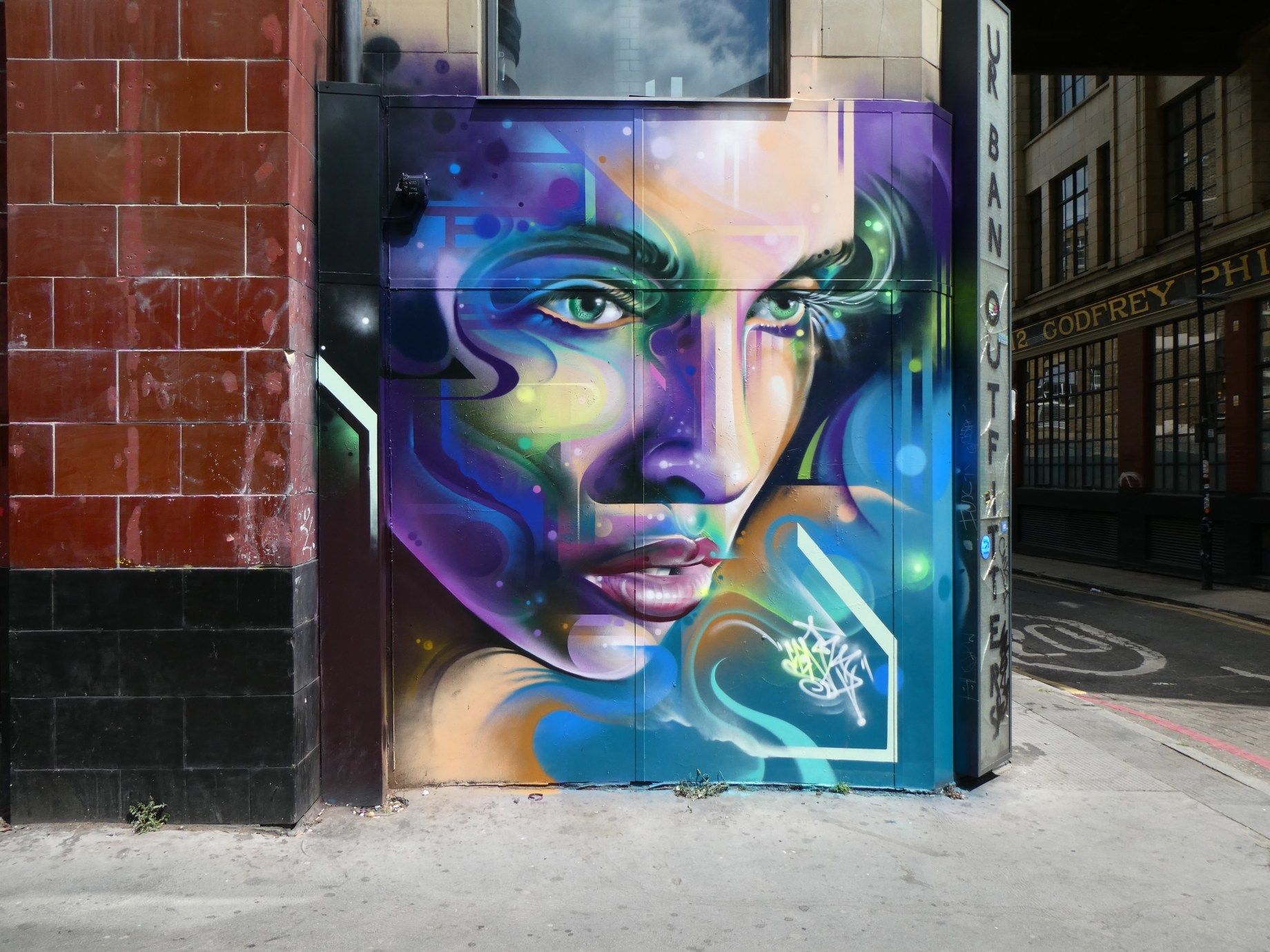Here we taking a look at a recent addition to Brick Lane from Street Artist Mr Cenz placed up last month. It’s been a while since we have had the pleasure of seeing fresh work from Mr Cenz around London so it was quite the treat to spy his latest piece placed up in Commercial Street depicting one of his striking female portraits created in his distinctive sci-fi and cosmic-fueled styling, seemingly imbued with that translucent quality that defines his work and injects his subjects so full of life.