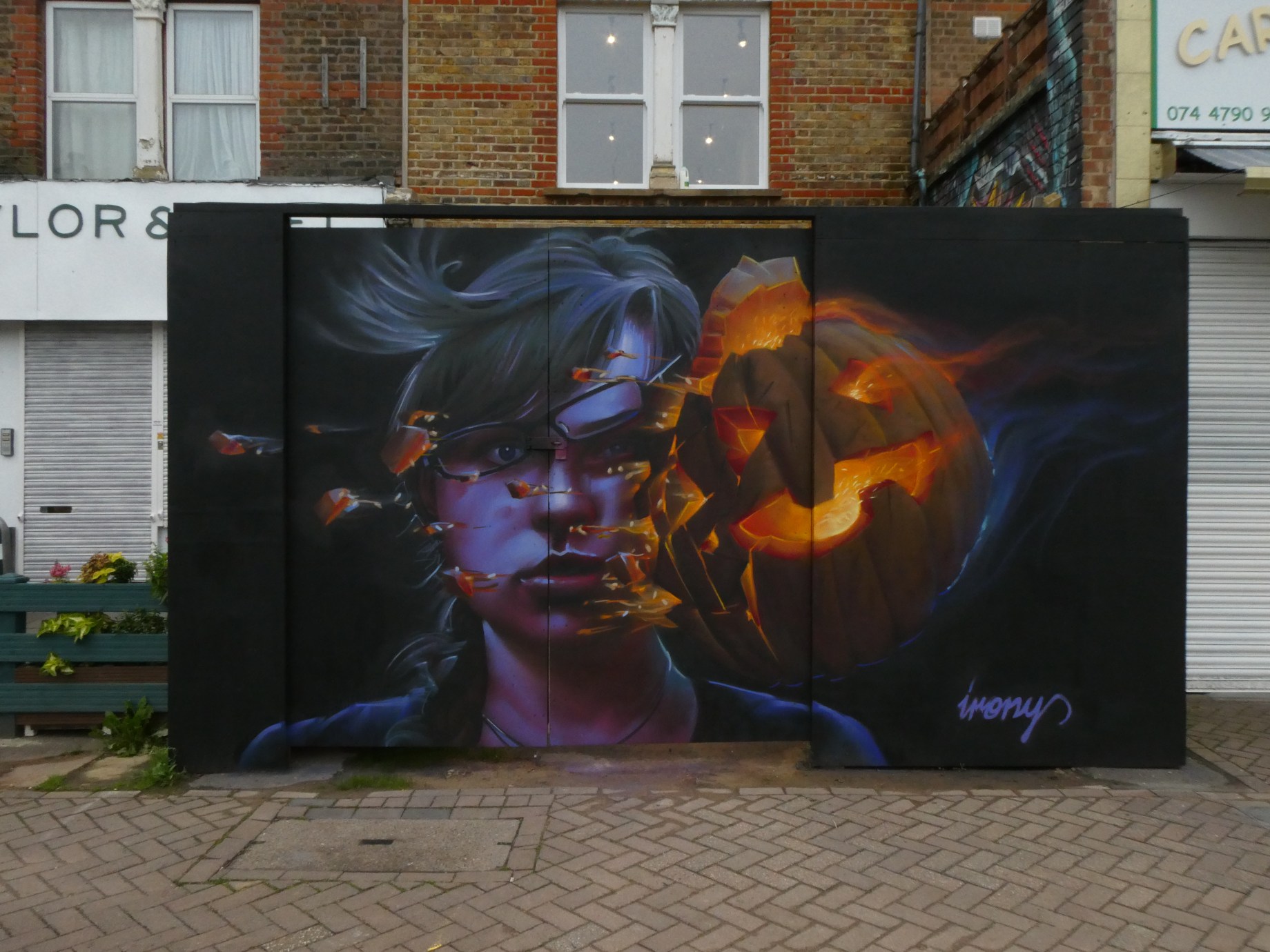 For this post we are taking a look at the first of two recent additions to Penge from Street Artist Irony. The work in question takes on a Halloween vibe and instead of featuring the more traditional ghosts and ghouls themes associated with this time of year it depicts a woman being struck unexpectedly in the face by a flying pumpkin. The work is inspired by a series of photographs by Kajia Straumanis in which the photographer is hit in the face by a range of surprising objects, such as shoes, a ball and a pumpkin. It is the latter image which the photographer granted permission for Irony to use as inspiration for their subject, then just needing the Irony touch to make it their own, infusing that sense of fun that defines much of the artists output. Beyond the fantastic choice of subject we would be remiss if we didn’t mention the incredible level of realism with which Irony injects so much life in to this piece, you really can see the look of dismay on the woman in the painting as things take an unexpected turn, along with the real sense of movement the scene conveys. This fantastic work can be found in Maple Road, Penge and was put up with support from ourselves London Calling Blog.
