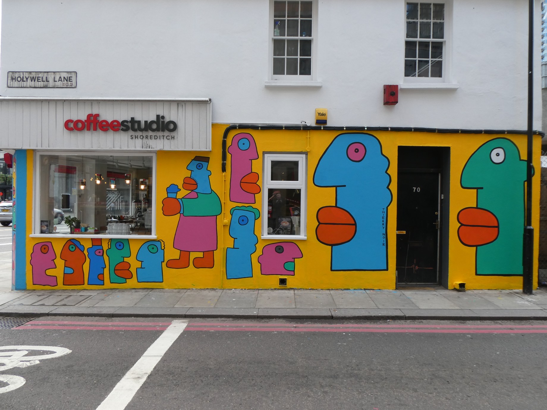 Over the last couple of months French Street Art legend Thierry Noir has painted a series of fresh new artworks around Shoreditch, which have been a pleasure to spy. Thierry Noir who is credited in art history as the first artist to start painting large works on the Berlin Wall in 1984, and proceeded to paint on it virtually every day for the next six years, at a time when such expressions of ‘freedom’ where completely forbidden. The fresh works shared below placed up in Rivington Street and Holywell Lane and depict his trademark illustartive profile characters set to a minimalist and bright colour palette, in a work that is immediately and undeniably Thierry Noir