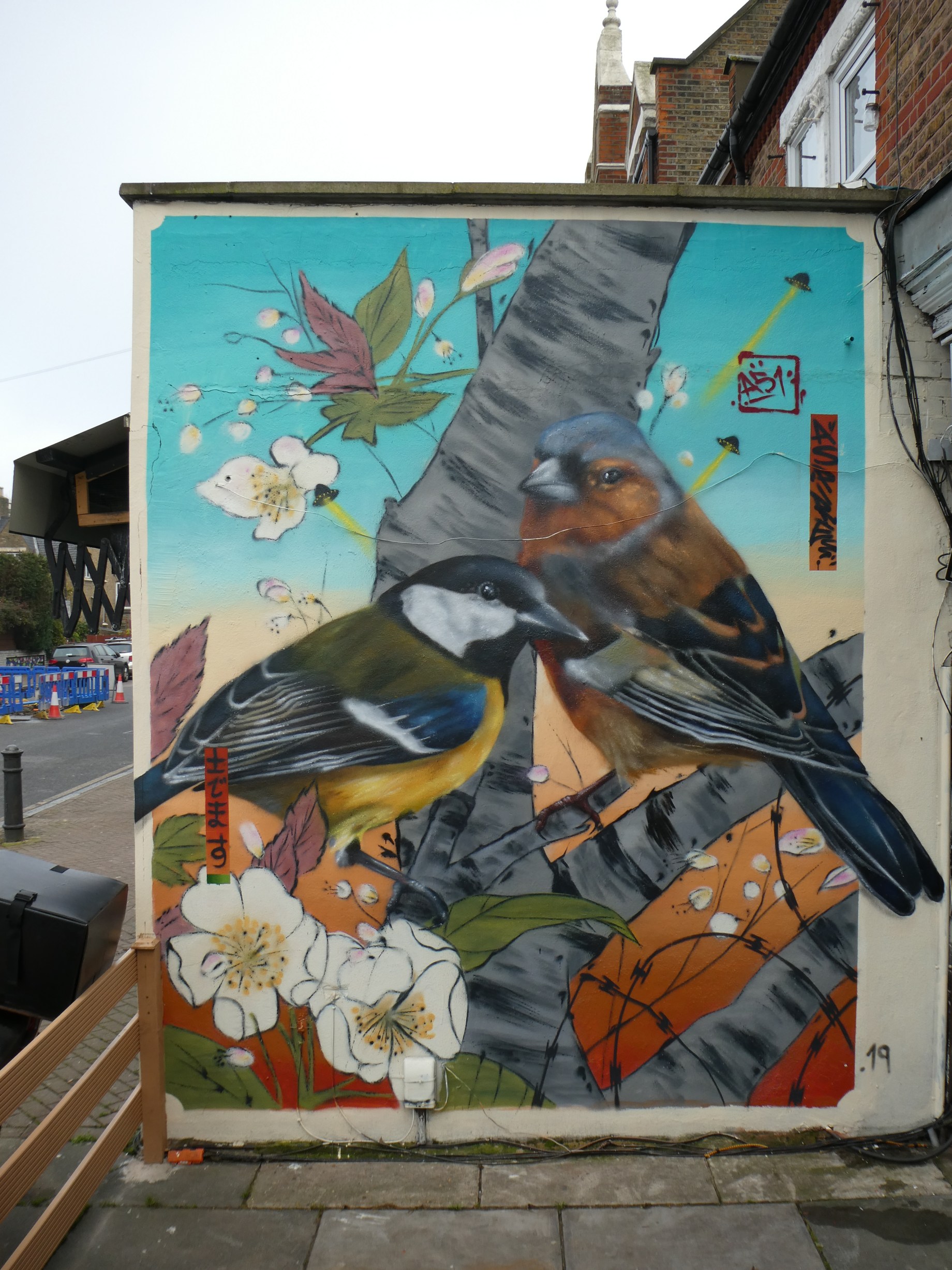Work in Chalkendon Close, Anerley, depicting a Blue Tit. Love the late summer colour scheme that accompanies the striking centrepiece.