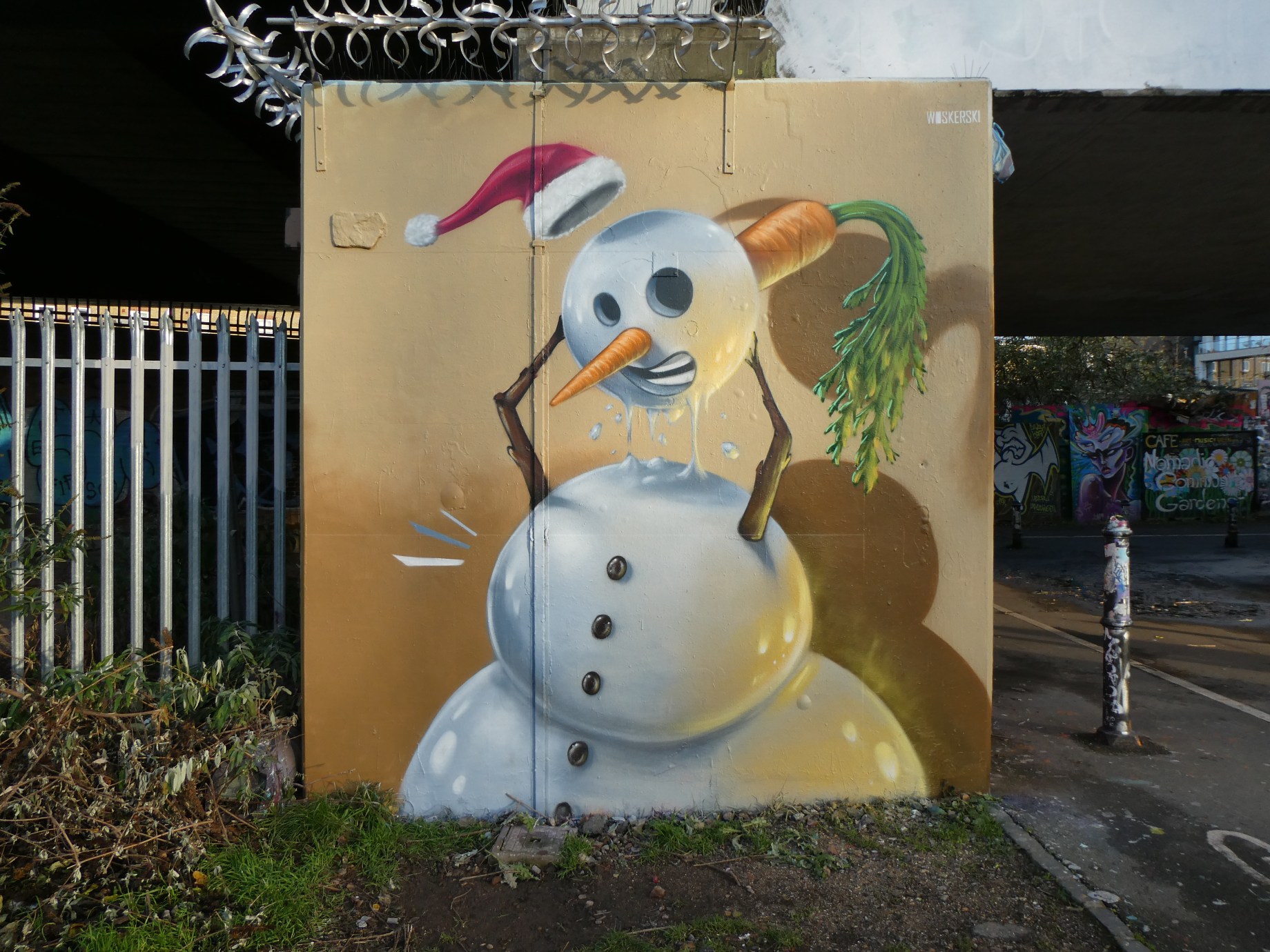 Well it’s that time of year again and we thought we would share a festive themed work from Woskerksi placed up last weekend. Taking to the railway arches outside the Nomadic Community Gardens in Allen Gardens, Brick Lane, Woskerksi set to create a festive work portraying a snowman that is so fed up up with the pressure of the approaching holidays it has decided to ram a carrot through it’s own head, which has then been ripped from its body as if about to launch itself into oblivion. It seems not everything has to be sweet and perfect this time of year and Woskerski has expressed that in true style with this fantastic creation that at first glance is rather sweet, but then conveys a rather dark undercurrent that is so prevalent in much of Woskerksi’s artistic output. This fantastic work can be found in Allen Gardens, Brick Lane.