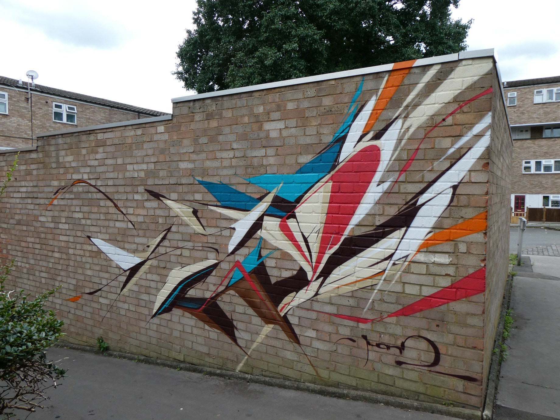 Here we are taking a look at work from Juan2 placed up in St Hugh’s Estate as part of an ongoing project we are working on with the St Hugh’s Community Centre and Clarion. The work in question features futuristic abstract Graffiti work which for Juan2 represents a continuing focus on the form and flow of his work rather than his initial origins in more traditional Graffiti styles focused on lettering. The work certainly generates a lot of energy and movement. What we really love about this particular work is how Juan2’s work looks on the bare brick background, its always exciting to see an artist utilise the natural surface in their work. We of course wish to say a massive thank you to the team at the St Hugh’s Community Centre and Clarion for their help in getting ourselves and the artists involved with this lovely initiative. As well as a really big thank you to Juan2 for coming by to support this initiative and for leaving such a fun artwork in the process. This fantastic work can be found in Chalkendon Close, St Hugh’s Estate and was put up with support from ourselves London Calling Blog for SprayExhibition20.