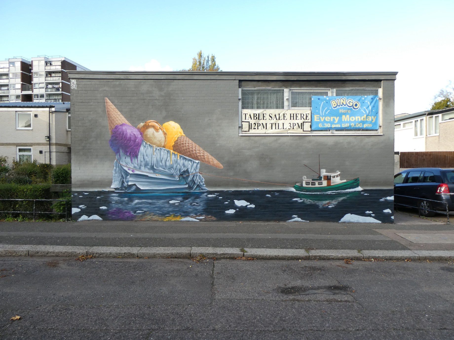 Next up in our long run of catching up with what we have been up to in our corner of South-East London over the recent few months we are taking a look at a superb work from street artist Woskerski and placed up a couple of months ago in Forest Hill. The work in question features a typically surreal and fun subject for this artists output and we have to say we love this quirky scene featuring a tug boat pulling an iceberg topped with melting ice cream cones, offering a humourous look at the very serious issue if global warming. We of course wish to say a massive thank you to the Brampton Residents Association who kindly donated a spot and trusted us to work it. As well as a really big thank you to Woskerski for coming down to support this initiative and for leaving such a vibrant and beautiful artwork in the process. This superb work can be found in Inglemere Road and was put up with support from ourselves London Calling Blog.