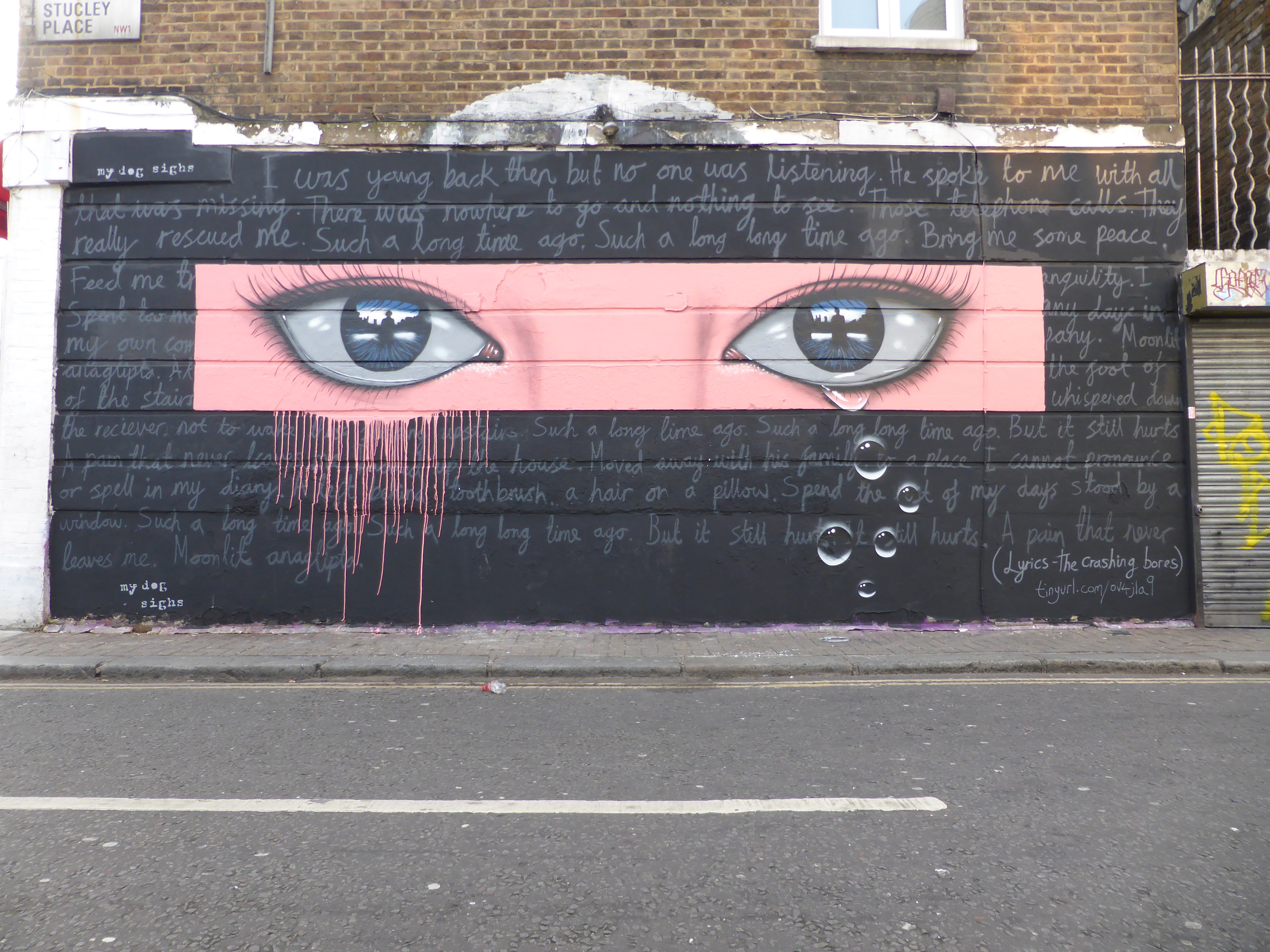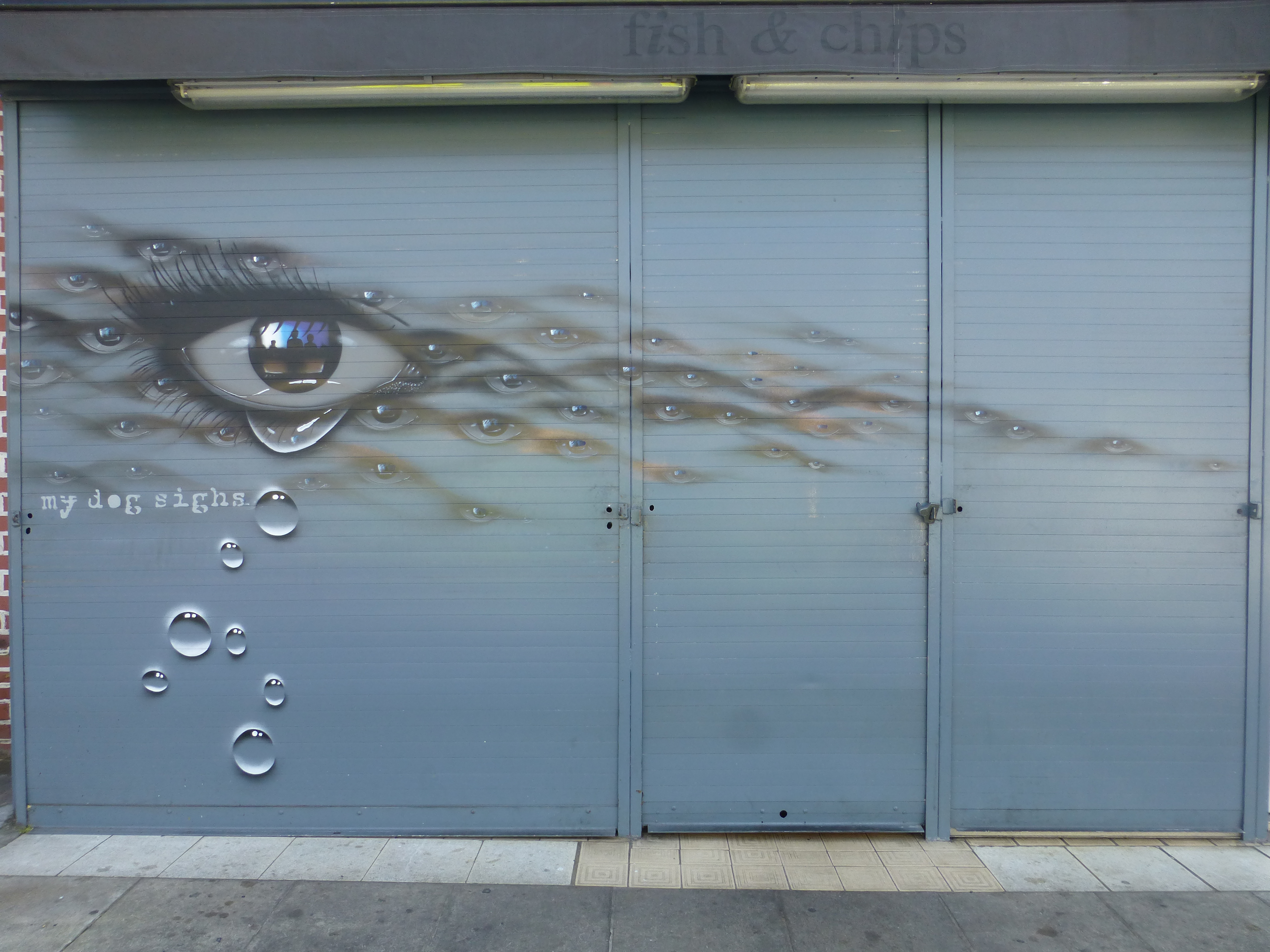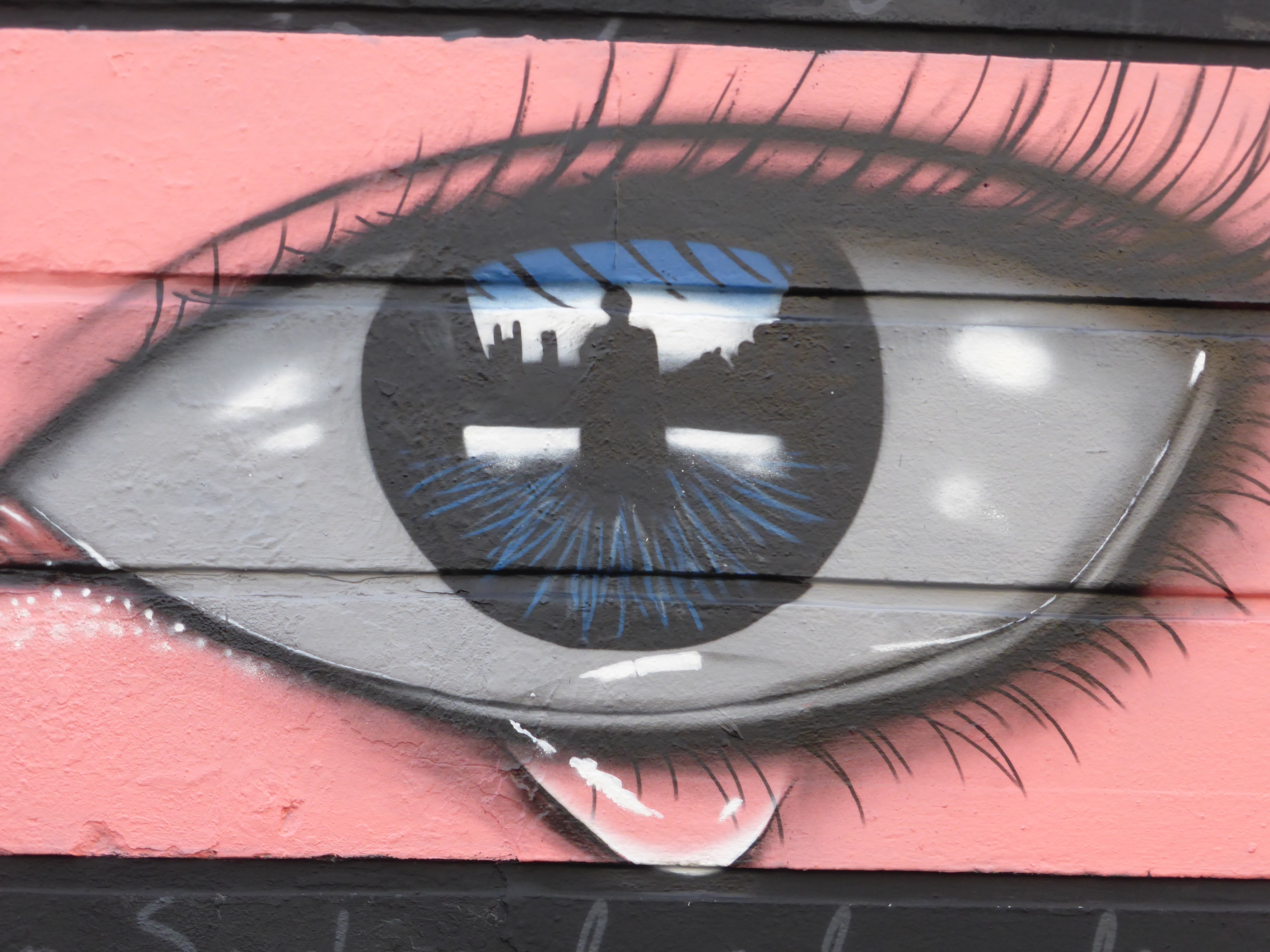In time the artist’s work evolved into the that which we for one know and love now – the cans started for example about 7-8 years ago, which led to painting eyes, with the eyes as a subject transitioning from the cans into new contexts. The eye as a subject is a medium for portraying the three-way relationship between My Dog Sighs, the wall and the viewer. My Dog Sighs paints the wall, in turn the viewer looks at the eye and may posit the question of whose eye is it? Then the reflection in the eye presents a question as to who is in the eye – breaking it down to the subject within a subject. The detail within the eye is always different and offers a new story with each new imagining.