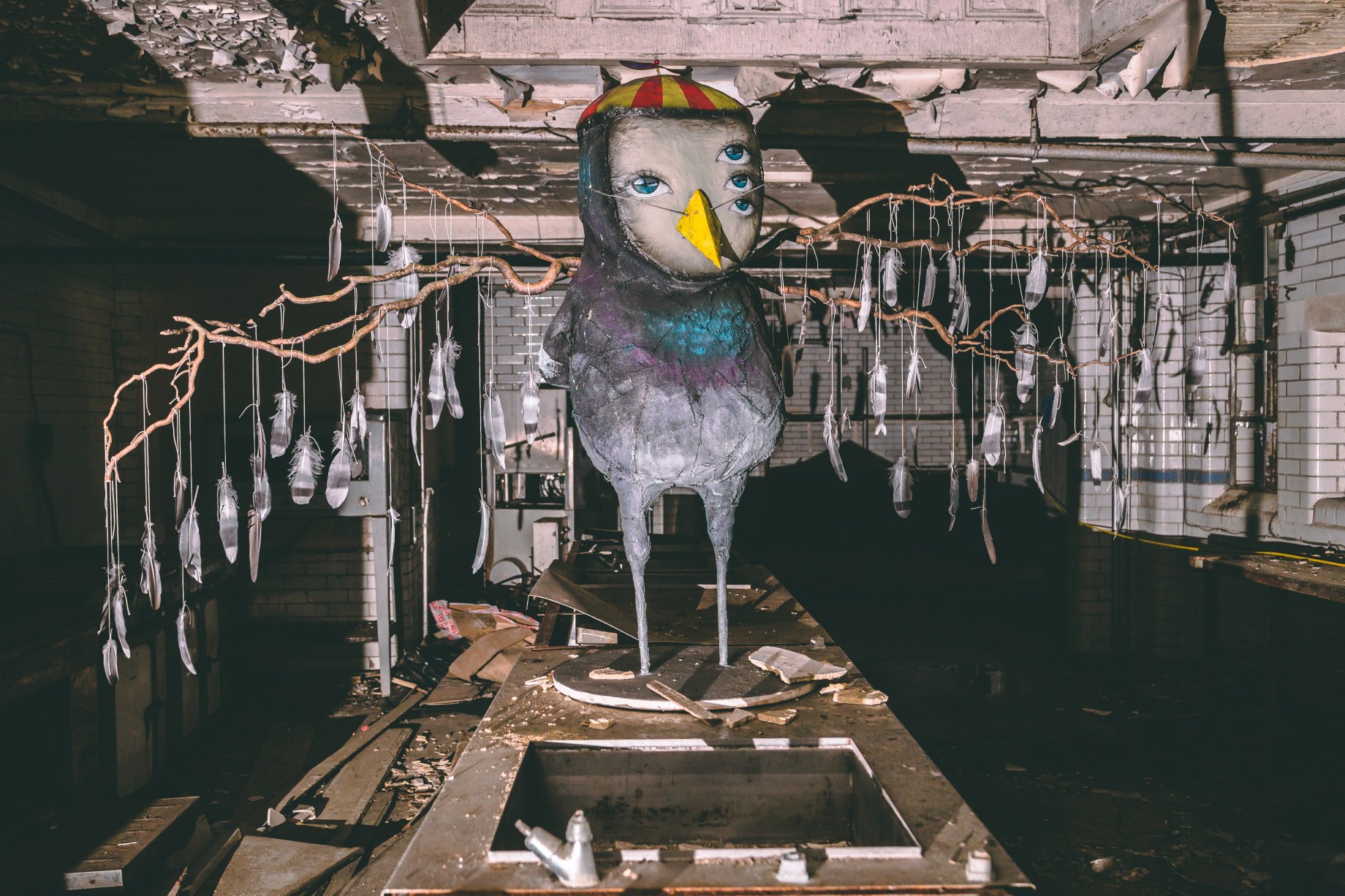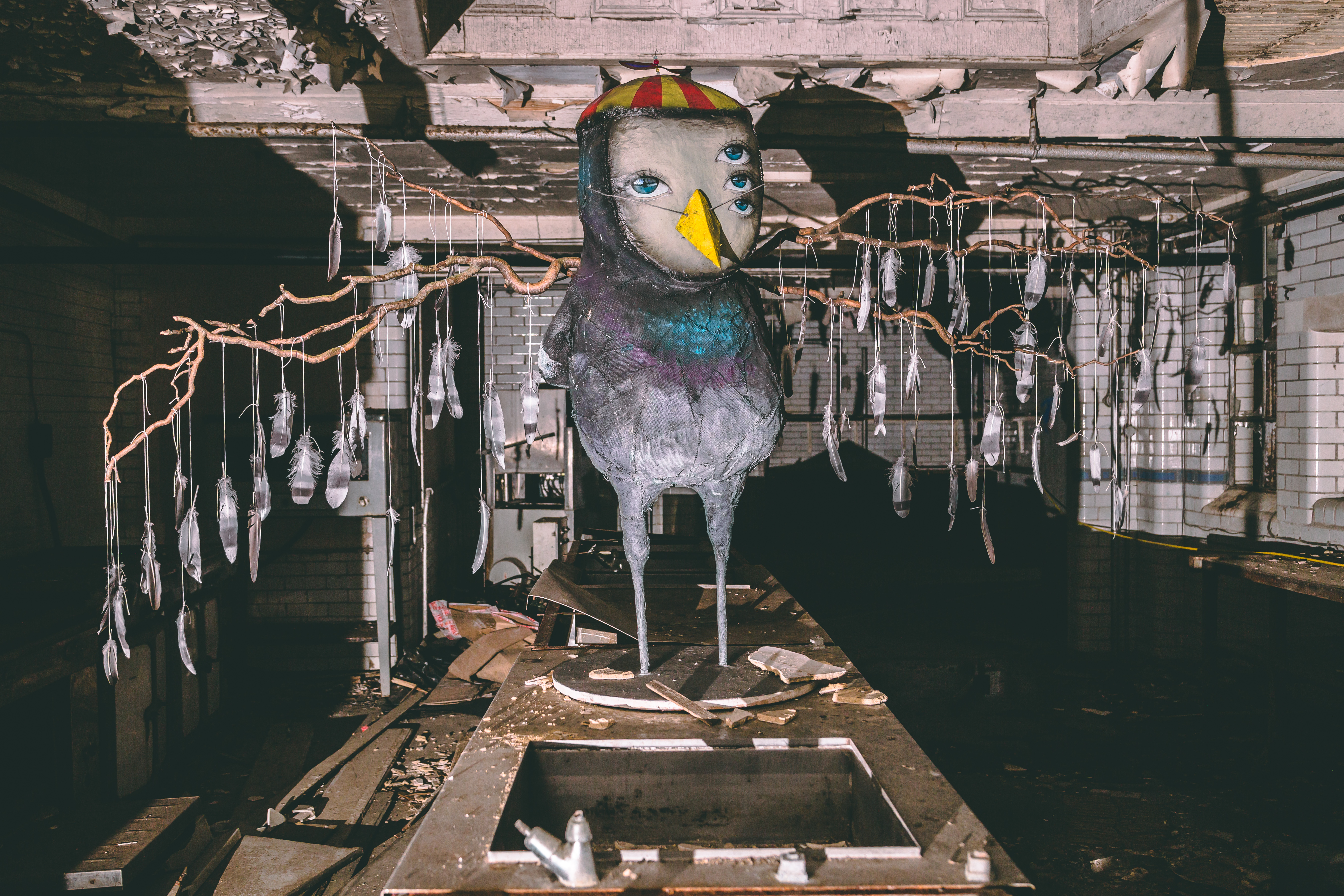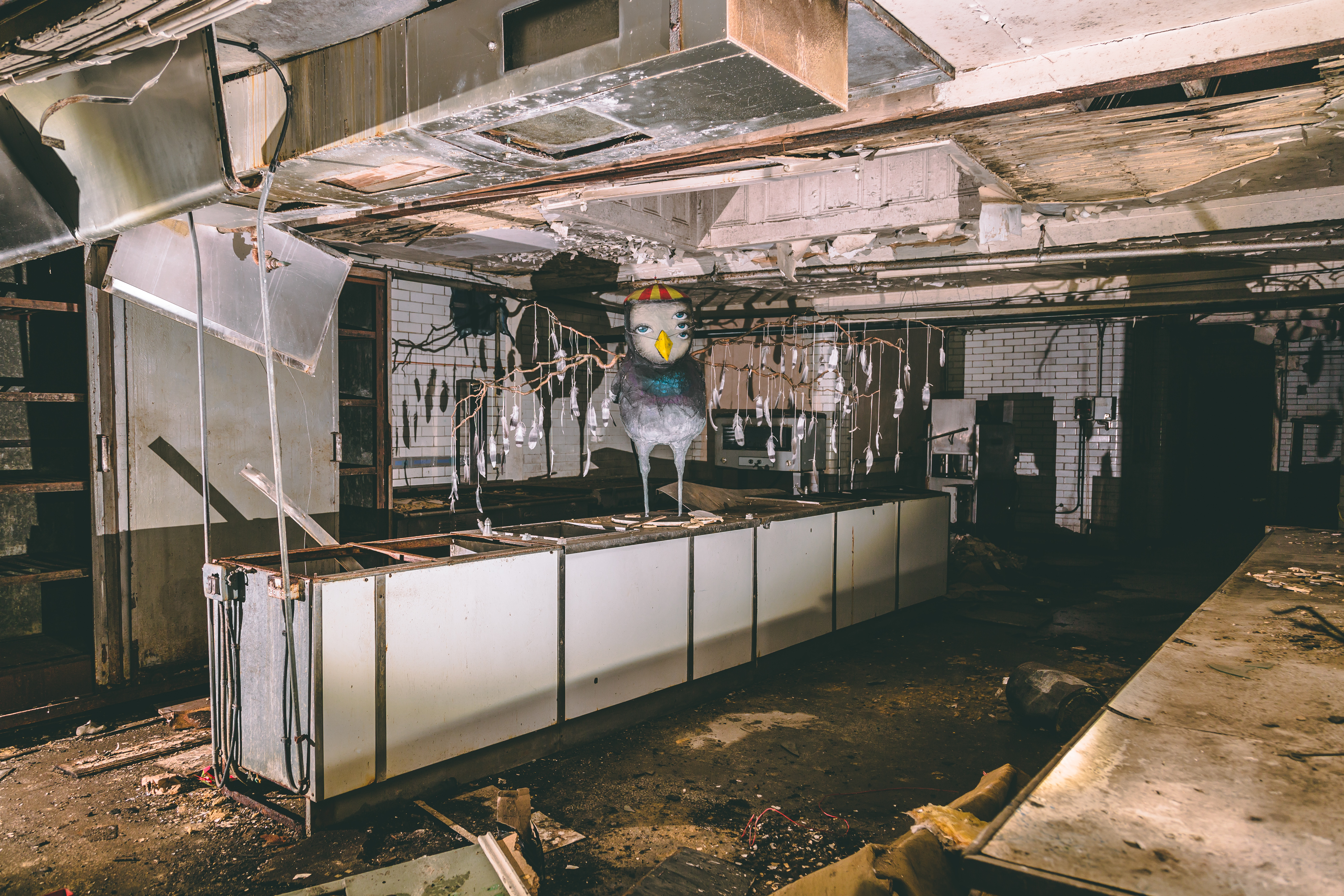 Creating this show in such a space definitely came with some challenges, such as the all consuming darkness of spending so many months without electricity in the building, working under the light from rechargeable lamps. Along with spending months living among a few hundred pigeons, who he shared the space with for six months before having to evict them for health and safety reasons regarding access to the general public once the show goes live. Notably though, once the pigeons were gone the artist missed their presence and company, resulting in the artist creating some Quiet Little Voices pigeons in order to bring them back to the building.