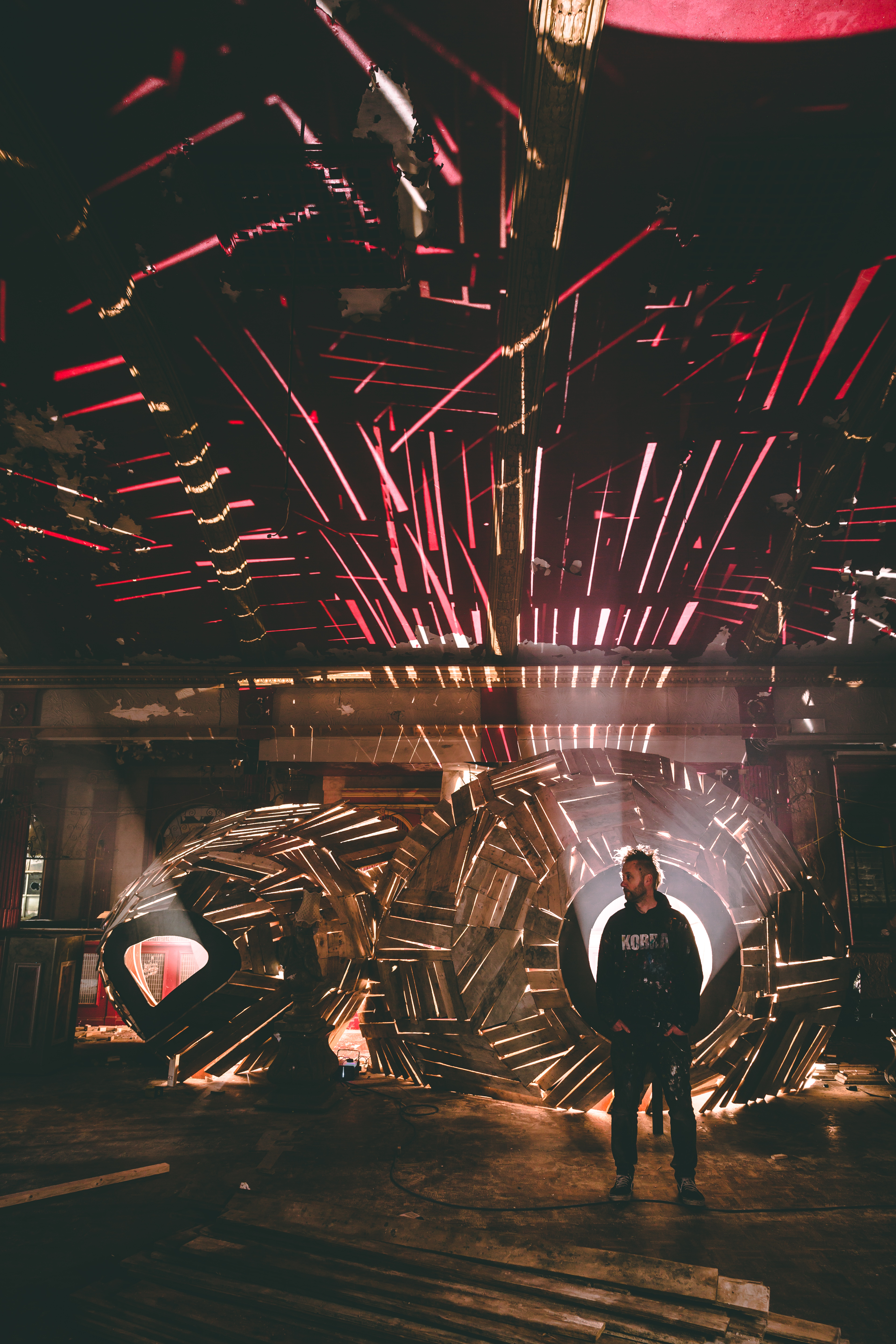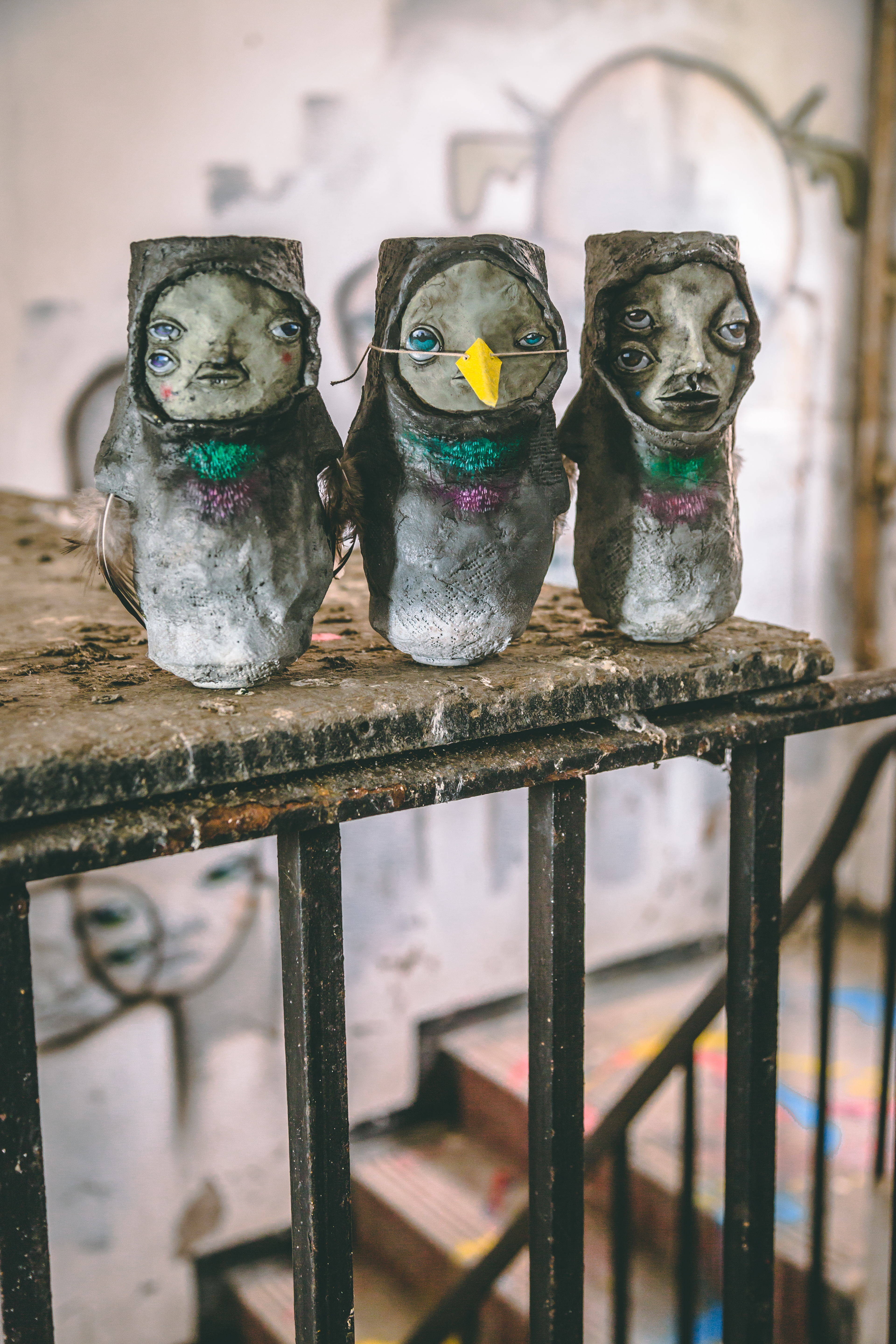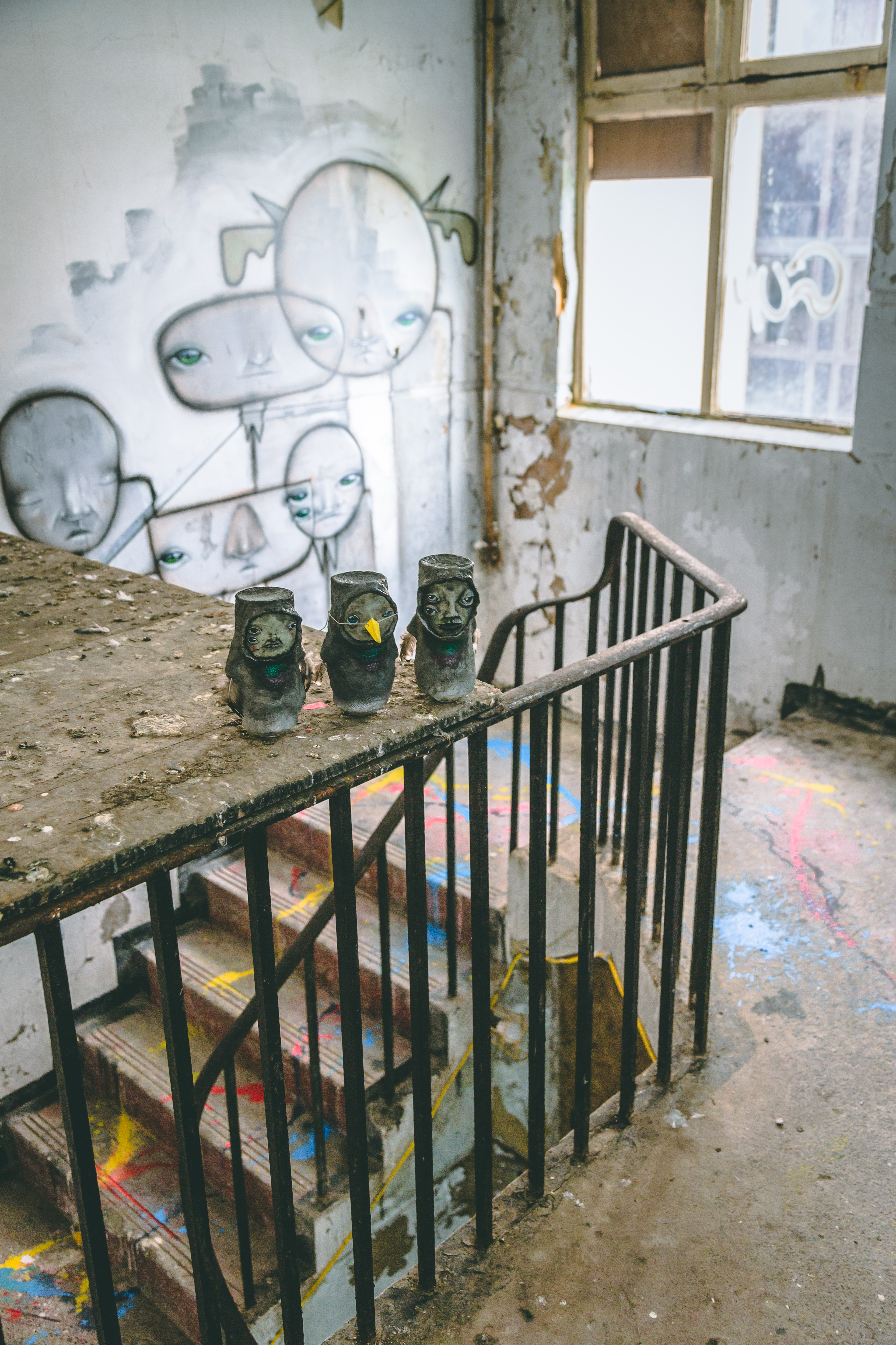 Creating this show in such a space definitely came with some challenges, such as the all consuming darkness of spending so many months without electricity in the building, working under the light from rechargeable lamps. Along with spending months living among a few hundred pigeons, who he shared the space with for six months before having to evict them for health and safety reasons regarding access to the general public once the show goes live. Notably though, once the pigeons were gone the artist missed their presence and company, resulting in the artist creating some Quiet Little Voices pigeons in order to bring them back to the building.