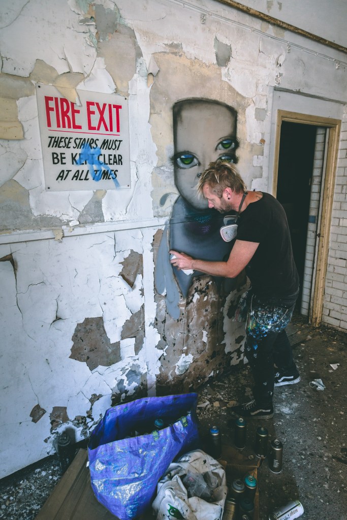 As for the oh so perfect setting for this exhibition, namely an empty building which has laid neglected and abandoned for some four decades, offering that real urban exploration motif that ties in with street art and graffiti hunting. Often the best places for street art are those grimy deadend forgotten places, which this space completely lends itself to. Setting to create an environment that offers new insight into viewing peoples art. The scale of the space available has also allowed the artist to utilise many spaces resulting in the likely possibility that there are probably a number of works that people won’t see – there is a maze for example, with each turn presenting new works. Which most spectacularly of all means that there is so much scope for every individual’s experience of the exhibition to be unique. Playing with the environment is at the heart of street art and that is why this space is so perfect for what has been created.