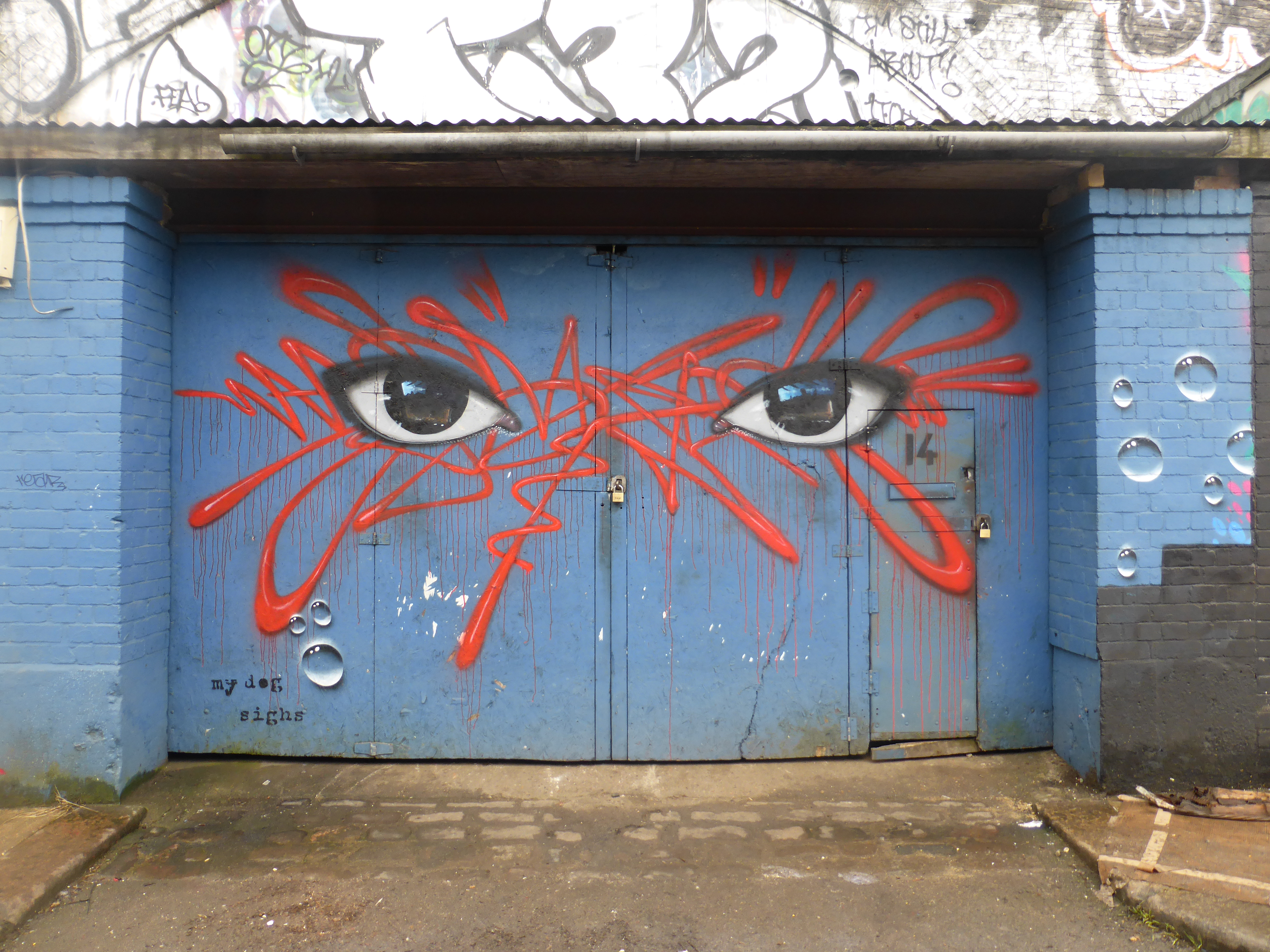 My Dog Sighs’ first venture into public art was through Free Art Friday in 2003 which saw the artist creating artworks and leaving them for the public to notice and should they wish to, take home with them cost-free. This allowed the artist to circumnavigate the illegal aspect of much street art back then – it wasn’t so easy back then to get legal spots or even be asked to paint a wall as it is now – whilst enjoying the fleeting lifespan his art was subjected to, being arguably less permanent than a wall painting, fused with the excitement of people having to find his art. Not being able to afford canvases to give a way every single week the artist then started painting whatever he could find on the street, such as doors and sofas, leading his way to one of his more iconic mediums, that of the can. A skillset that would serve well for the variety of spaces and objects he would later work in his career as a street artist.