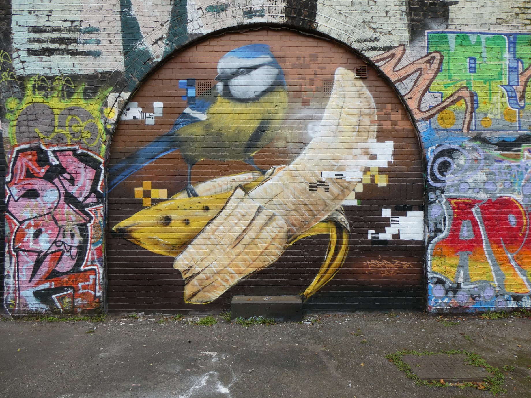Last week saw one of London’s most prolific Street Artists, namely Aspire, take to the legal walls comprising the railway arches near Queens Road Peckham to leave this fantastic artwork that was a most unexpected treat for us on our journey through Peckham. The work in question features Aspire’s a bird, this artist’s most prominent subject, and in this case a Blue Tit, set perched upon a peeled banana. It’s interesting to see the spate of food and consumer items accompanying his feathered subjects over the last year in a number of his artworks, We for one have seen scotch eggs, a tin of baked beans and a tooth brush incorporated into his pieces of late. Always a pleasure to see work from this artist and this superb piece is no exception. This work can be found behind Brimmington Park, Peckham.