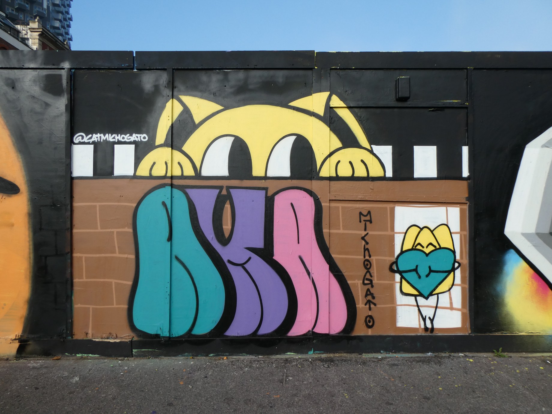 On our recent jaunts around Shoreditch we have been treated to fantastic artworks by Street Artist Micho Gato who has been leaving a series of illustrative works around London of late, featuring her main subject of choice, cartoon cats. Her pieces are so fun upon viewing and for us very much bring a smile to our face when confronted with these cute characters, set peering over objects, such as a book or wall in the instances below. The two works below are a short distance from one another in Shoreditch and well worth hunting down if you are in the area.
