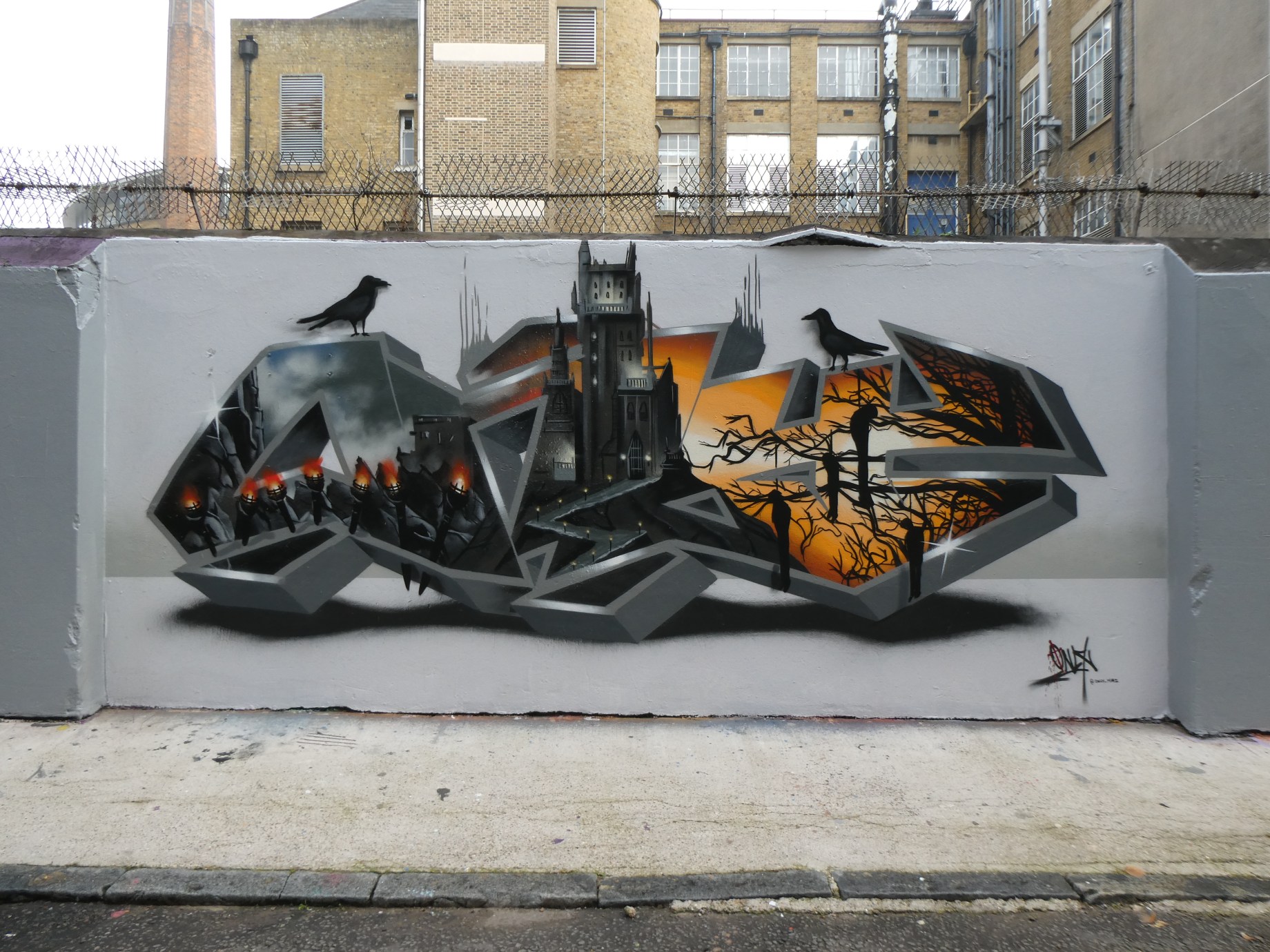 One of the most impressive works we have seen on our latest ventures up to Shoreditch is very much this incredible work placed up around Brick Lane by Graffiti Writer Only. This writer’s latest body of works presents an incredible fusion of traditional graffiti lettering and intensely detailed scenery, creating a piece within a piece dynamic, offering so much to take in and admire within these pieces. This work is titled A Dark Place with the imagery within – and reaching out in parts – presenting a view into another world or a another time with sinister but superbly executed overtones about the piece – as exemplified by the Ravens atop the piece and the silhouettes of hanging bodies on the right. On a whole the depth and details in this work are so incredibly clean, it really has to be seen to be appreciated and we for one eagerly anticipate what this artist brings to London’s streets in the future. This incredible work is located in Corbet Place, Brick Lane.