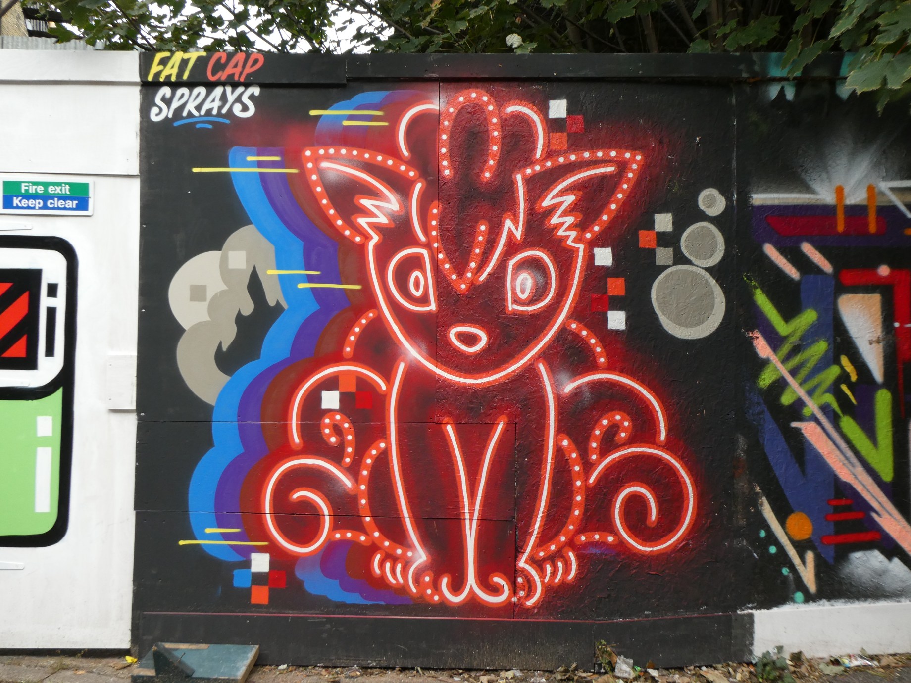 We recently did a blog post on a series of works we sighted from Fat Cap Sprays around Shoreditch (covered here) and now we are taking a look at a superb series of works from this exceptionally prolific artist around Hackney. Each work offers the artist’s own take on neon style depictions of iconic cartoon and computer game characters. It’s been a pleasure get acquainted with Fat Cap Sprays’ art this year and the works below show why, so we couldn’t believe our luck when travelling around Hackney at the weekend we found a fantastic seven pieces to enjoy.