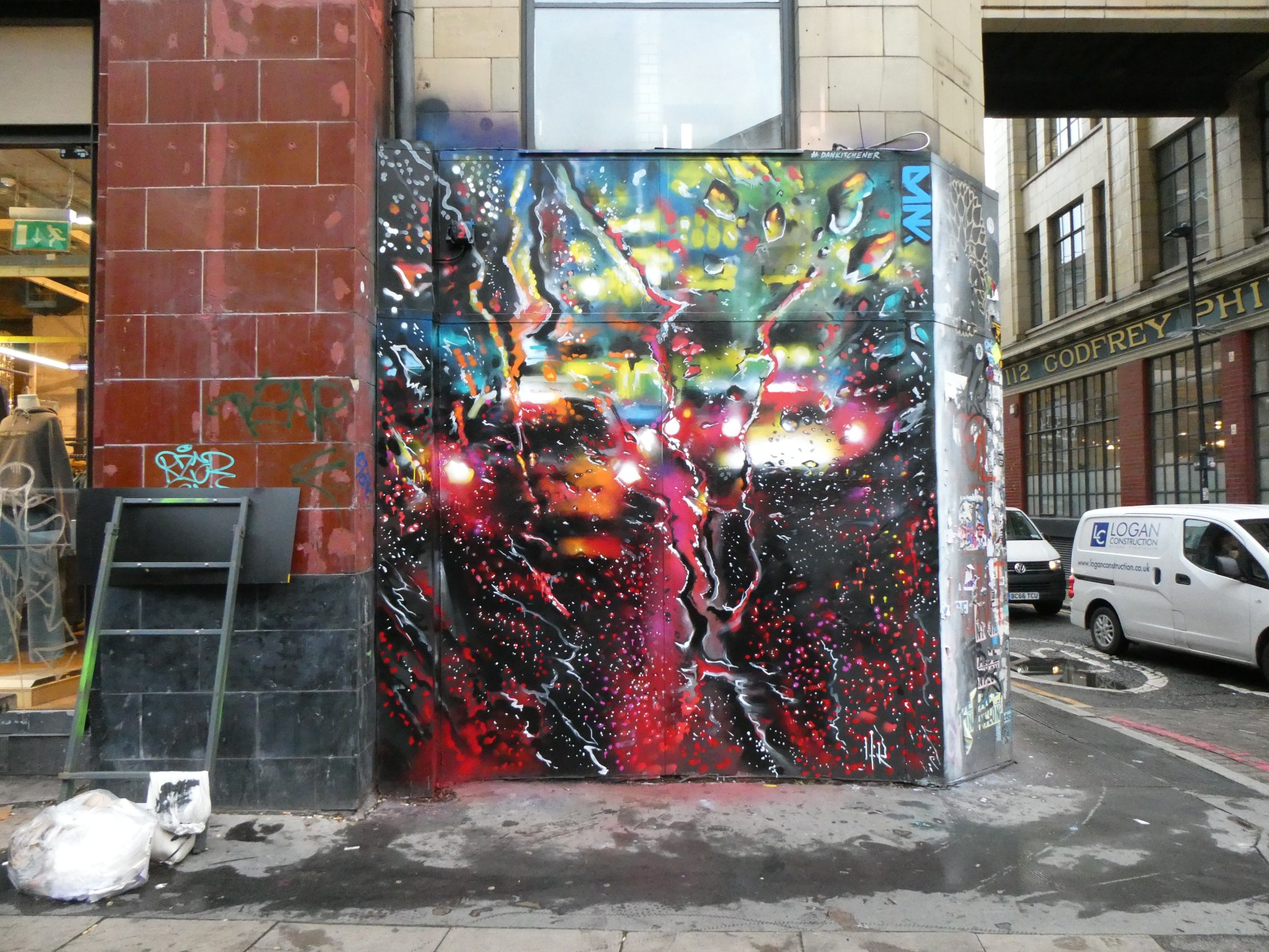 Sunday saw Street Artist Dan Kitchener take to East London, just on the edge of Brick Lane, to leave his latest artwork . This striking artwork titled Traffic Flow is based on the view through a rain-soaked car windscreen whilst stuck in a traffic jam on a trip the artist took to New York City a couple of years ago. We love the range in Dan Kitchener’s output, but we do very much enjoy these views through glass offering a distorted view of the beauty and rich colours in something as mundane as rain. This stunning artwork can be found in Commercial Street, Spitalfields.