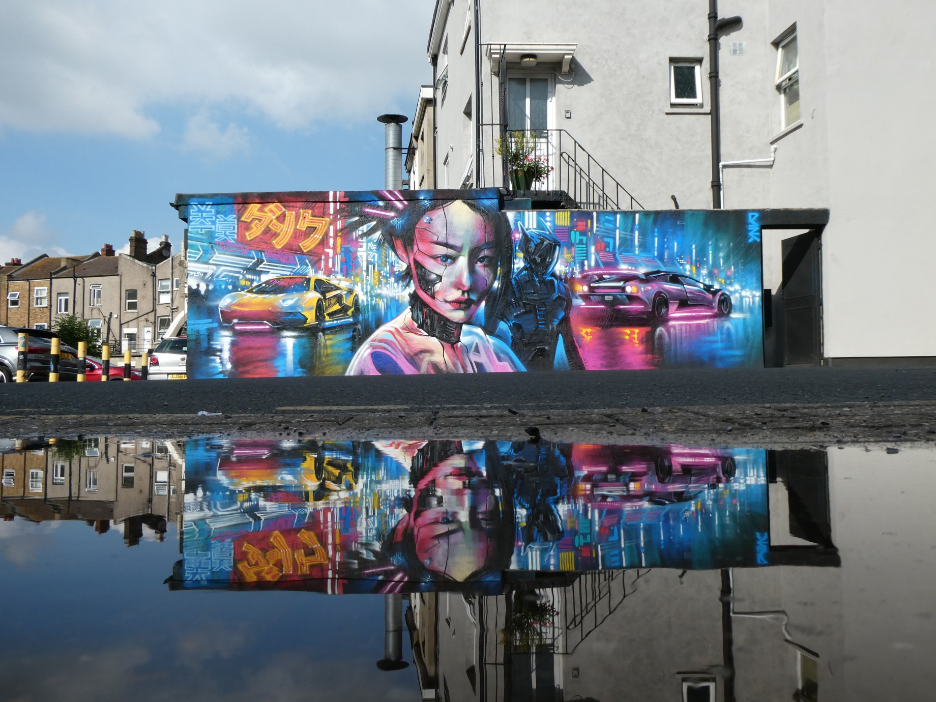 Taking to Evelina Road, Dan Kitchener repainted a spot he first painted five years ago on what was one of the very first walls donated to the project. Certainly making for an interesting case of seeing how Dan Kitchener’s Liquid Lights creations have evolved over the years as he continues to define his expressive style, for his updated work on this spot. For this work titled Tokyo Street Racers Dan Kitchener maintained his distinctive Japanese inspired street scenes featuring cars and people walking in the rain – though this time featuring a futuristic Tokyo scene featuring at its centre a cyborg geisha accompanied by a robot character in the foreground, both flanked by a pair of Lamborghini traveling in and out of the artwork, creating an exceptional amount of depth in this striking work.