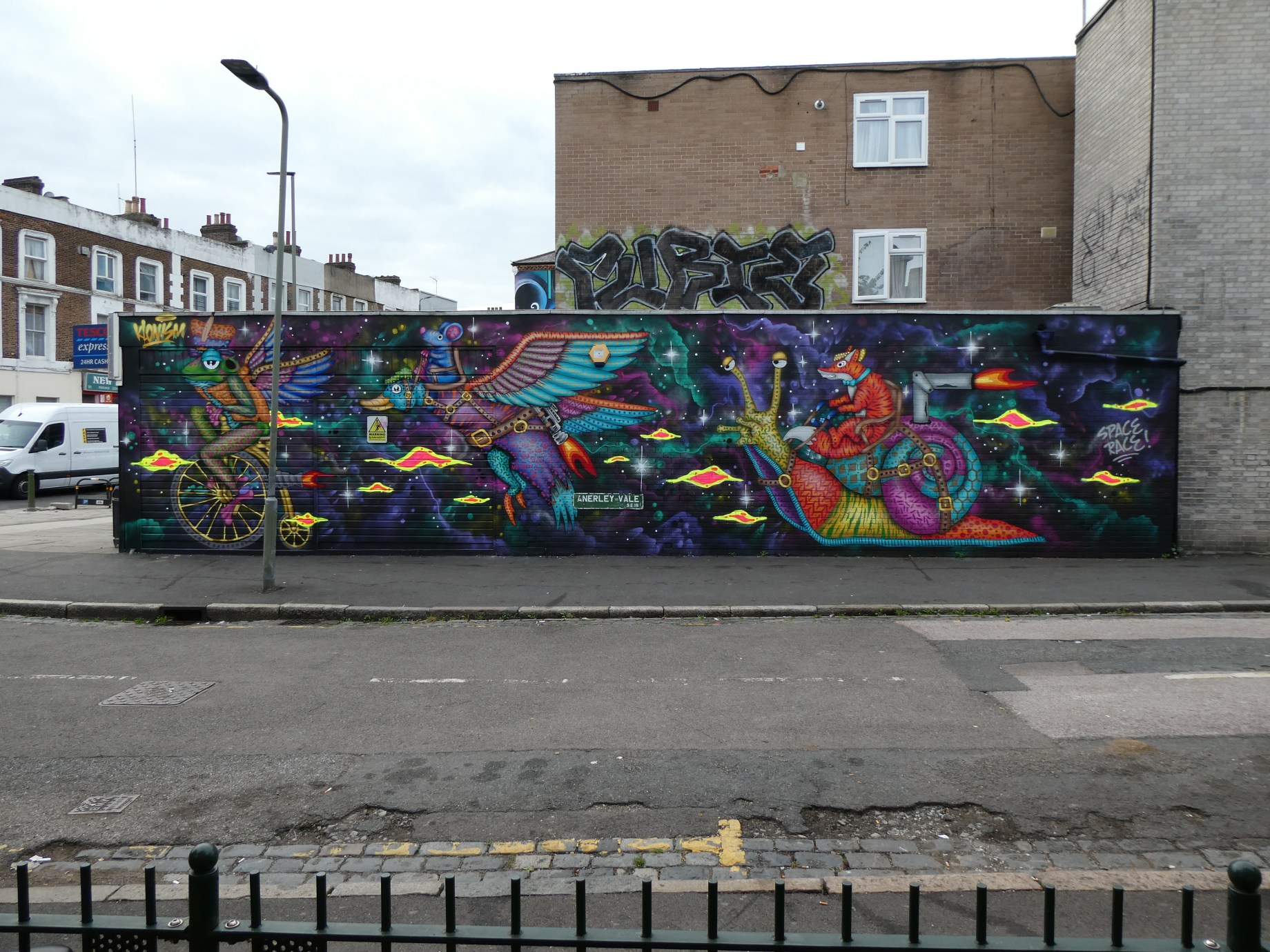 Next up we are taking a look at a superb addition to Anerley Hill by visiting international street artist Klonism, which was placed up over the summer for our SprayExhibition20 Community Street Art Project. We haven’t had many international visitors come and paint in London as a whole, let alone in our corner of town, over the last 18 months or so, however over the summer we were treated to a visit from English born, but Mexican based artist Klonism. The artist brought his distinctly Latin-American influenced style and imbued his subjects with a classical or traditional English sensibility fusing both cultures so perfectly in this striking and super fun piece titled Space Race. This cosmic scene is led by a top hat sporting frog atop a penny farthing, trailed by a rat flying a mallard donning a flat cap, with a fox riding a jet-powered snail at the rear, all on their way to destinations unknown. It was an absolute pleasure to have Klonism visit London and paint this incredible work for our corner of the city and we hope we get to bring him back in the future to add some more creativity to the area.