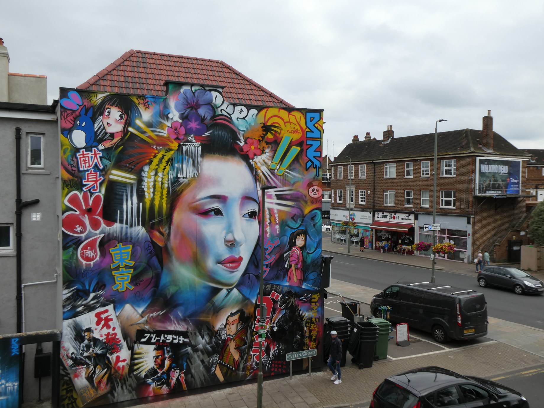 The work is titled Tokyo Dreaming and features an array of the of cultural influences which had led Dan Kitchener on his artistic journey of painting all around the world. The piece features at its centre a striking geisha portrait, who is surrounded by a series of classic Japanese film posters – Godzilla, Kung-Fu and Blade Runner – a classical depiction of a Samurai, a pair of anime characters and a series of graffiti throw-up tags – including Japanese graffiti. All depicted in Dan Kitchener’s trademark energetic and colourful modern impressionist style. It sits so nicely with Dan Kitchener’s previously painted piece on the adjoining wall, looking to past inspirations now contrasted with a glimpse into a sci-fi driven dystopian future of Tokyo on the left. Absolutely stunning and certainly a wall that commands your attention upon viewing.