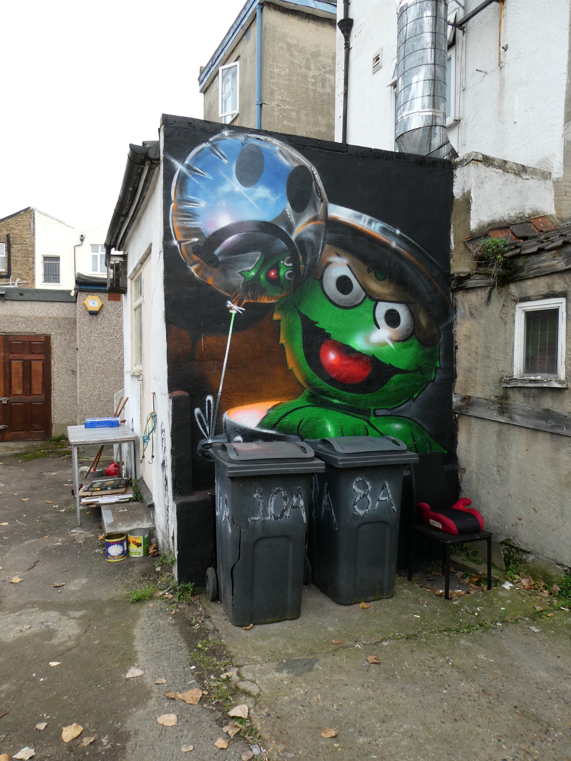 Next up in our lengthy run of catching up with what we have been up to in our corner of South-East London over the recent few months we are taking a look at an absolutely amazing work from street artist Fanakapan placed up last month in Penge for our SprayExhibition20 community street art project. This work is the third time Fanakapan has painted in Penge, having painted one of the first walls for the project back in 2016 and again in 2019. This is also the first time Fanakapan has dropped some of his trademark balloons in SE20 with this incredible piece featuring Sesame Street character Oscar the Grouch holding a perfectly chosen sad face balloon. So when offered a spot partially obscured with bins, Fanakapan chose to play into the obstruction, rather than work around it, something this artist is particularly adept at doing – as we will see soon when we look at the second addition to SE20 from Fanakapan from the last month or so. All round this is an absolutely first class work that suits it location perfectly.