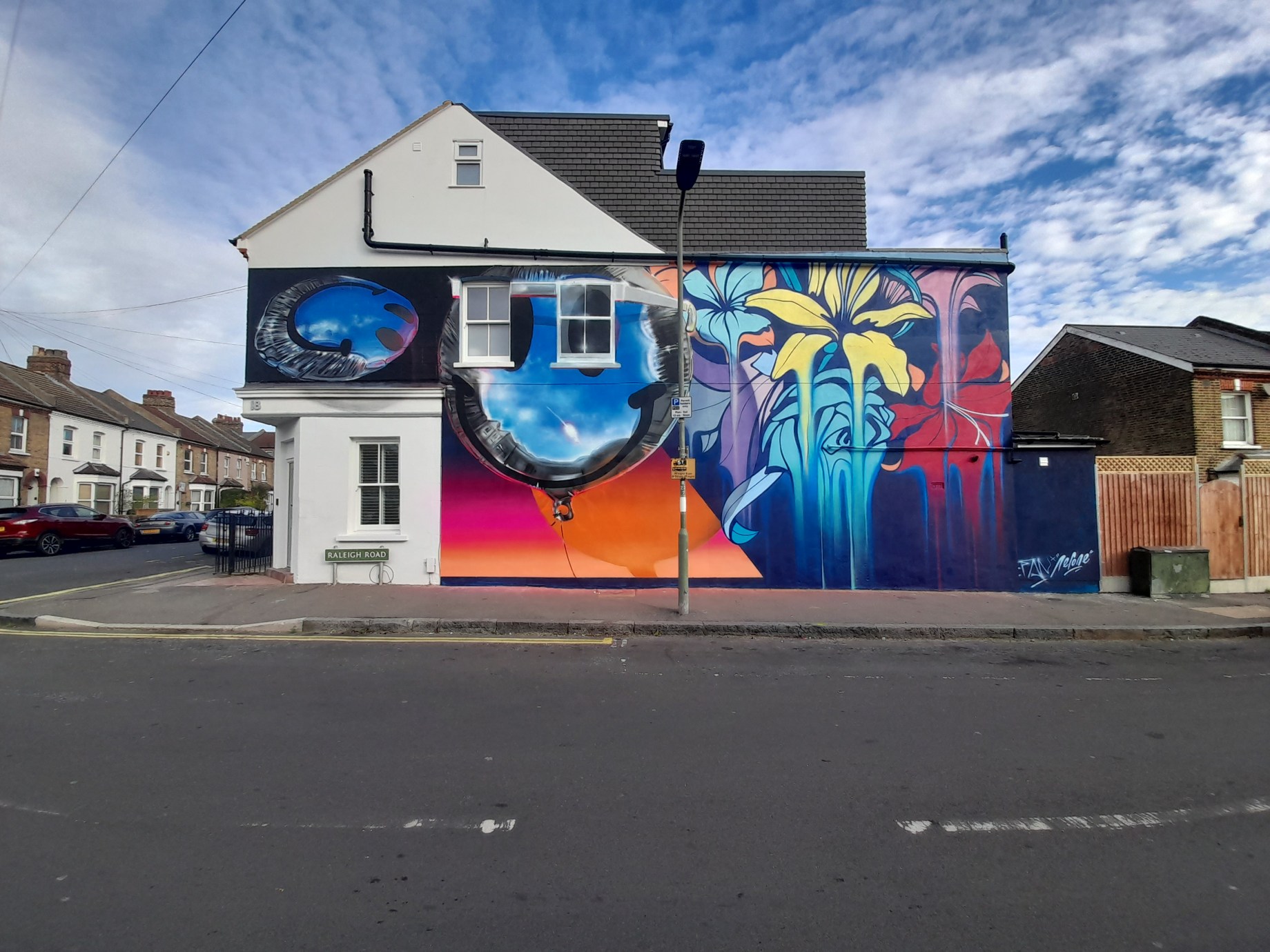 For our next post we are taking a look at an absolutely incredible work placed up a few weeks back for our SprayExhibition20 Community Street Art Project around Penge and Anerley by street artists Fanakapan and Nerone. This amazing artwork titled Neighbourhood Watch marks the first time this pair have collaborated together on a wall and we feel ever so privileged that it is located in SE20. The piece fuses each of the artists respective styles so perfectly, with Fanakapan’s hyper-realistic helium balloons accompanied by Nerone’s rich retro style flowers. This piece is surreal but generates such a fun, warm and all round striking atmosphere. We very much love seeing two diverse styles flowing together so harmoniously. We particularly love how Fanakapan incorporated the single existing window into his central subject, along with the building opposite reflecting in the balloon. Along with the magnificent dripping effect oozing from Nerone’s flowers, simply beautiful.