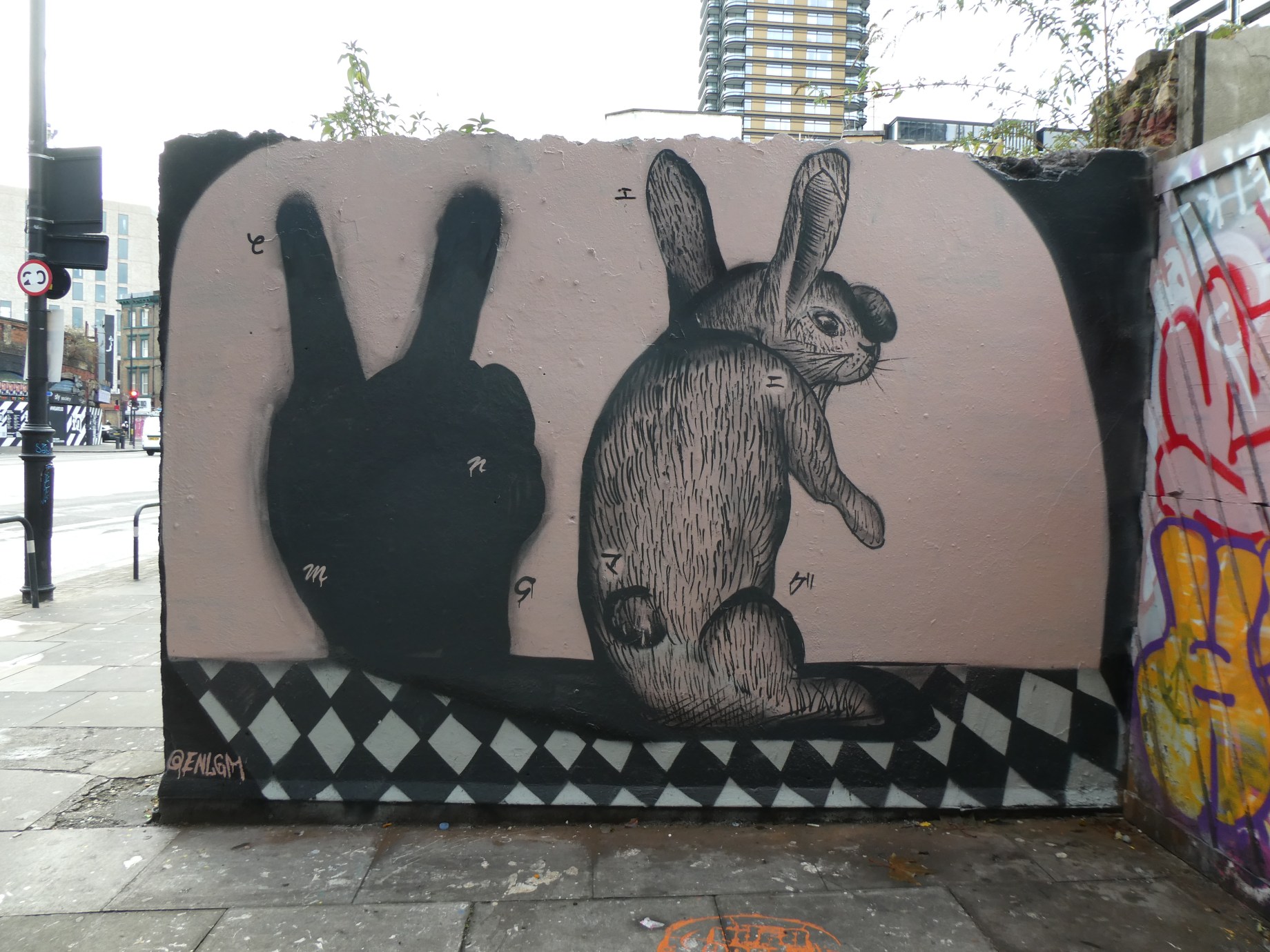 Work in Shoreditch High Street, Shoreditch. This piece is part of a series of works the artist has been creating focused on shadow puppetry. This work is particularly fun as it subverts the standard and most universal shadow puppet concept in the form of using ones hands to form a shadow bunny and spins this on its head with the bunny crafting a shadow hand.