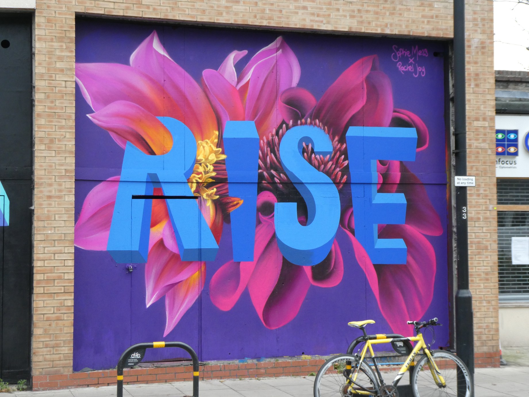 On our recent trip up to East London at the weekend we were delighted to see this striking addition to Hackney by street artists Sophie Mess and Rachel Joy. Making for a fantastic collaboration this pair of artists have fused their respective styles and subjects so harmoniously, with Sophie Mess’ trademark vibrant flowing flowers immersed around and amid Rachel Joy’s precise 3D typography that really pops off the space. Making for an all round superb piece that is truly captivating. This excellent work can be found along Mare Street, Hackney.