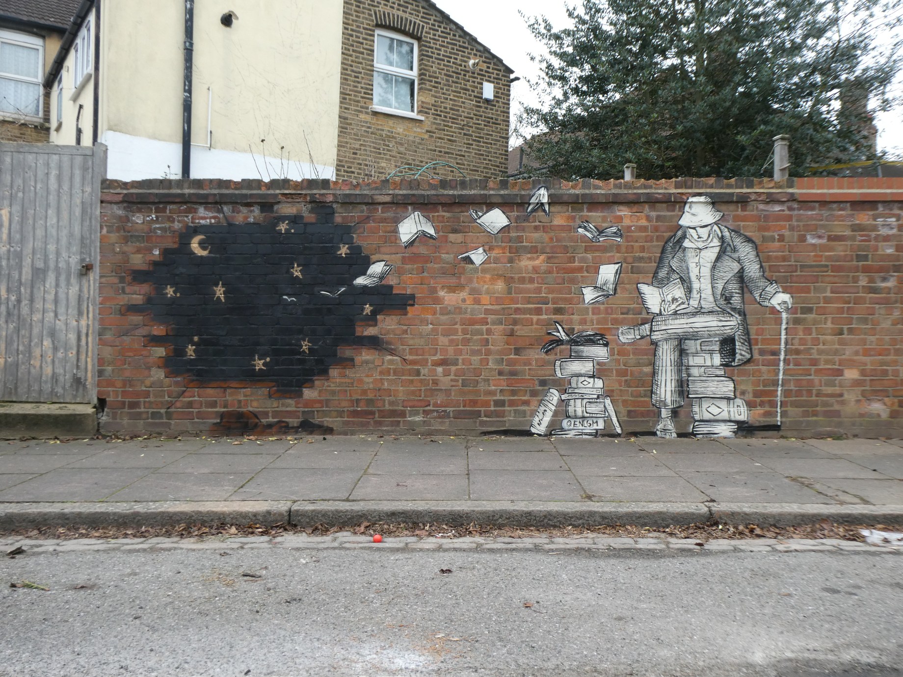 For our next post we are taking a look at a fantastic recent addition to Penge by street artist Enigm placed up for our SprayExhibition20 community street art project around Penge and Anerley. Enigm is proving to be one of the most active street artists currently on London’s scene, as well as making for one of the most exciting artists to land in our city for some time. Taking a rich illustrative style heavily influenced by a cross-hatching approach Enigm’s work has a very historically old-fashioned quality, the technique and colour-scheme brings to mind drawings from the Victorian era, which add so much to the surreal otherworldly scenes this artists concocts. For this particular work we love how Enigm has utilised the beautiful raw brick on offer and incorporated it so brilliantly into his design.