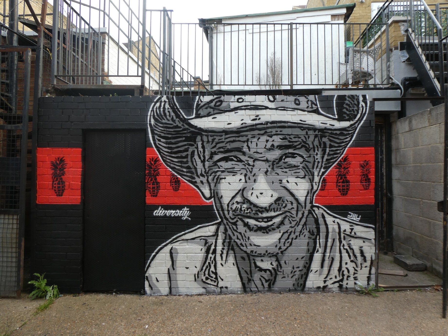 Over the summer we was very fortunate to receive a visit from Colombian street artist DjLu on his first visit to London, who left us a pair of fantastic stencil works. This artist’s output is very politically and socially driven driven, featuring subjects representative of the issues his country and region are affected by, with the first work below in Southey Street depicting a Colombian farmer with hand grenade pineapples set behind him, representing the way farmers are forced by militias and cartels to grow illegal drugs. And the second work features a portrait of Francia Marquez who was running for Vice-President in the 2022 presidential elections in Colombia.