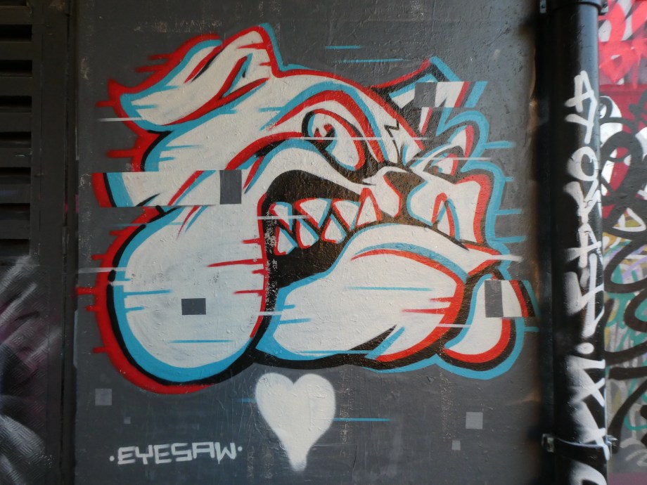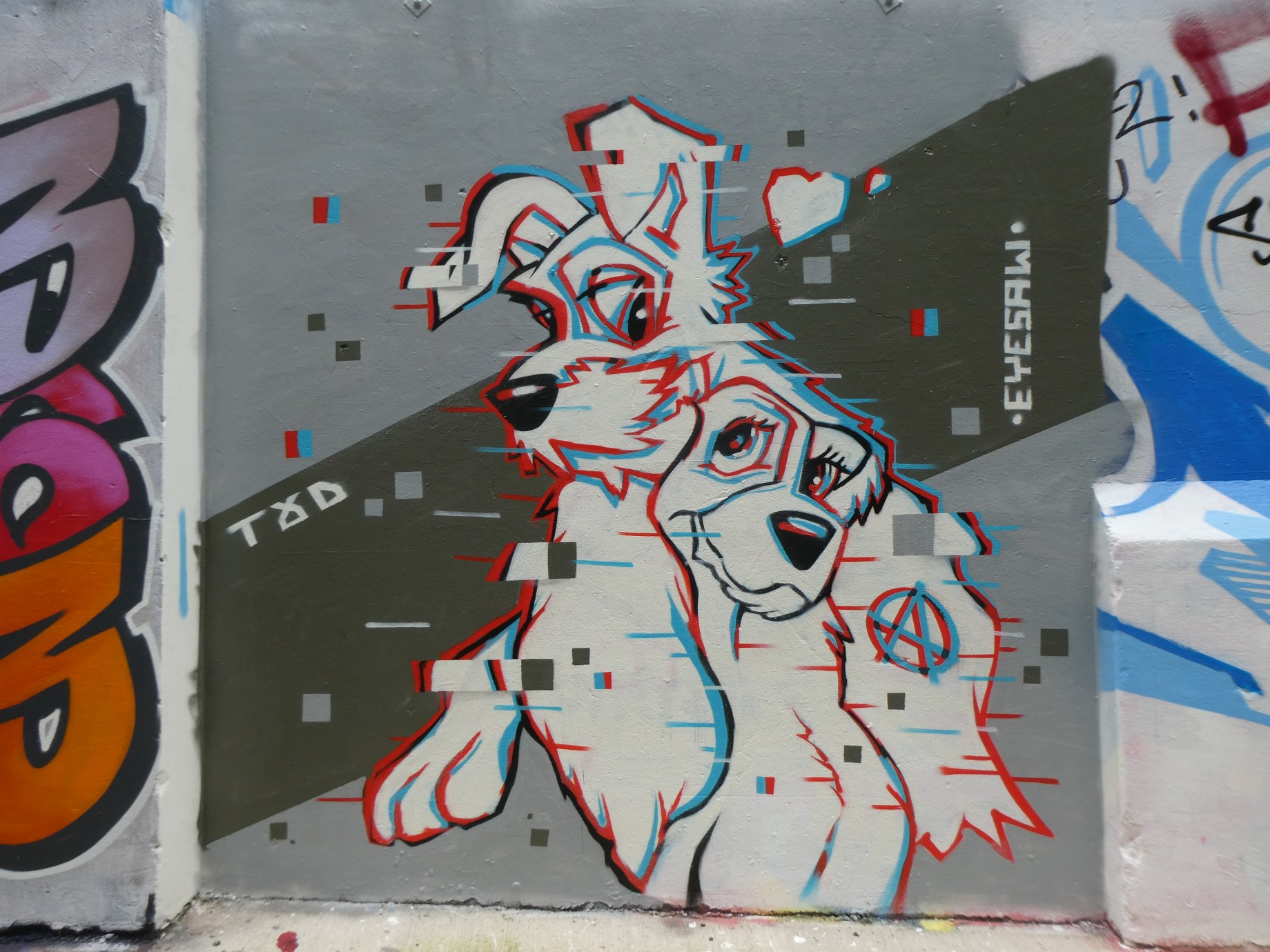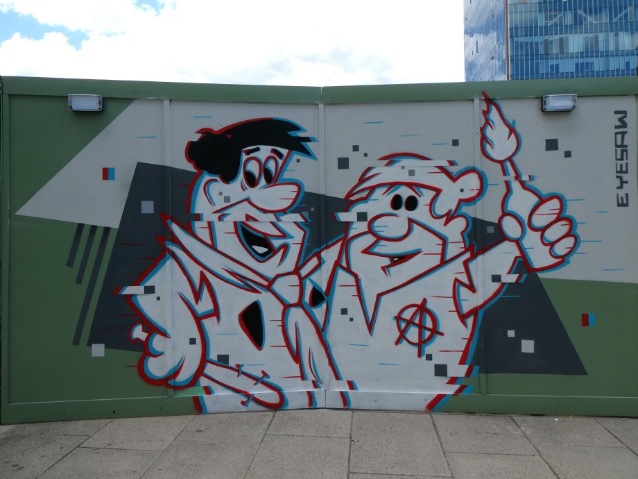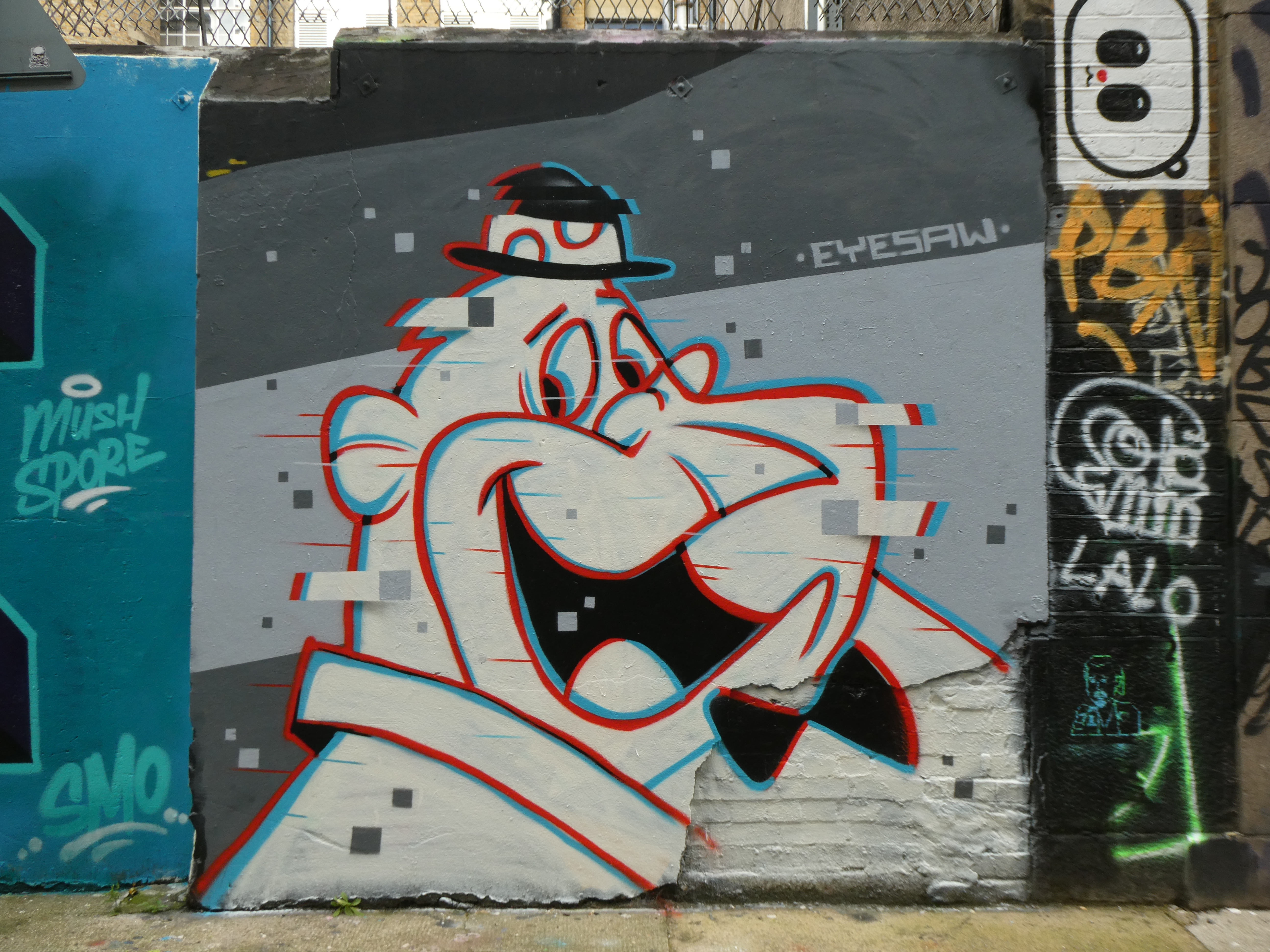 Next up we are taking a look at a series of four works we have seen that were placed up over the course of 2022 around East London by street artist Eyesaw. The works in question all feature glitched representations of iconic cartoon characters, including Lady & the Tramp, Magilla Gorilla, Fred Flintstone and Barney Rubble, all of which are painted to great effect with so much movement captured using such a minimalist colour palette, definitely impressive to see.