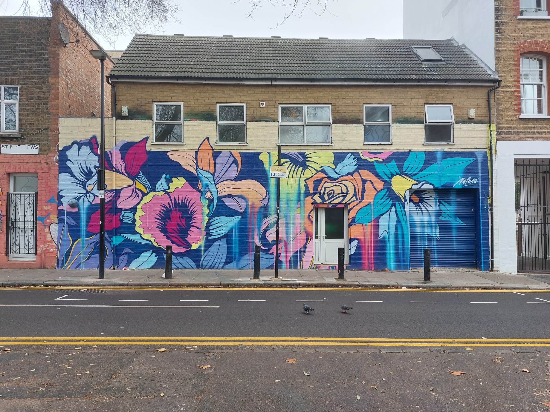 Earlier this year London saw street artist and graffiti writer Nerone leave to head home to France this year, and we wish him all the best. However it is a shame to not see his art as frequently as we would like to about the city, he has still been back at least once this year and while he did he hit up a beautiful larges-scale mural in East London. We are also sharing his last letter work before he left London below. It’s truly impressive to see the range of styles and subjects in this artists repertoire, whilst always maintaining the quintessential character of his output, there’s a lot this artist can offer and do. Of the only two fresh works we have seen from Nerone this year, the latter presents one of his trademark vibrant and retro colour-palette fueled floral driven scenes.Whilst the letter work from earlier this year is so clean and offers a Tronesque retro electric vibe, all presented in such beautiful harmonious colours.