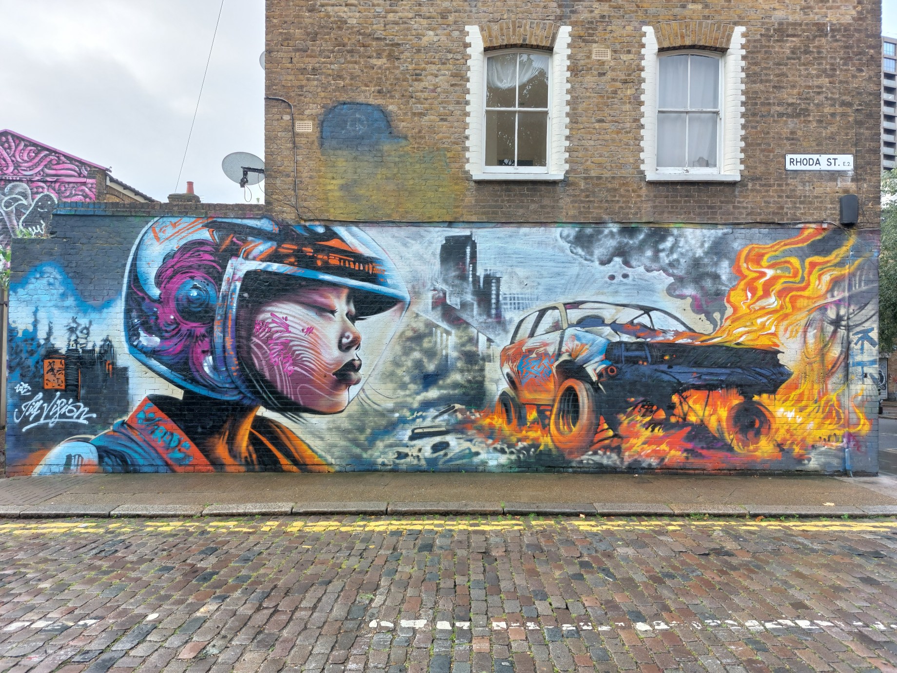 Next up we are taking a look at a series of five fantastic works we have seen from Jim Vision on our visits to Brick Lane and Shoreditch through the course of 2023. It’s always a pleasure to see work from this artist and of the five works shared below, our favourite is definitely the first work in Rhoda Street featuring a futuristic dystopian scene, fusing portraiture and anarchic scenery superbly. Very much one of the best walls we have seen around London over this last year. One of East London’s most active and prolific artists for many years, we don’t doubt it will be too long before the area is treated to fresh additions to the streets of Shoreditch by Jim Vision and we eagerly anticipate what this artist drops next.
