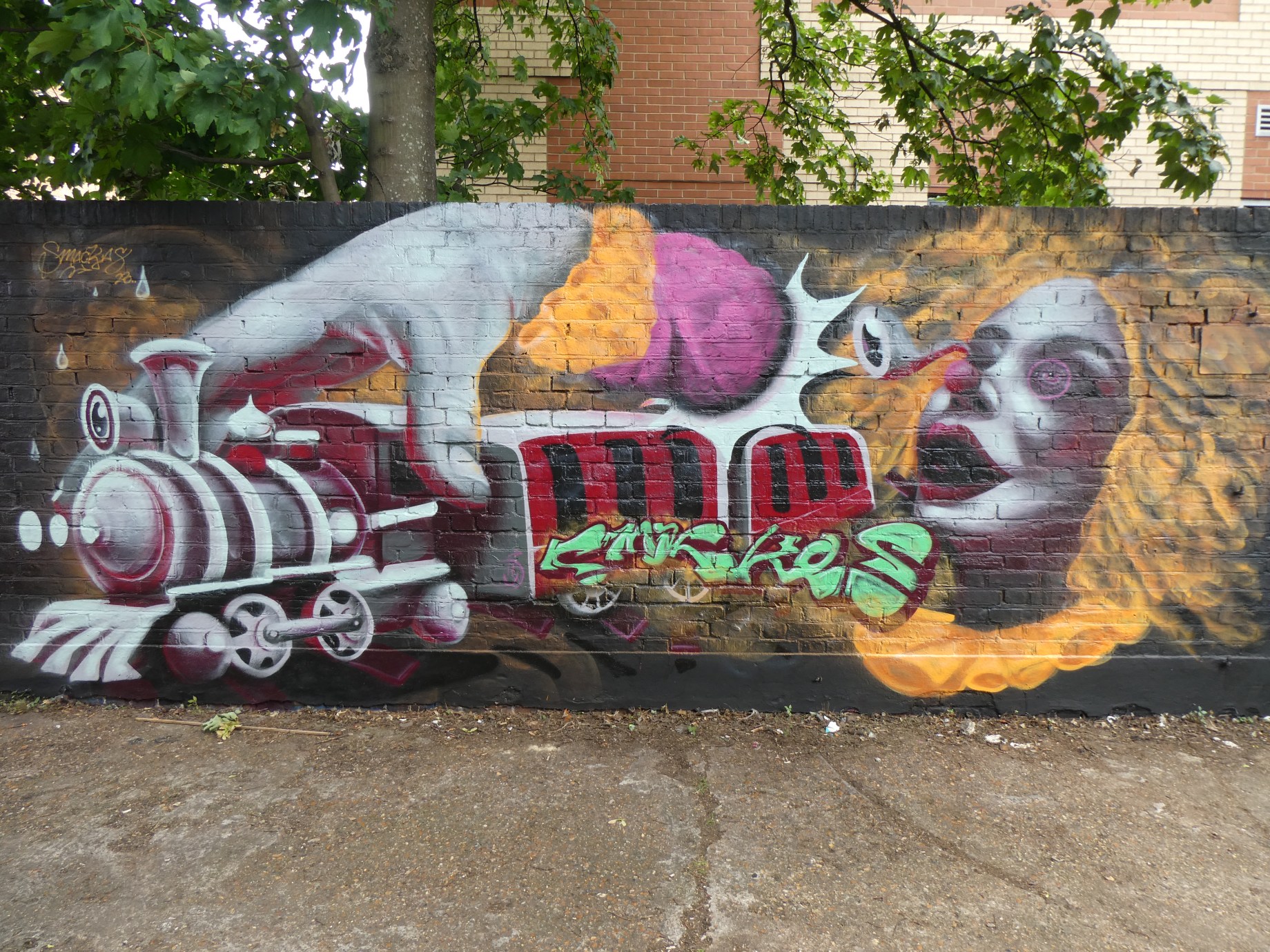 Over the summer Penge received a visit from a few different artists travelling across the world from Australia to drop some fresh additions about the town, the first of whom was Smackas. Who on his whistlestop tour of London took to Penge High Street to leave this rather surreal and a tad dark vision of a clown playing with a tagged up train fusing a child like love of old fashioned trains from an era gone by with hardcore graffiti culture. It is always a pleasure to discover and meet new artists, and all the more so when they drop something fresh about town for ourselves and the locals to enjoy. We feel very lucky to have been able to host the only artwork this artist currently has placed up in London and hope it isn’t too long before he graces our home city to leave his mark again.
