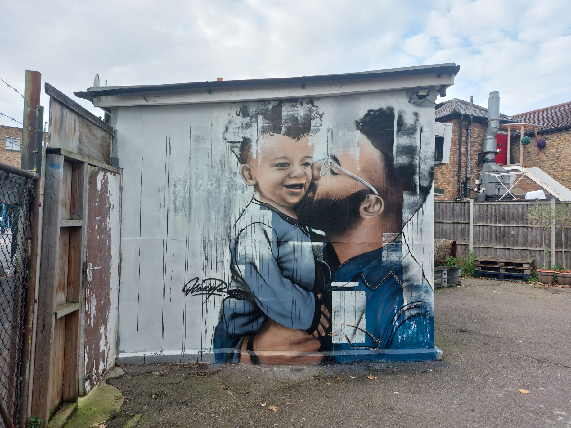 Next up in our look back at 2023 we are taking a look at a more recent work, placed up just a few weeks ago by French born, but London based, street artist Olivier Roubieu. Making for the second time Olivier Roubieu has come to Penge to paint since we started our Sprayexhibition20 community mural project in February 2016, it has again been a pleasure to have this artist come paint some of his distinct portraiture work. In this instance we have a striking portrait titled Father and Son presenting a lovely scene, as the title suggests, of the love between a father and his child. In addition to the warm and soulful imagery, we love the layered elements of realism, minimalism, deconstruction, and drip work to create the wholesome and rich total.