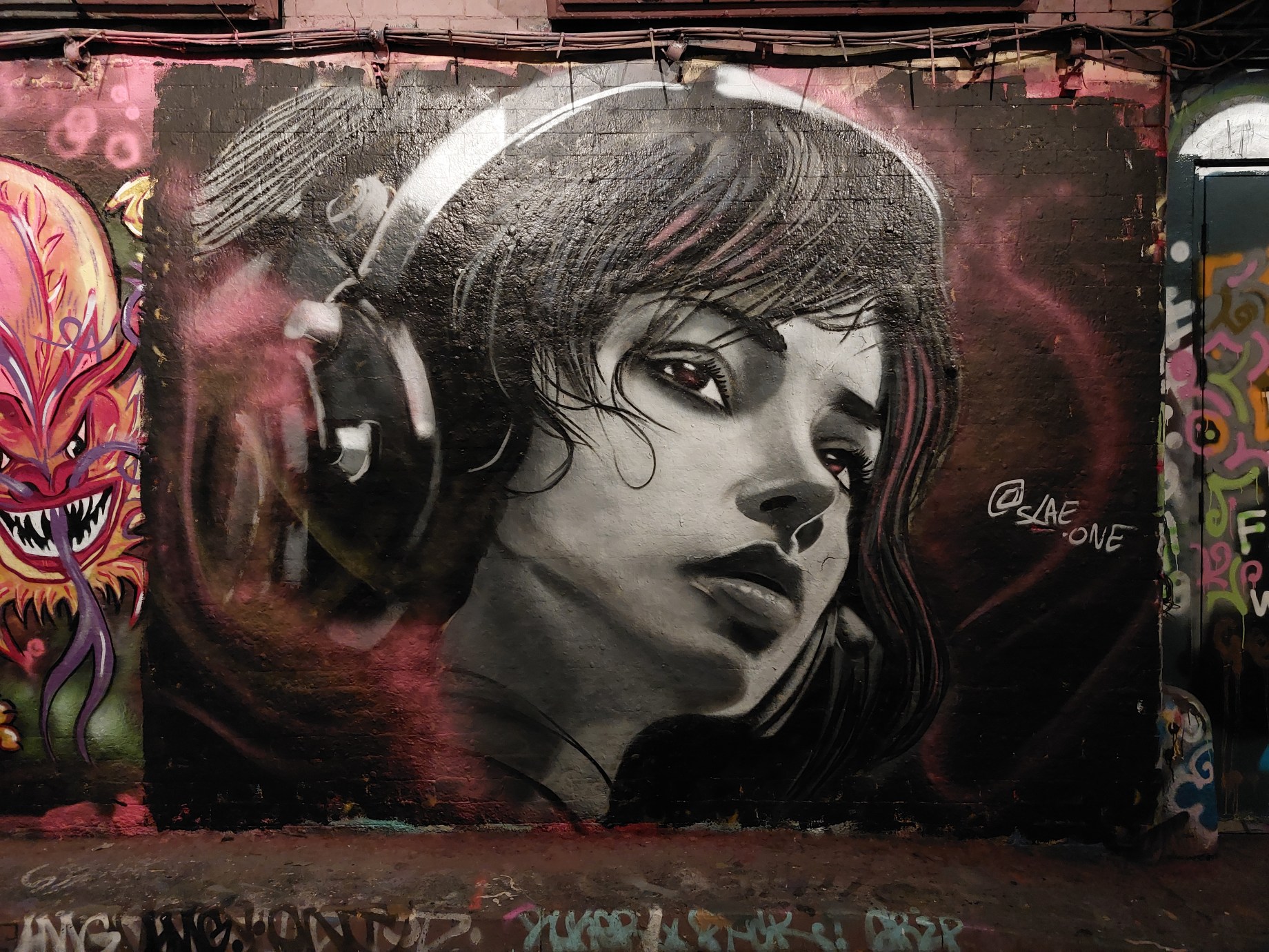 The other day whilst up town we took a little detour to Leake Street where among the constant turnover of new pieces we were fortunate enough to catch three fresh works from Slae, someone it is fair to say is probably currently London’s most prolific graffiti writer and street artist – you will be hard pushed to not see work of his in Leake Street if you pass there at any point. Of the three works below we have a trio realistic portraits from Slae, including one collaboration with graffiti writer Beatfox. It is impressive to see how Slae is constantly honing his skills and upping his game, this is achieved by the sheer range of subjects he is painting these days, be it portraiture and characters, letter works or entire scenes.