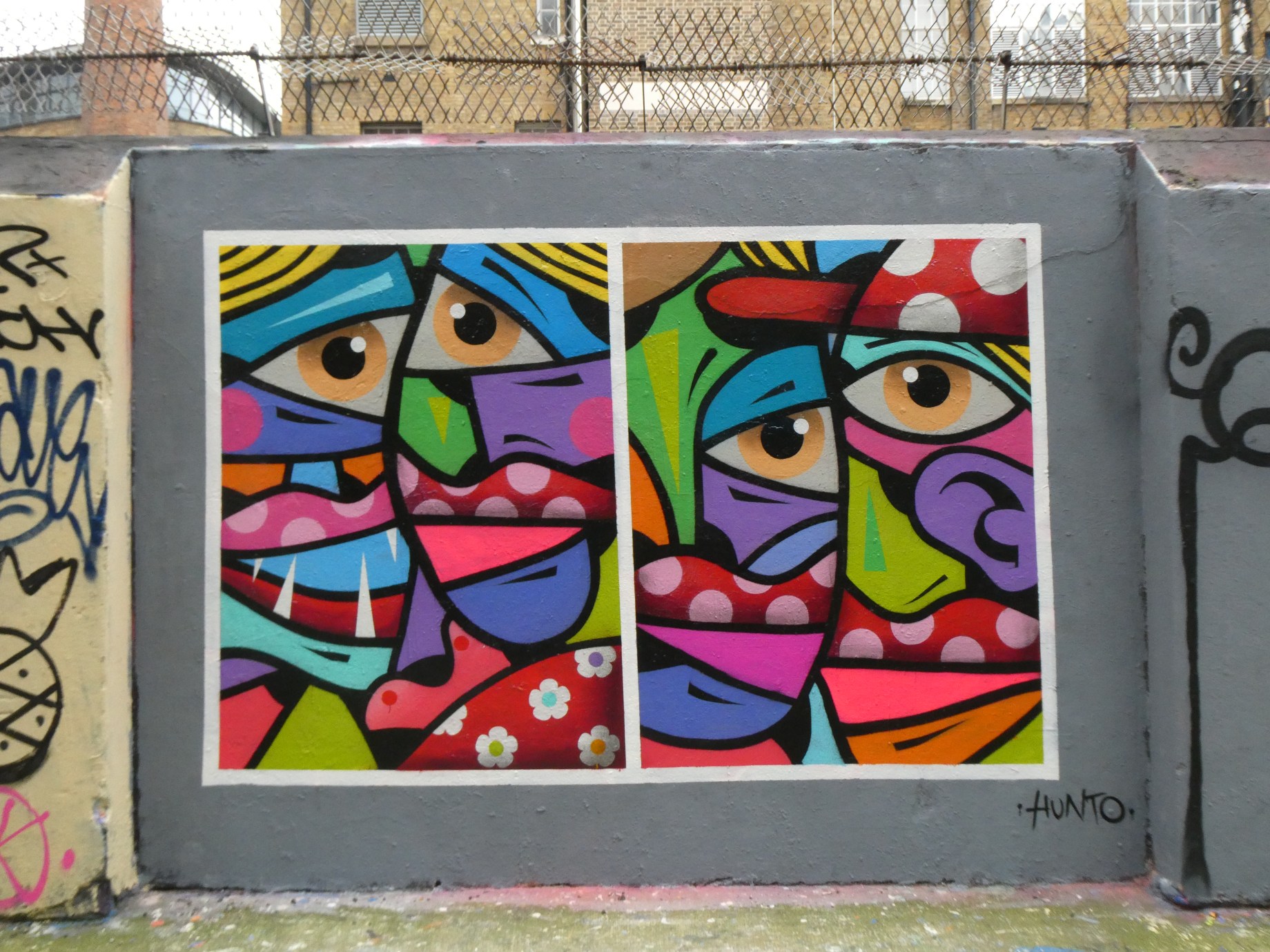 A couple of weekends back we made our first visit up to East London to see some of the latest happenings in the street art and graffiti scene and was treated to several recent additions to the area, which we shall be looking at over the coming days. First up we are looking at a superb fresh addition to one of the side roads around Brick Lane, by Italian born, but London based street artist Renato Hunto. As always, he has done a fantastic job doing what he does best, namely painting his distinct and colourful signature style abstract characters. Originally a Graffiti Writer, Hunto has gone on to develop his own brand of fluid cubist creations infused with a bold block colouring, depicting for him the great universal subject – sex, intimacy and love. It is of the utmost pleasure to see how an artist’s styles and subjects evolve over time, and that certainly applies to Hunto, who is constantly honing his craft, most notably for us in his continued fine tuned colour palettes and through the addition of new shapes and increased layers. This fantastic work can be found in Corbet Place, Brick Lane.