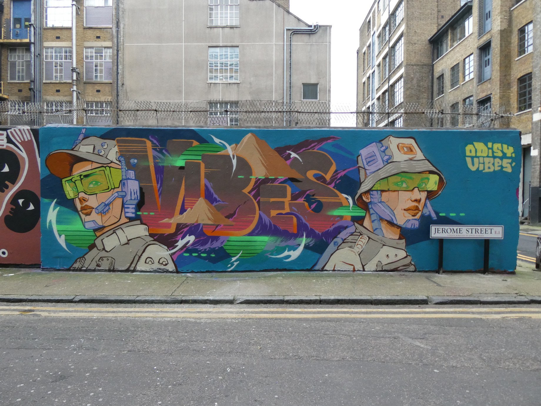 Next up we are taking a look at a recent artwork placed up just a couple of weeks ago by graffiti writers Vibes and Odisy up Brick Lane way. Making for an excellent collaboration from the pair, the piece superbly fuses Vibes’ stylised letters with some of Odisy’s distinct characters in this surreal scene fusing the ancient pyramids with futuristic explorers. It has been a while since we have seen work from Vibes and significantly longer since we have spied fresh work from Odisy and this recent addition to the East End didn’t disappoint. This excellent piece can be found in Jerome Street, Brick Lane.