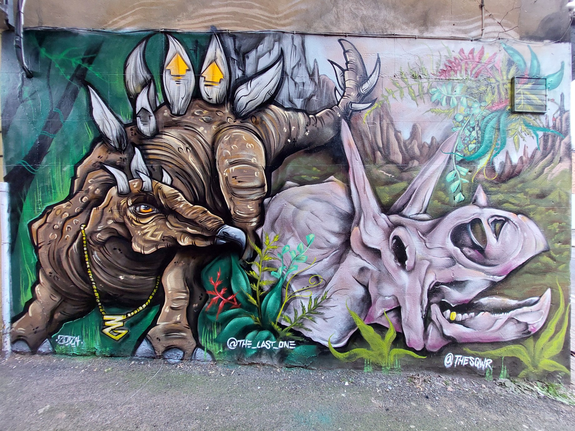 A month or so back saw graffiti writers Skewer and Last take to Crystal Palace to paint the first town spot for our community endeavors in 2024. Presenting a fantastic fun work – who doesn’t love dinosaurs? We have a harmonious collaboration of each artist’s respective styles, with Last painting the Stegosaurus on the left and Skewer painting the accompanying Triceratops skull on the right, both set in a lush cascading valley setting. Not only is the work so much fun, it is a superb addition for the area, something which was not lost on the locals, as just a stones throw away are the iconic Crystal Palace dinosaurs. The dinosaurs in question are a series of sculptures which were unveiled in 1854 following the move of the Crystal Palace to the area after the Great Exhibition in Hyde Park, and are dotted around the lake in the nearby Crystal Palace Park.