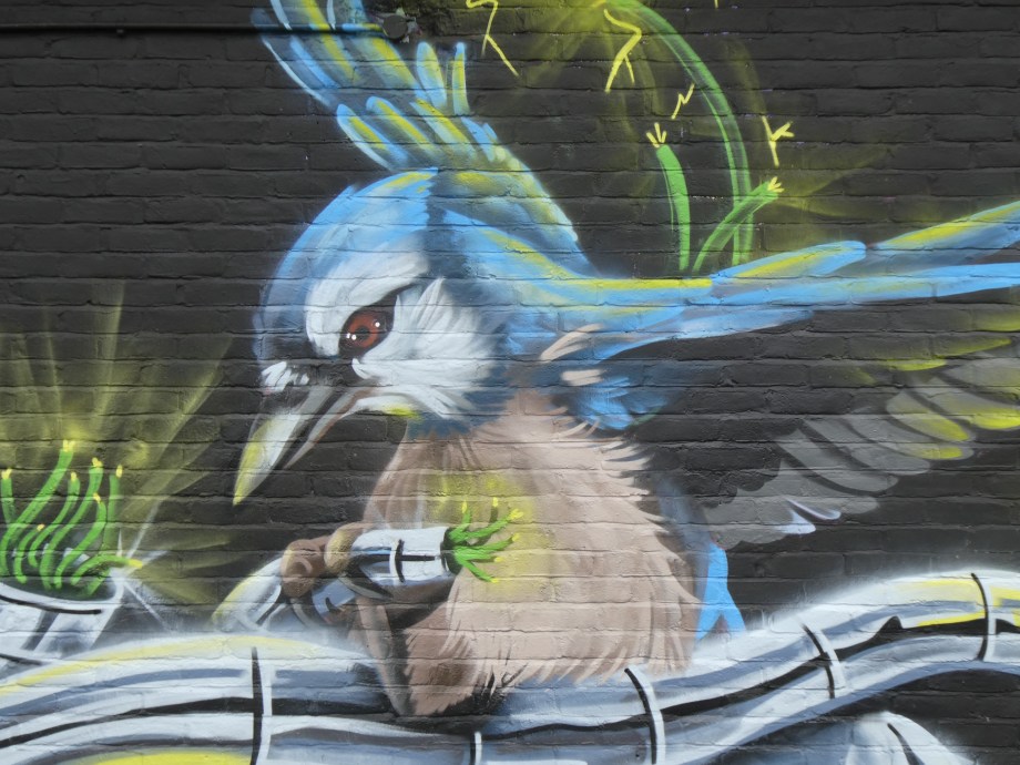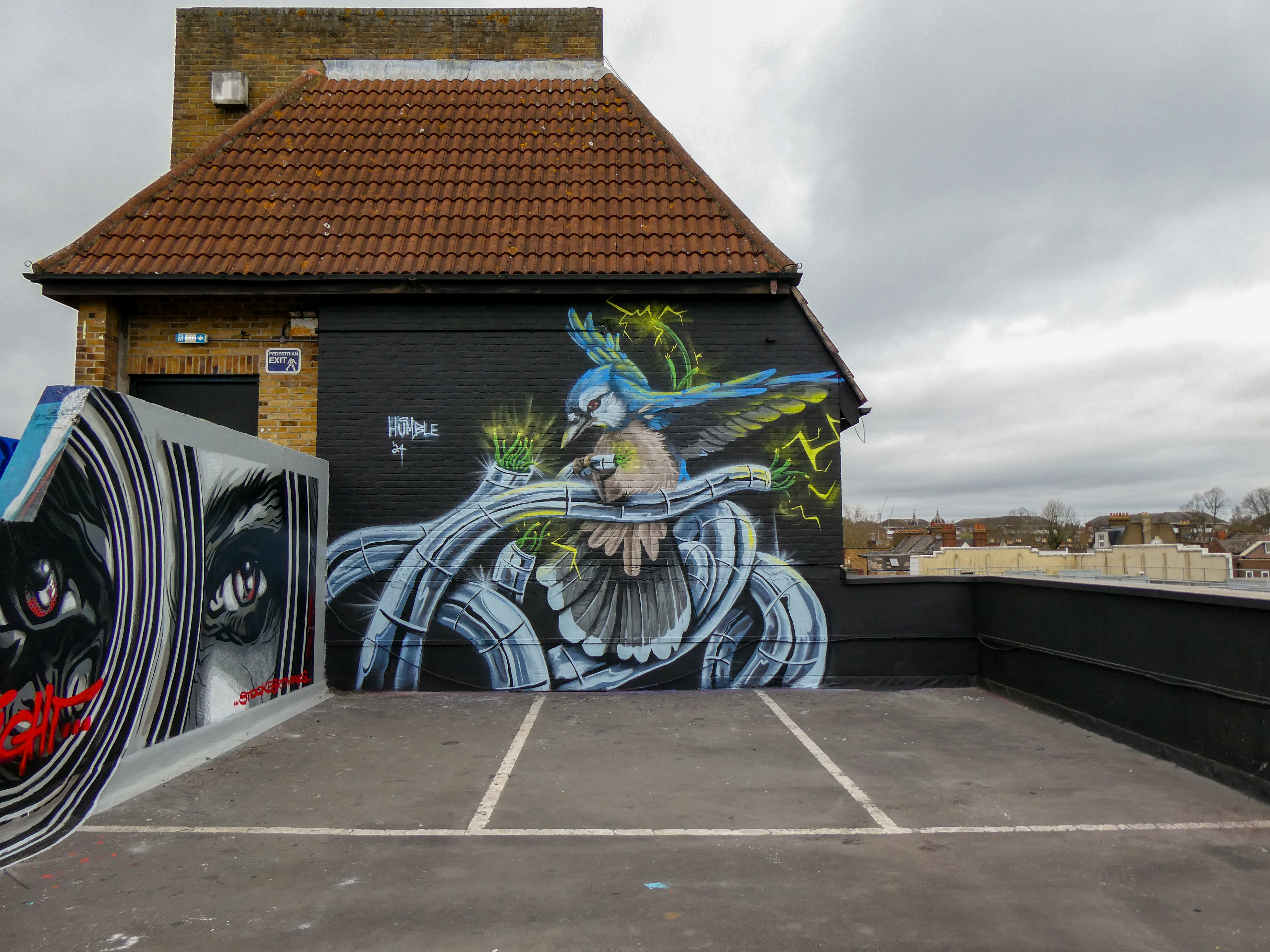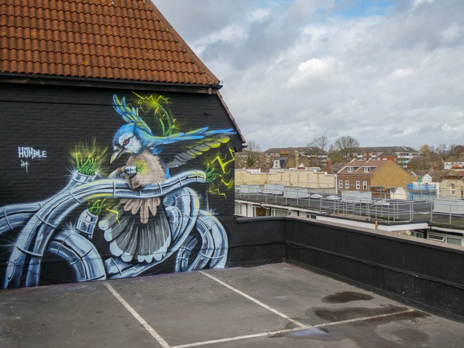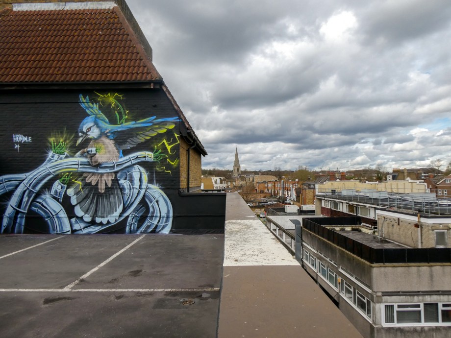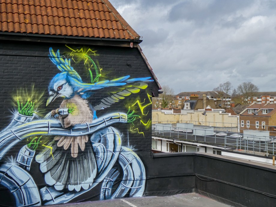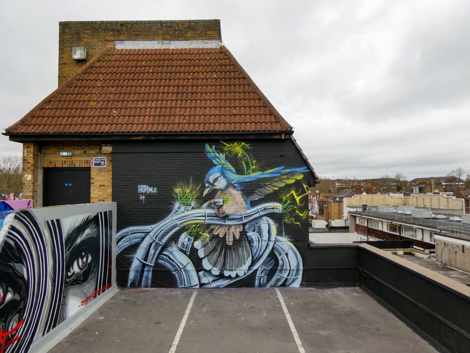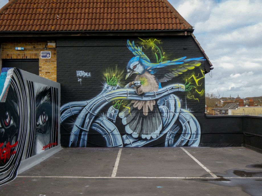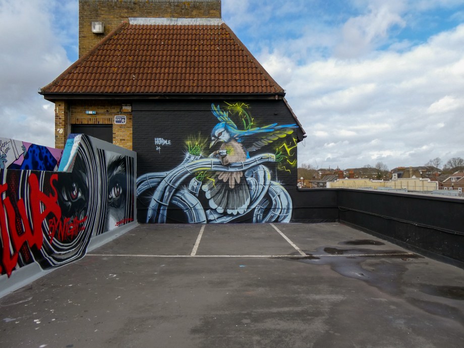 We have over the last year been exceptionally fortunate to have a had a number of international visitors who had previously been unknown to us or in some cases, having not even painted in London previously, pass through our corner of South-East London and leave there mark as part of our ongoing community street art project. One such artist was Humble who was passing through London earlier this year whilst over from New York, who took to the top of the Blenheim Centre above the high street at the heart of Penge and left this striking Blue Jay battling a series of electric limbs and setting to break free from the tentacle that bind us together. Certainly a fantastic piece and a pleasure to host such a talented artist. This striking work was placed up at the Penge Rooftop Gallery, Penge, and was put up with support from ourselves London Calling Blog.