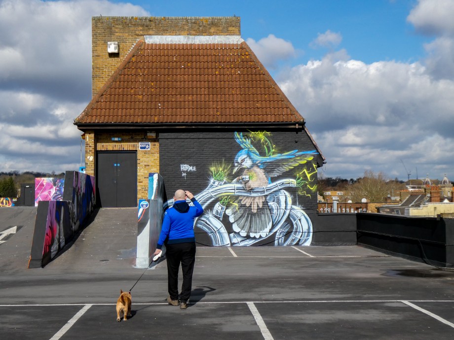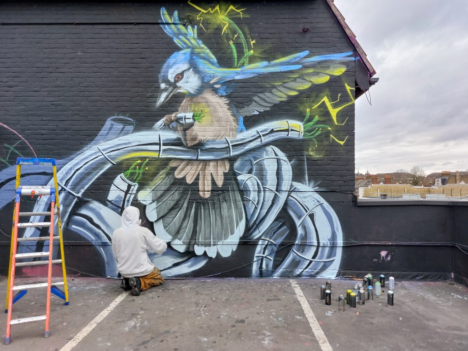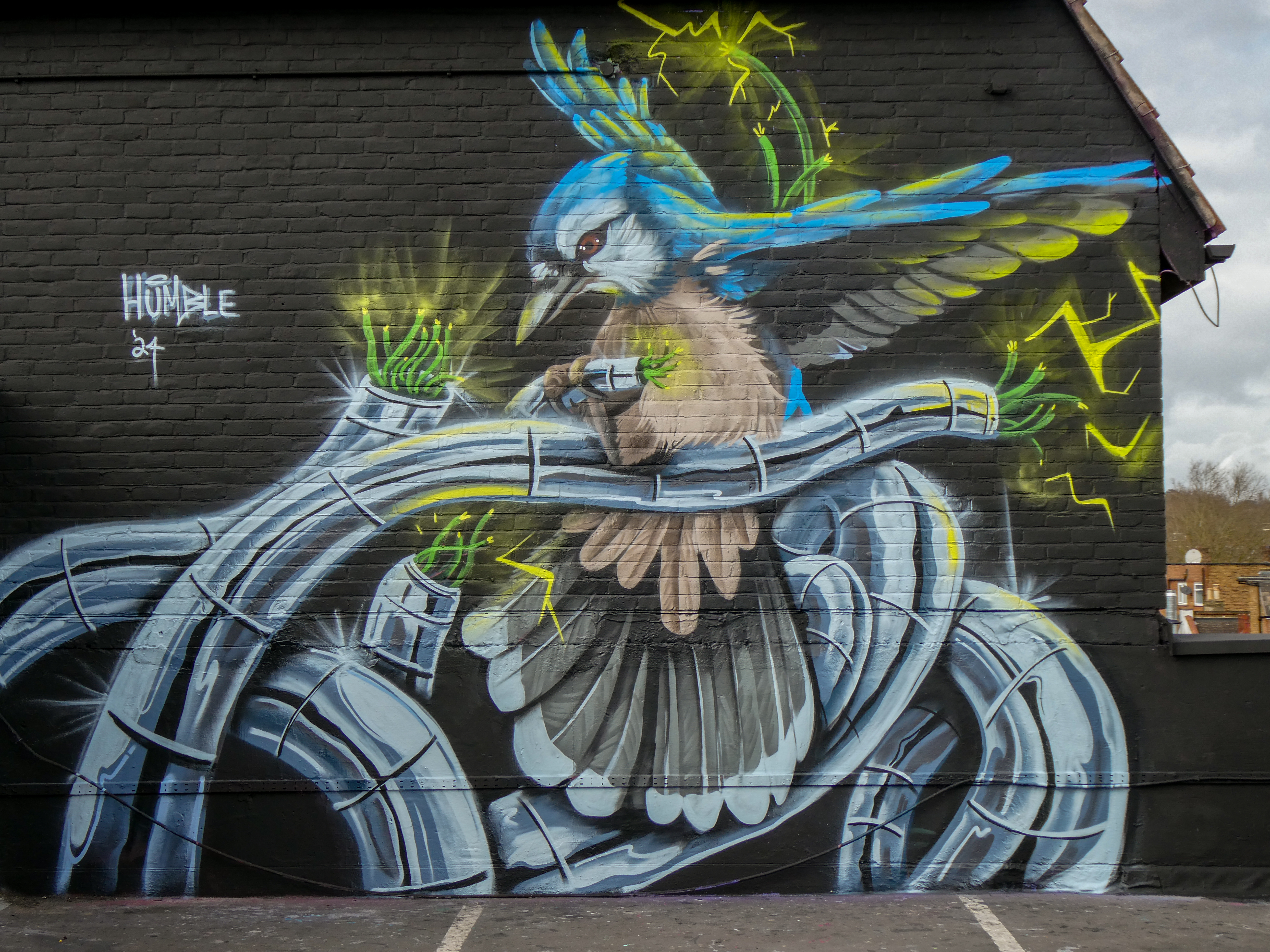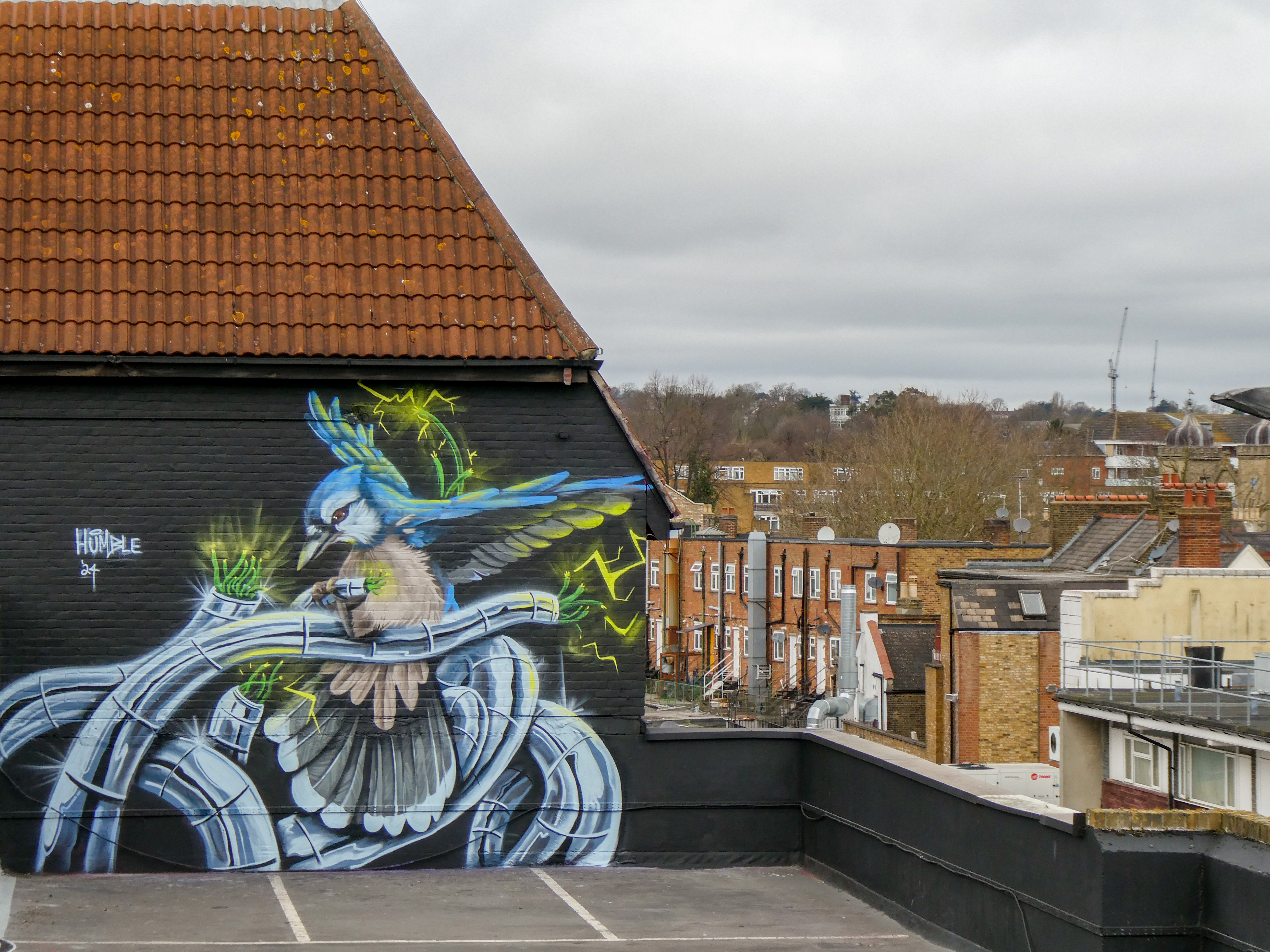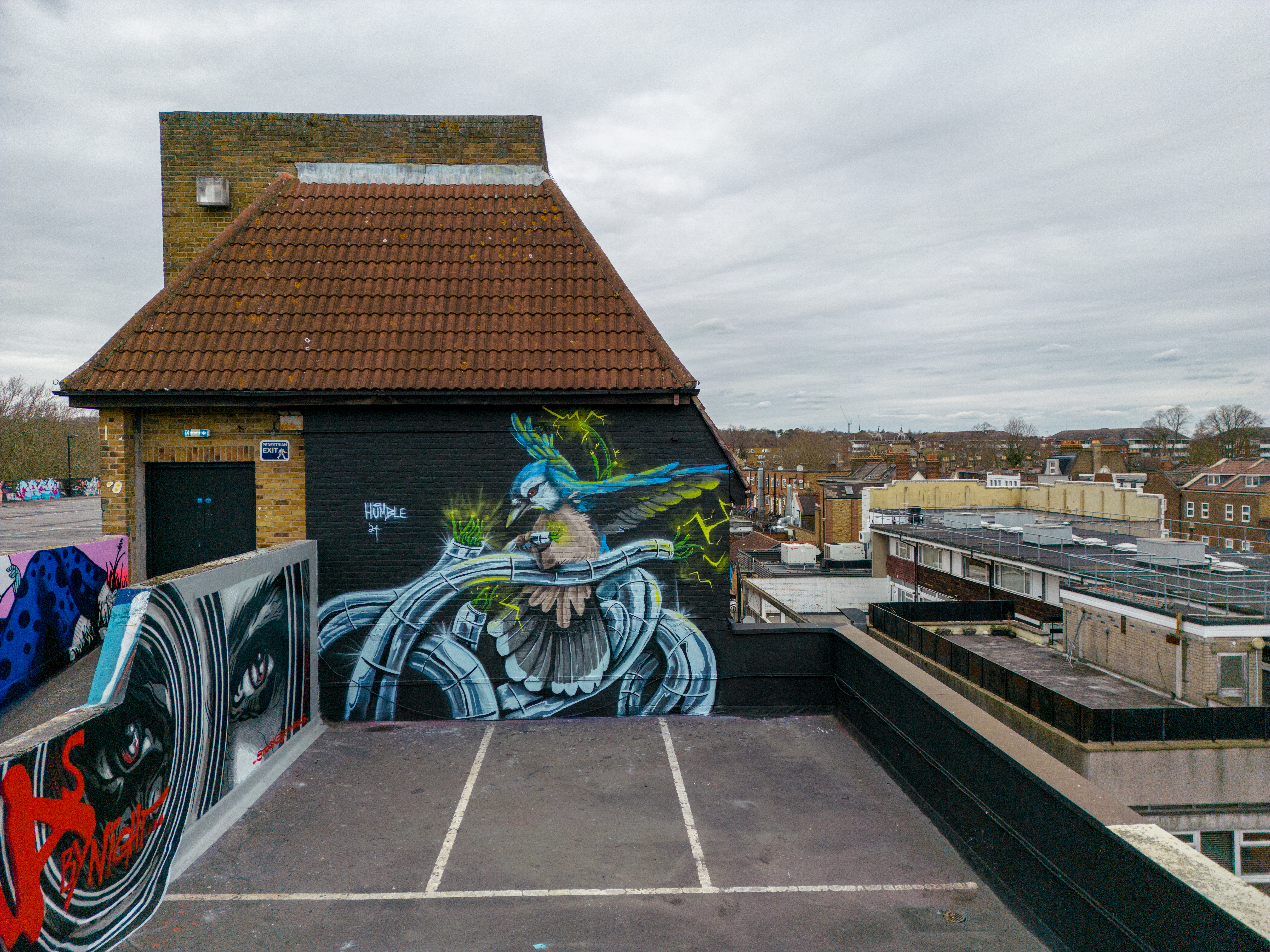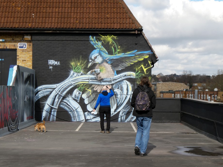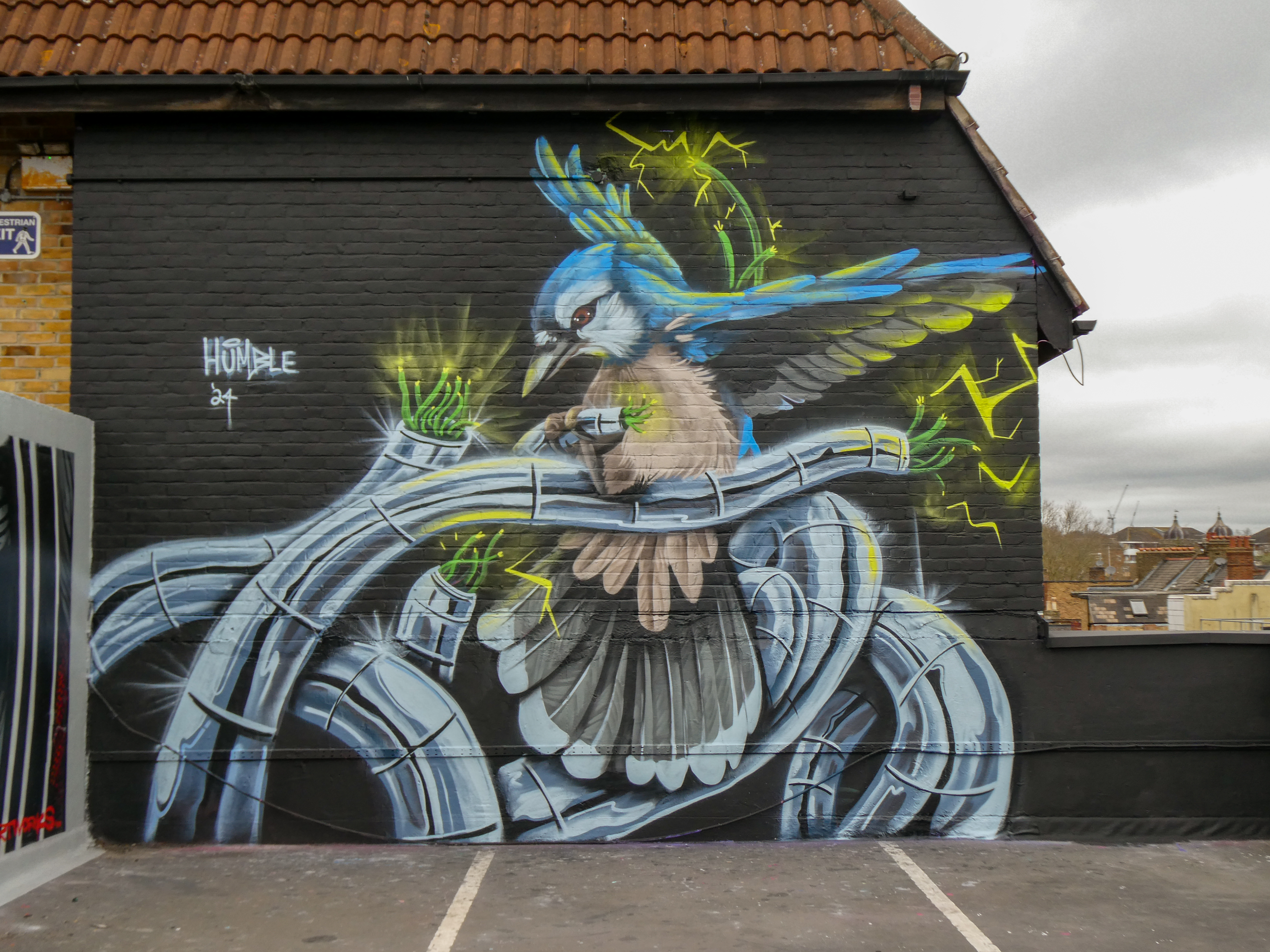 We have over the last year been exceptionally fortunate to have a had a number of international visitors who had previously been unknown to us or in some cases, having not even painted in London previously, pass through our corner of South-East London and leave there mark as part of our ongoing community street art project. One such artist was Humble who was passing through London earlier this year whilst over from New York, who took to the top of the Blenheim Centre above the high street at the heart of Penge and left this striking Blue Jay battling a series of electric limbs and setting to break free from the tentacle that bind us together. Certainly a fantastic piece and a pleasure to host such a talented artist. This striking work was placed up at the Penge Rooftop Gallery, Penge, and was put up with support from ourselves London Calling Blog.