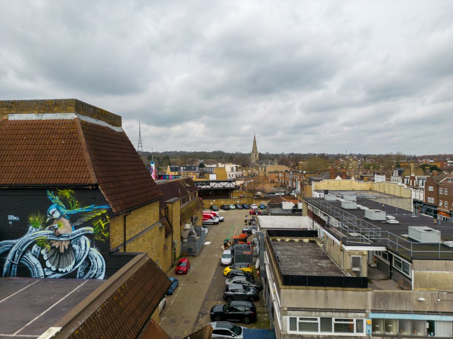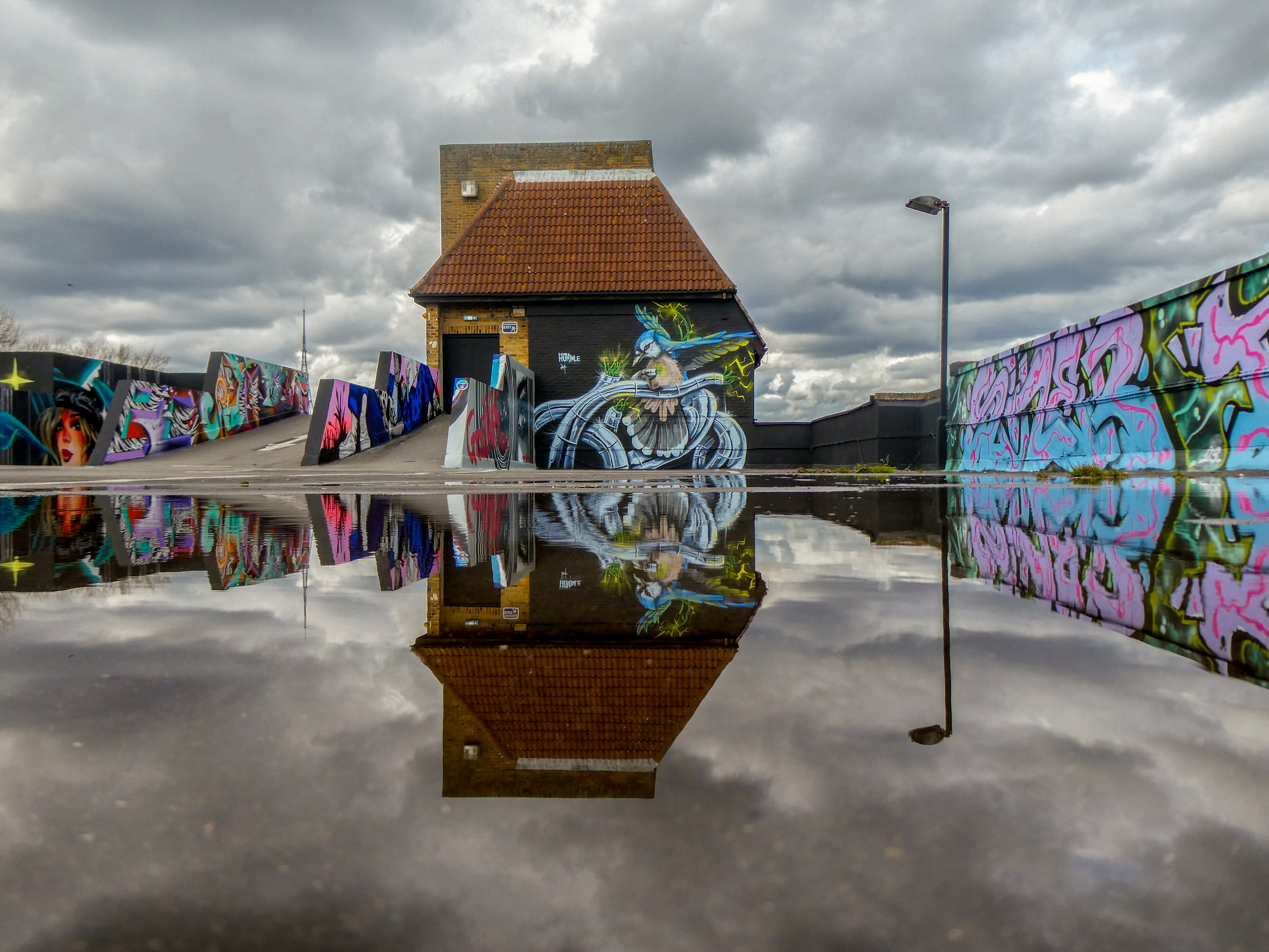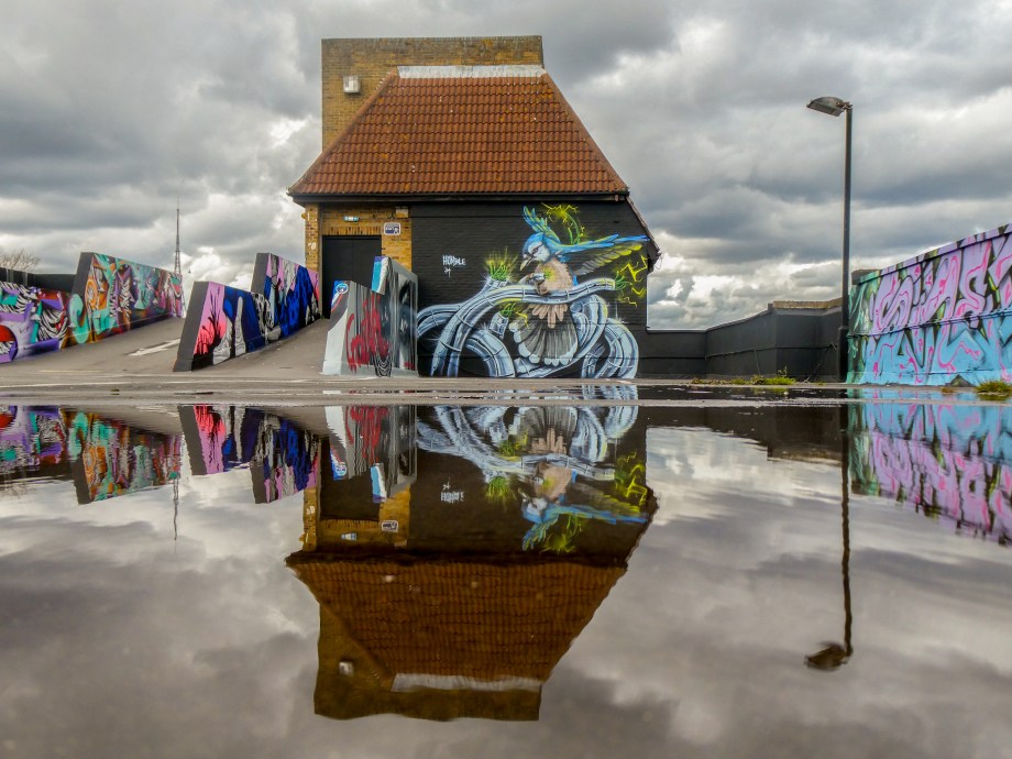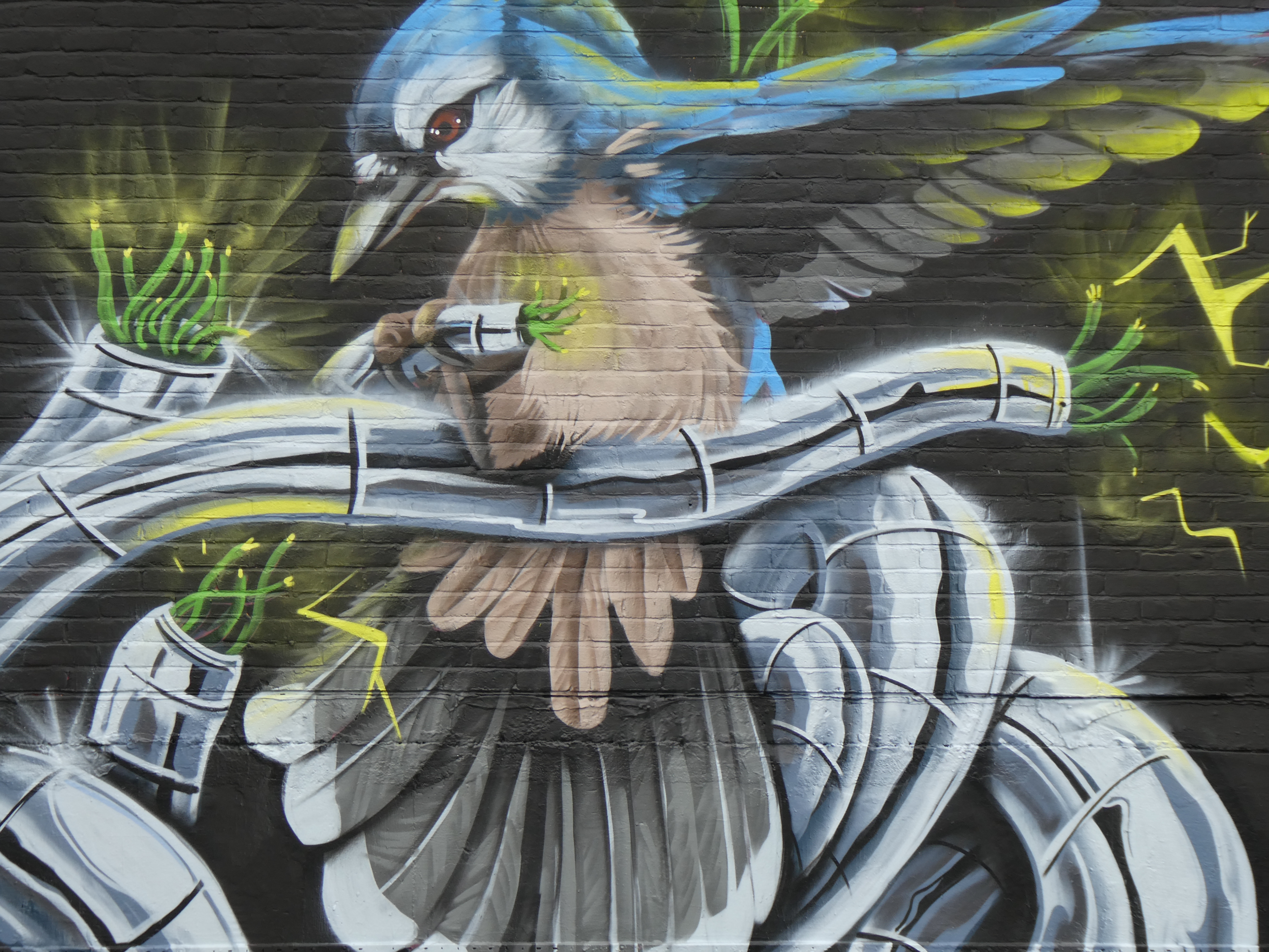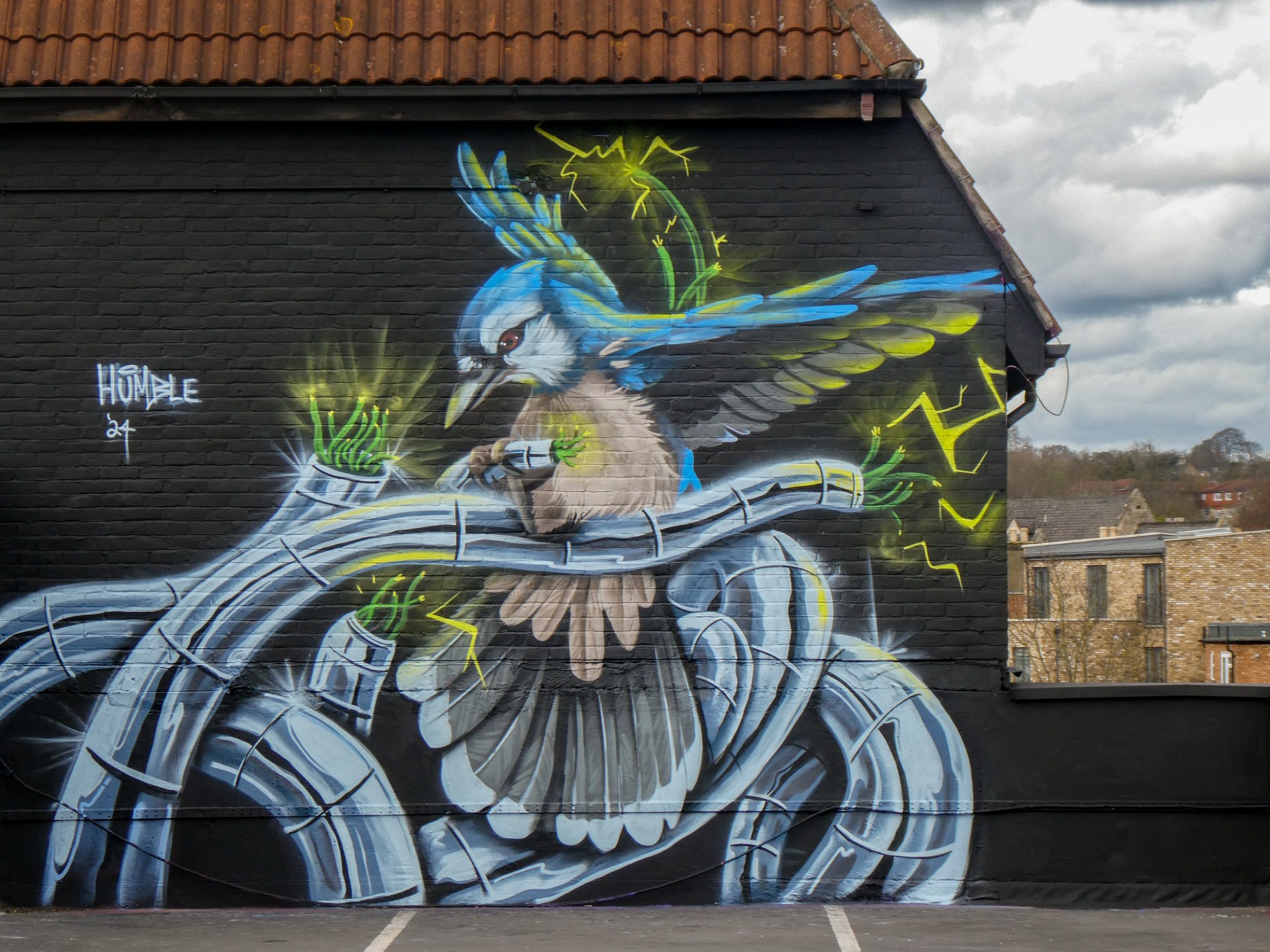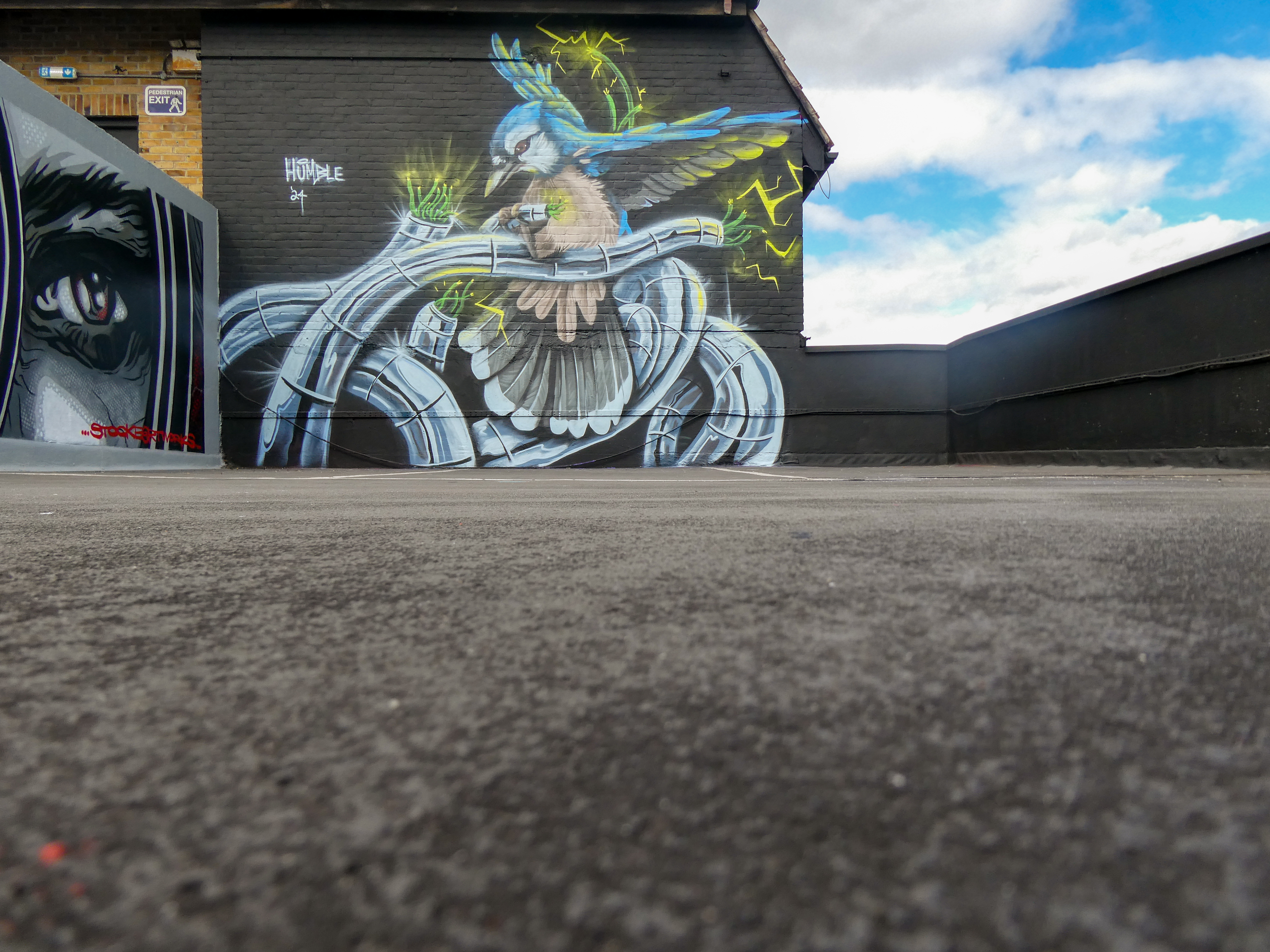 We have over the last year been exceptionally fortunate to have a had a number of international visitors who had previously been unknown to us or in some cases, having not even painted in London previously, pass through our corner of South-East London and leave there mark as part of our ongoing community street art project. One such artist was Humble who was passing through London earlier this year whilst over from New York, who took to the top of the Blenheim Centre above the high street at the heart of Penge and left this striking Blue Jay battling a series of electric limbs and setting to break free from the tentacle that bind us together. Certainly a fantastic piece and a pleasure to host such a talented artist. This striking work was placed up at the Penge Rooftop Gallery, Penge, and was put up with support from ourselves London Calling Blog.