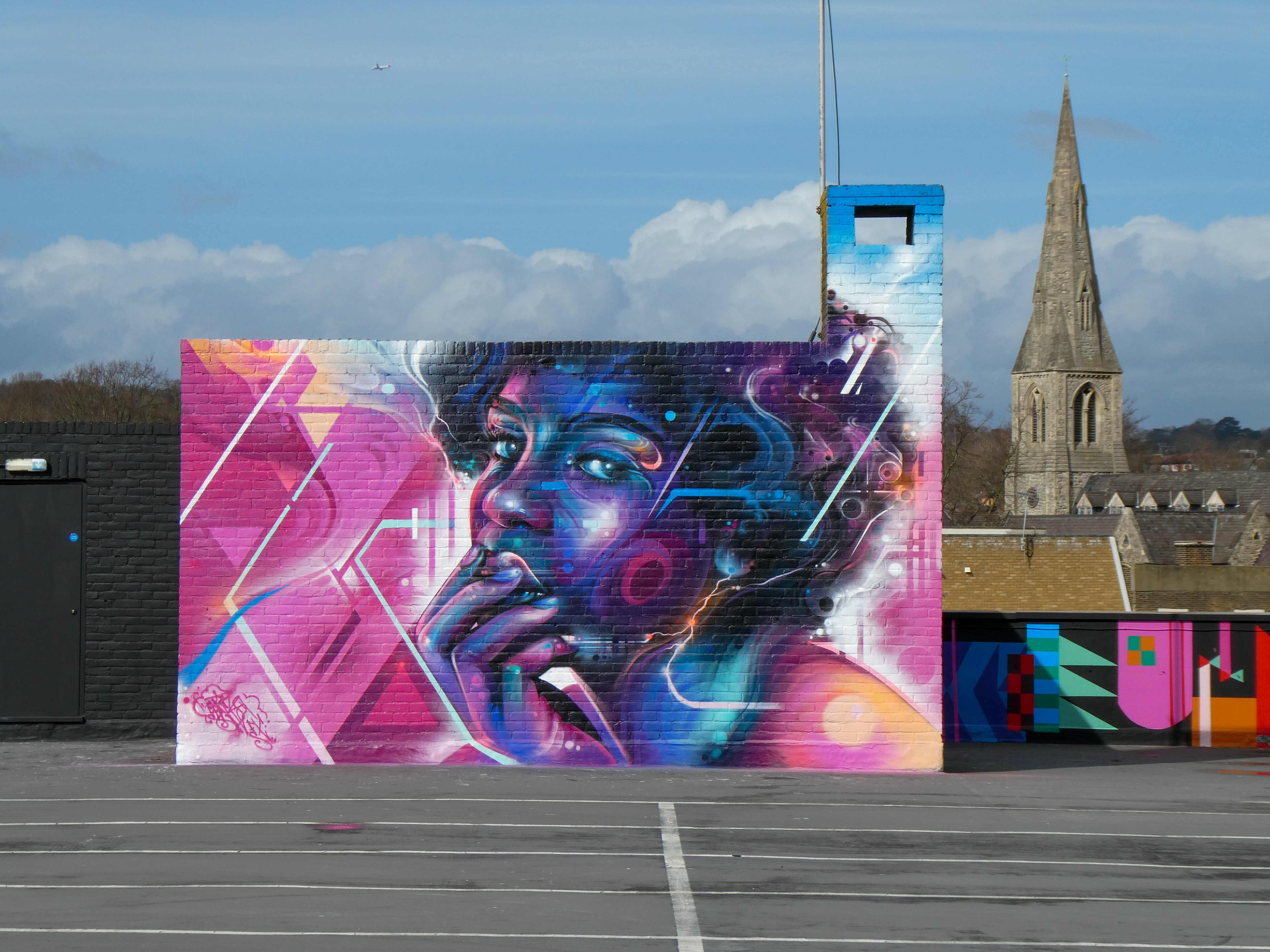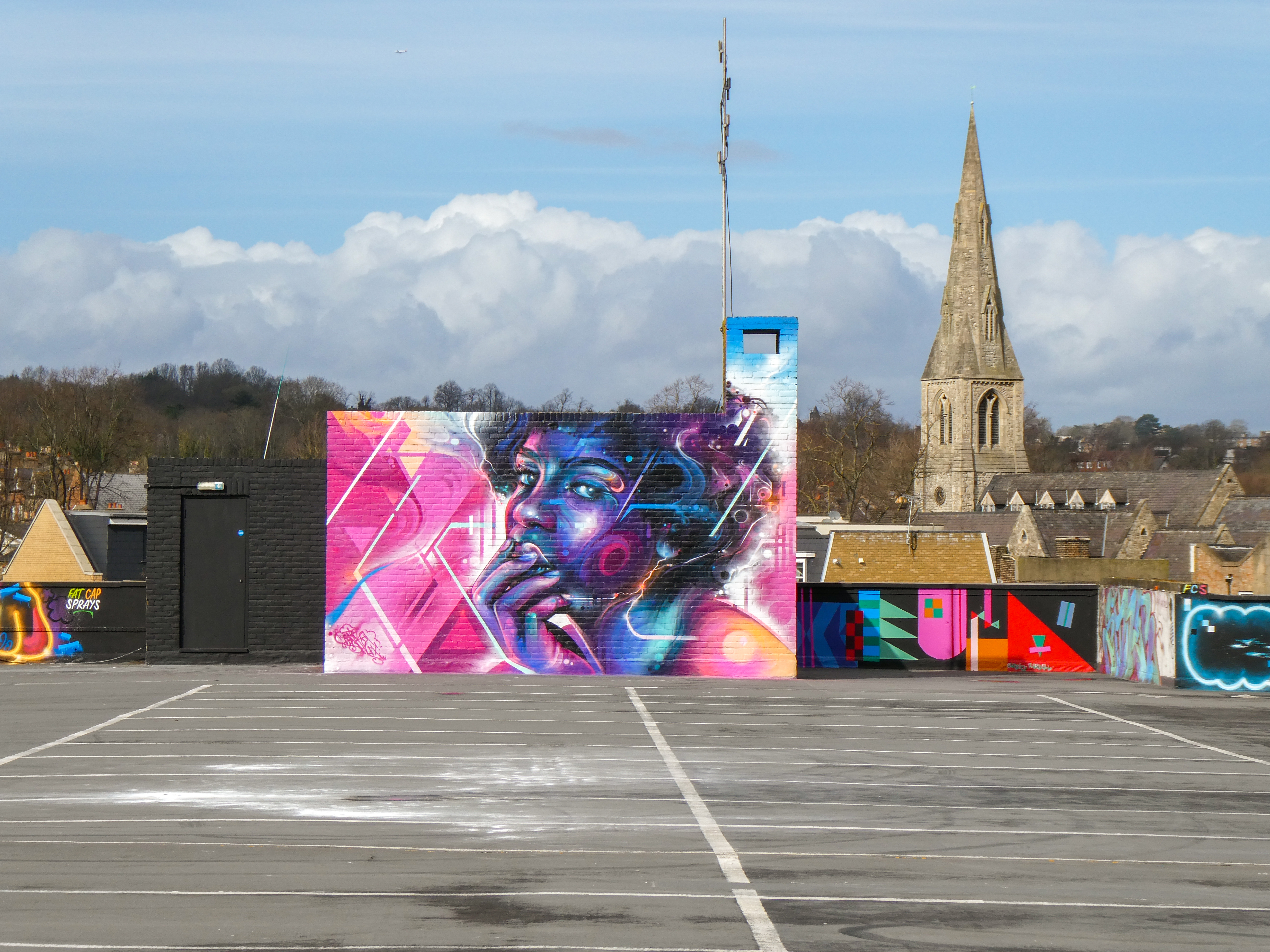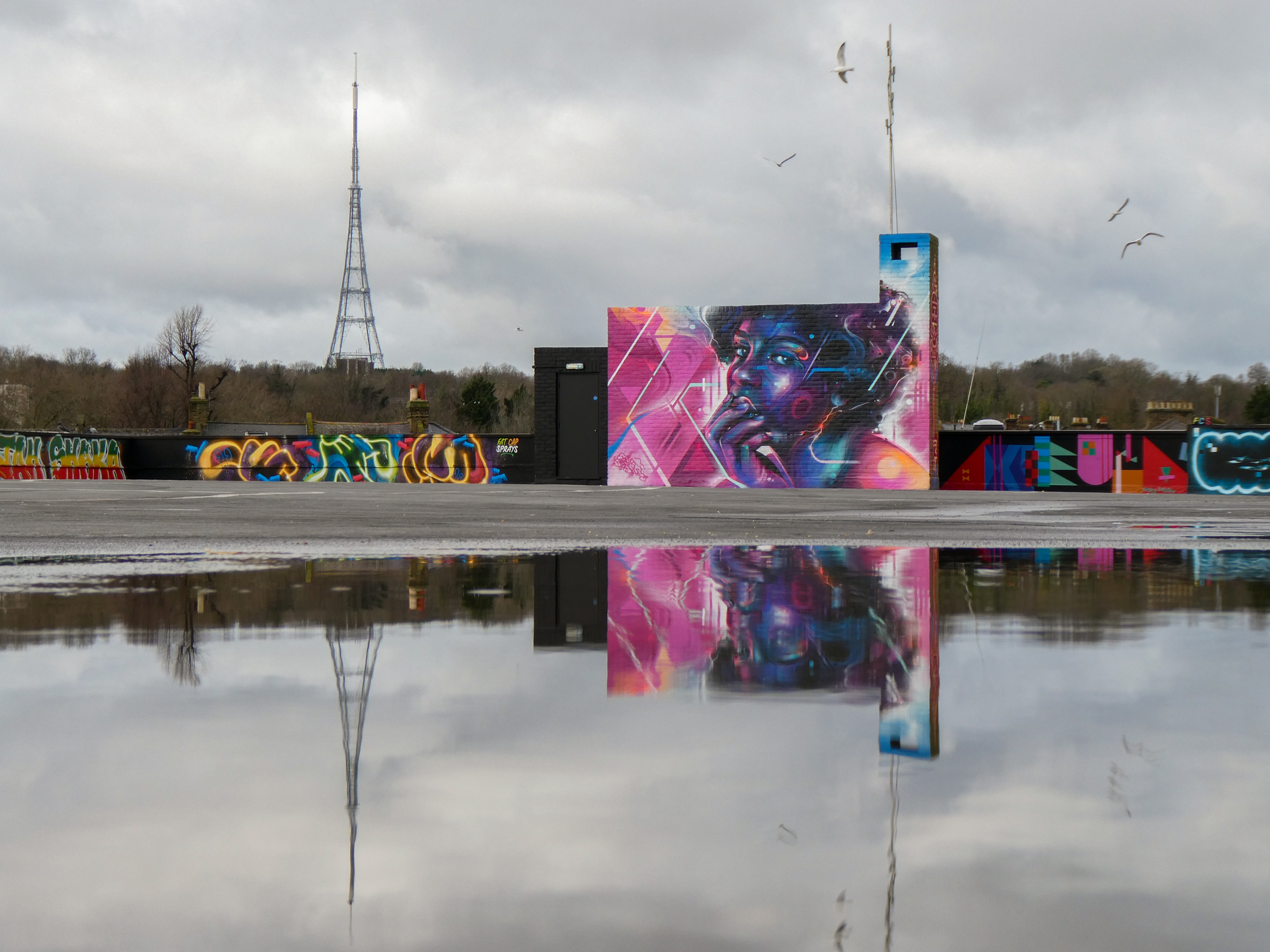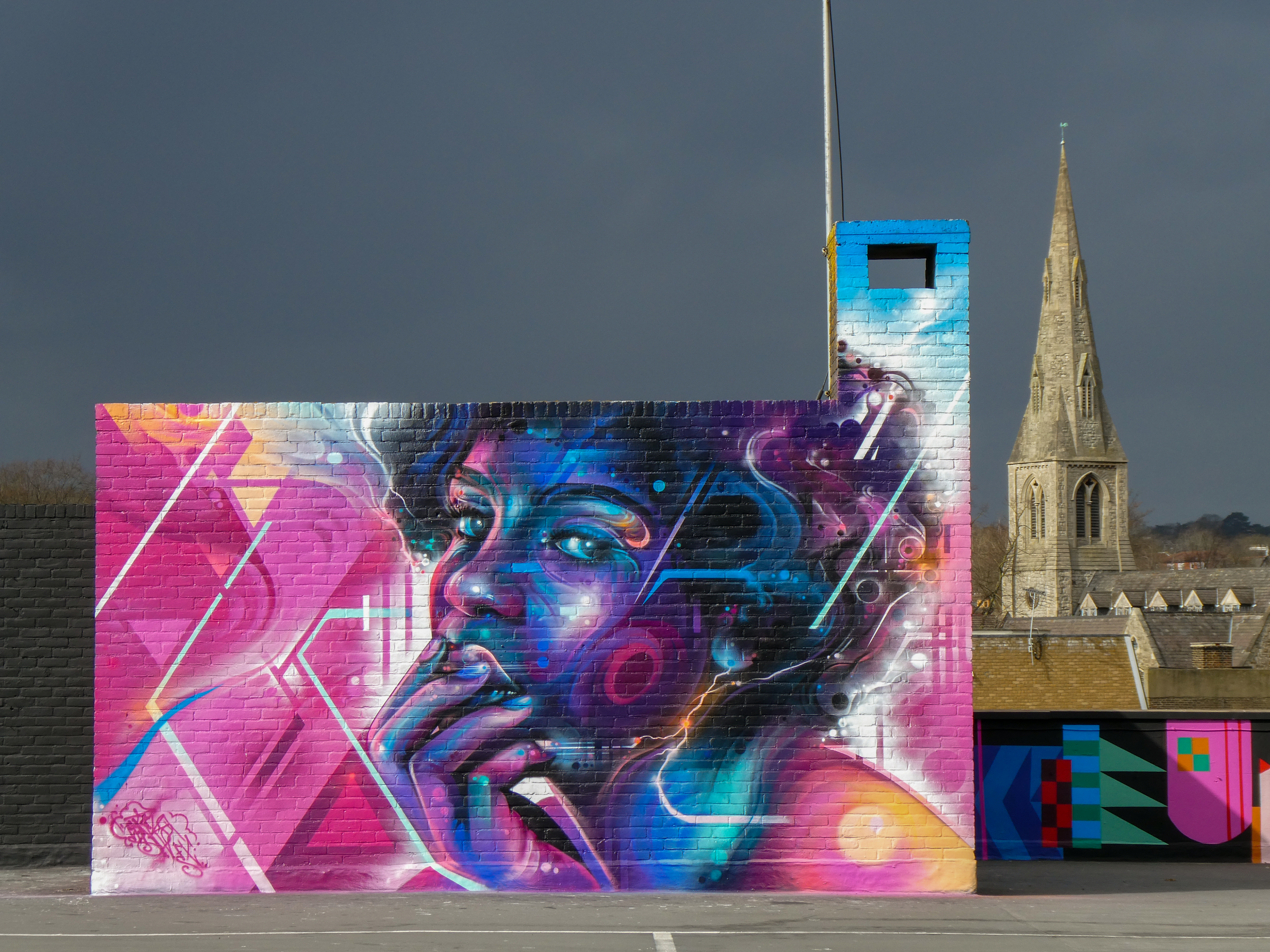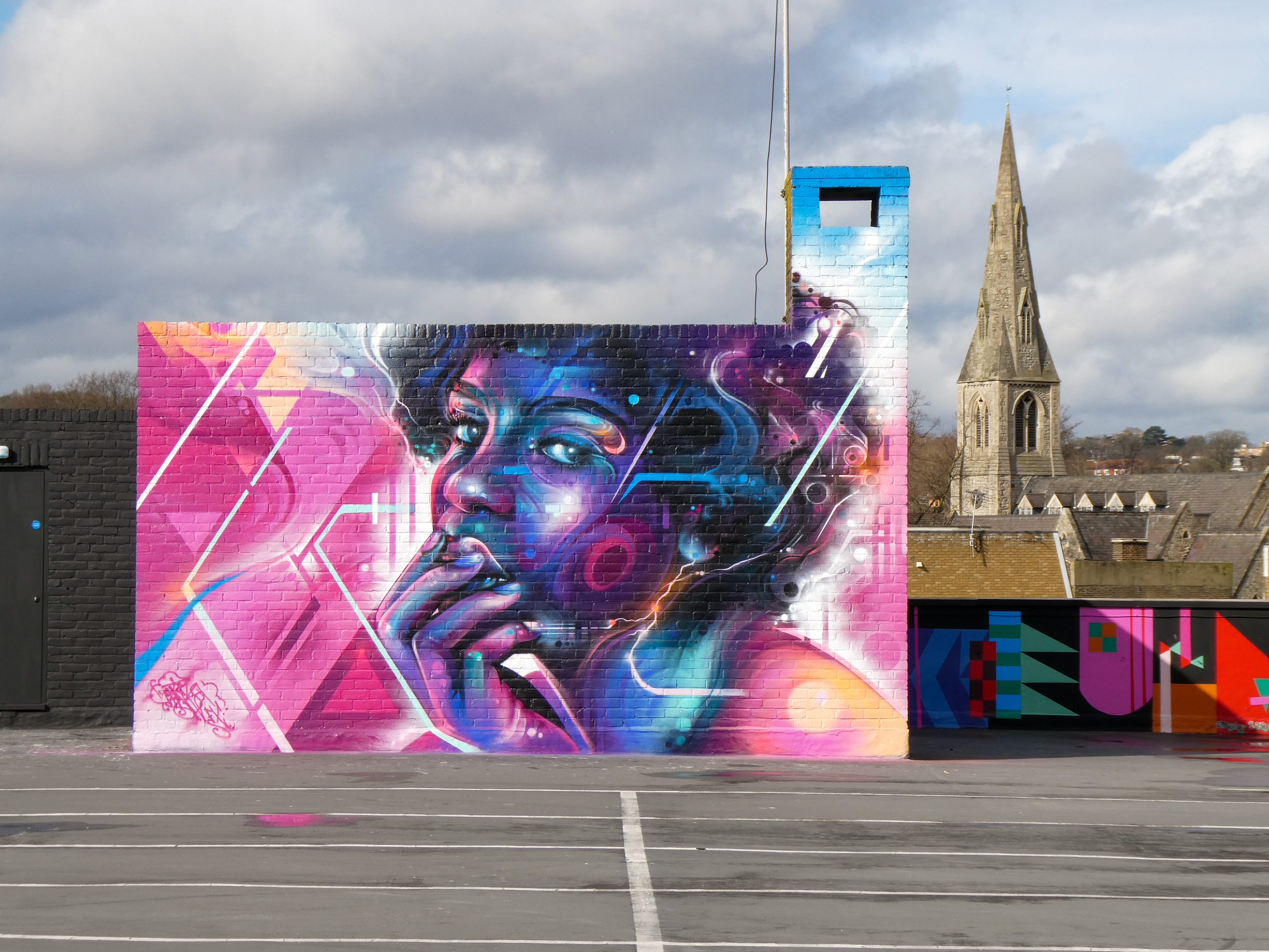 For our next post playing catch up with works and pieces we have had the pleasure of seeing in 2024, we are taking a look at a beautiful artwork by local and internationally acclaimed street artist Mr Cenz that was placed up in Penge at the end of the winter weather. The piece is immediately recognizable as being by Mr Cenz, presenting his distinct and striking colourful portraits featuring a black female subject fused with geometric dynamics depicted in the artist’s entirely original and trademark ‘futuristic space funk’ style. This stunning artwork was placed up at the Penge Rooftop Gallery, Penge, and was put up with support from ourselves London Calling Blog.