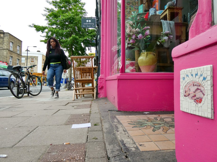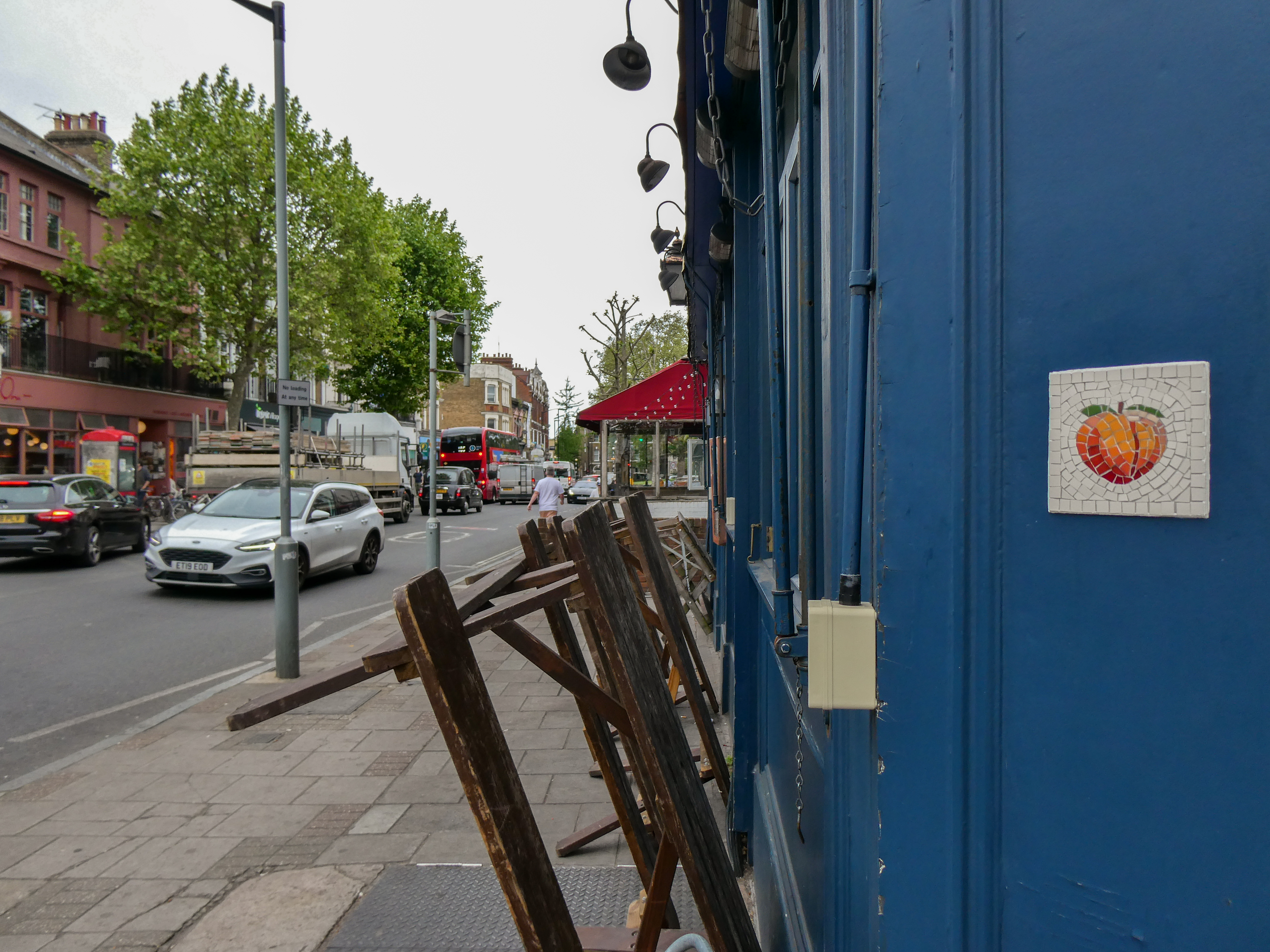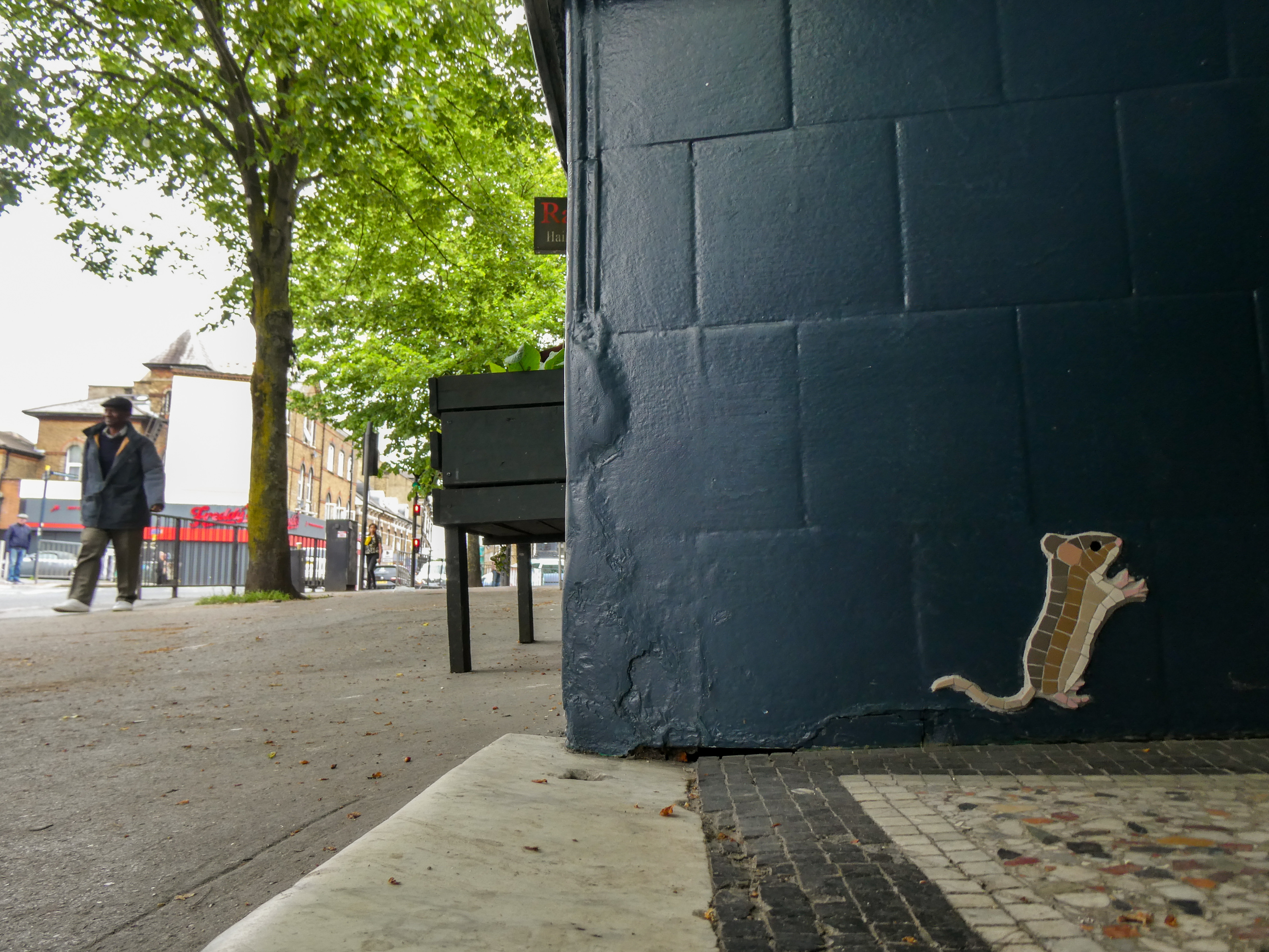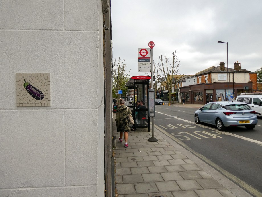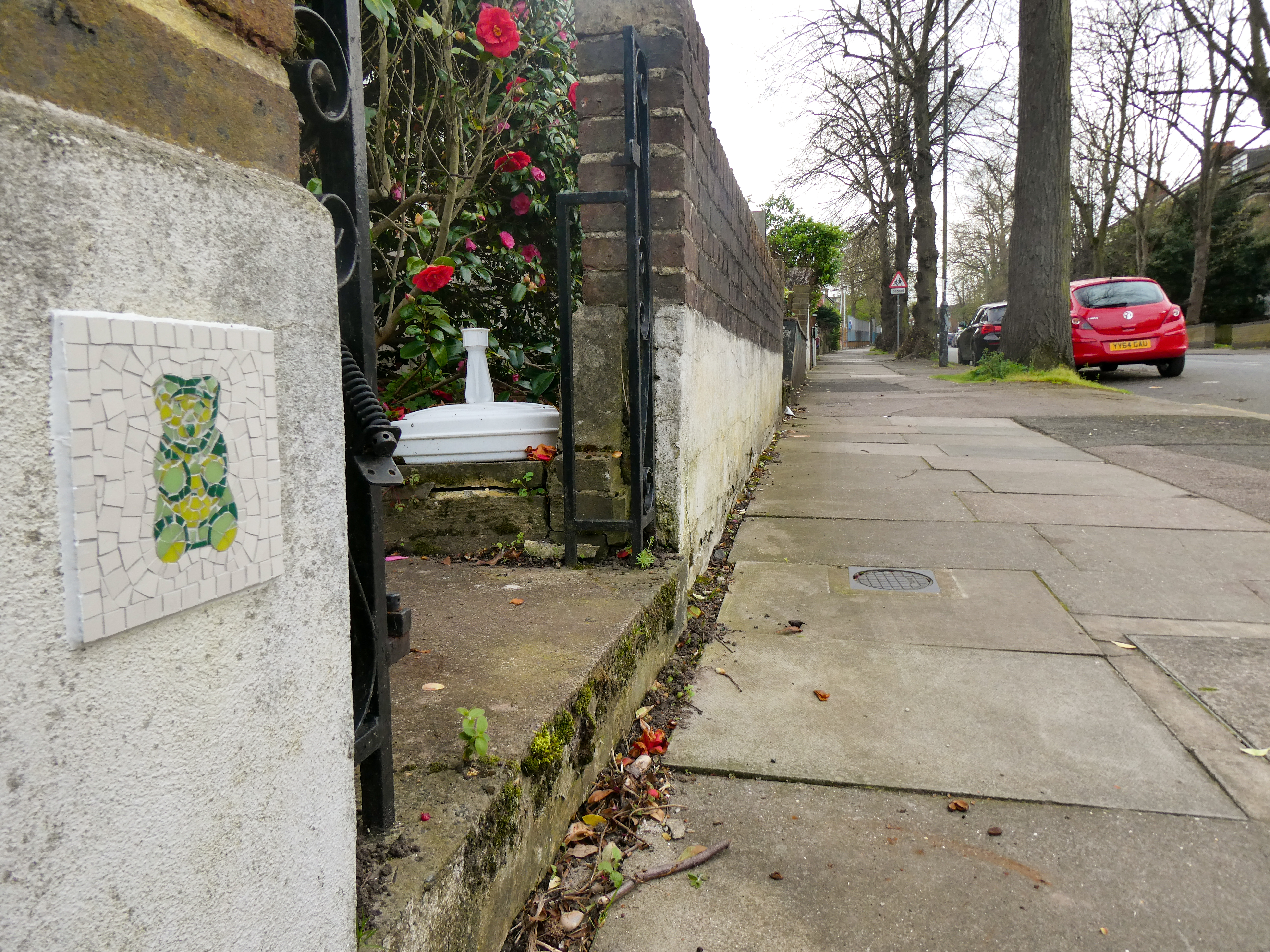 In Spring this year we met a very talented and original mosaic artist Corin Ashleigh Brown who had a selection of 16 mini mosaics comprising Corin’s Quirky Collection to place up ahead of a group exhibition in Dulwich they were participating in. As a result half of the collection went up in Dulwich and we were incredibly fortunate to be able to find spots for the other half about Penge. So if you are wandering around Penge or Dulwich if you keep your eyes peeled you may just see some of these excellent installation works with a very modern cross-section of subjects. If you do see any, please do let us know which ones and what your favourite is – for us its a between the sponge in Penge and the Croc shoe in Dulwich. We also have a couple of pics of a bonus mouse mosaic placed up at a cheese shop in Norwood. The works below in Penge were placed up with support from ourselves London Calling Blog for our SprayExhibition20 community mural project.