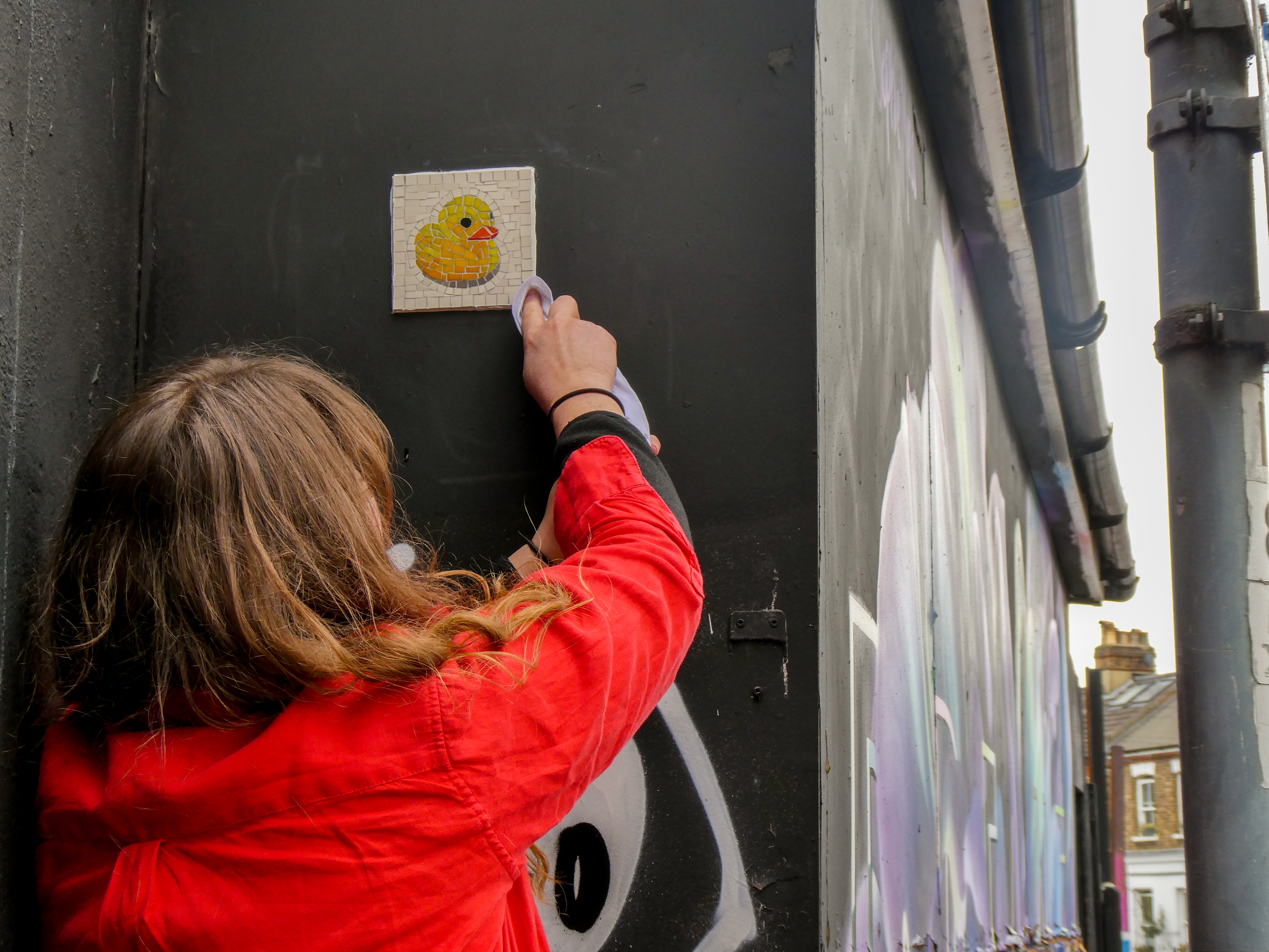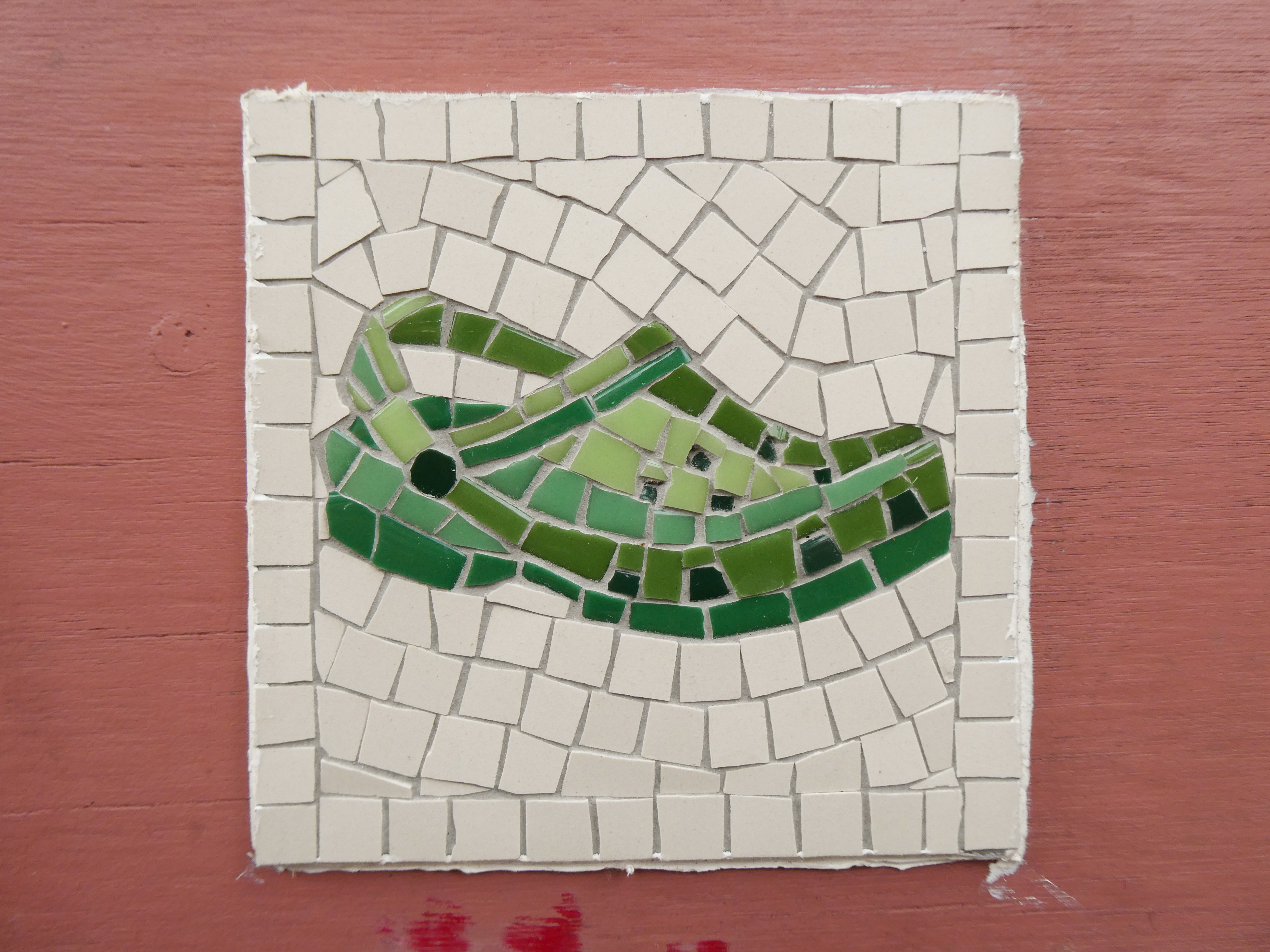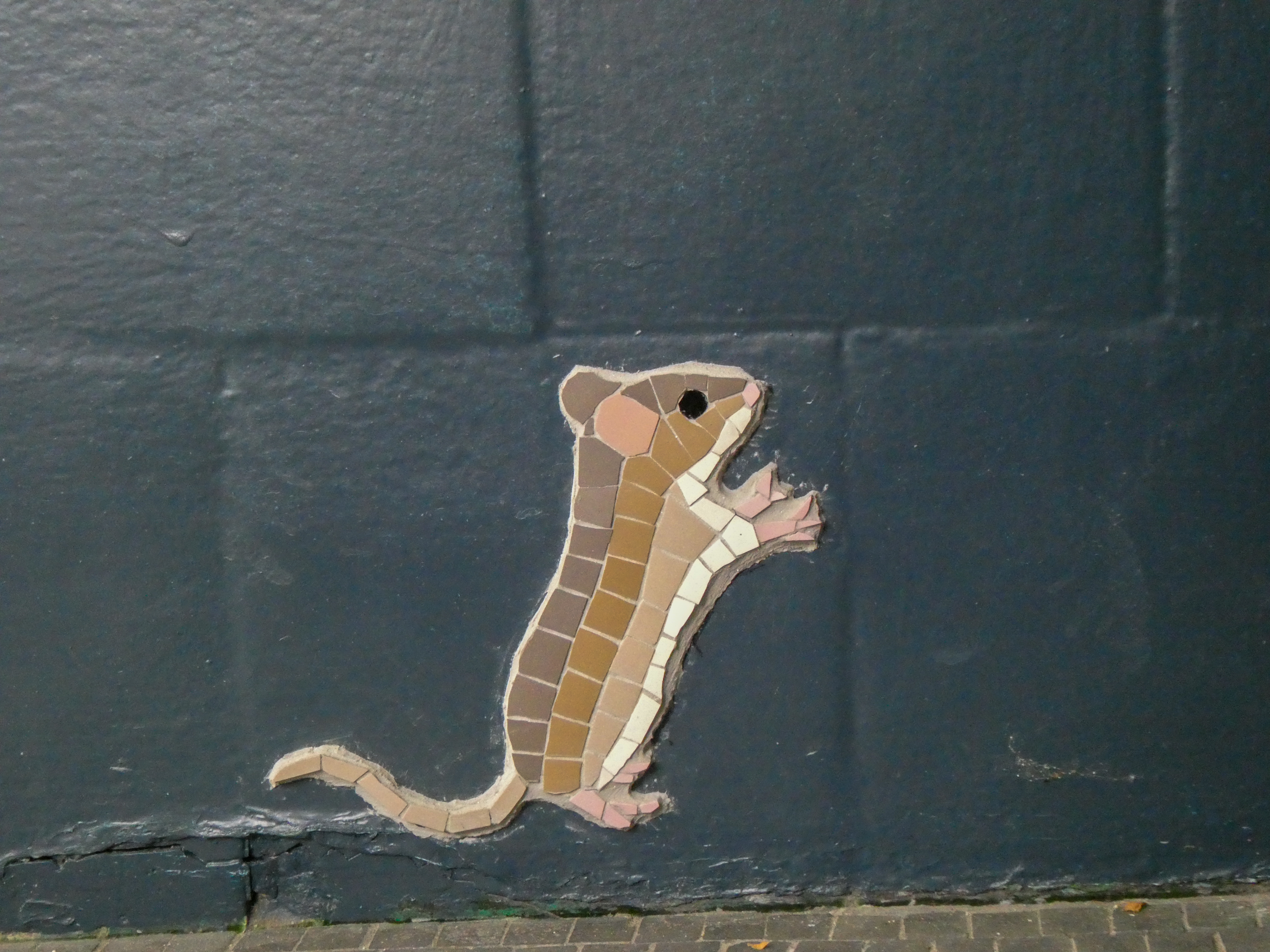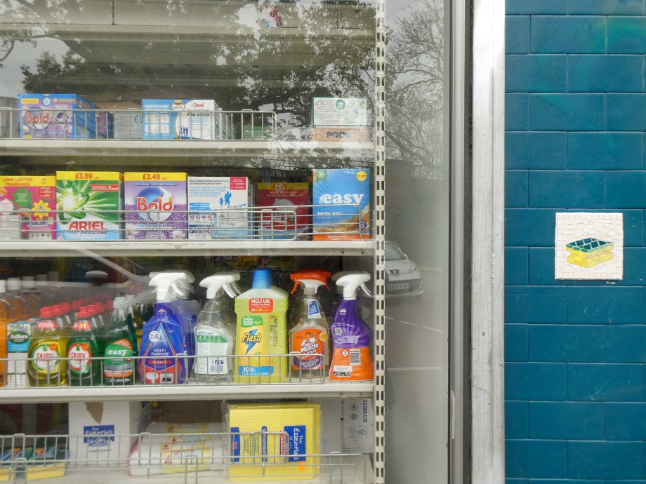 In Spring this year we met a very talented and original mosaic artist Corin Ashleigh Brown who had a selection of 16 mini mosaics comprising Corin’s Quirky Collection to place up ahead of a group exhibition in Dulwich they were participating in. As a result half of the collection went up in Dulwich and we were incredibly fortunate to be able to find spots for the other half about Penge. So if you are wandering around Penge or Dulwich if you keep your eyes peeled you may just see some of these excellent installation works with a very modern cross-section of subjects. If you do see any, please do let us know which ones and what your favourite is – for us its a between the sponge in Penge and the Croc shoe in Dulwich. We also have a couple of pics of a bonus mouse mosaic placed up at a cheese shop in Norwood. The works below in Penge were placed up with support from ourselves London Calling Blog for our SprayExhibition20 community mural project.