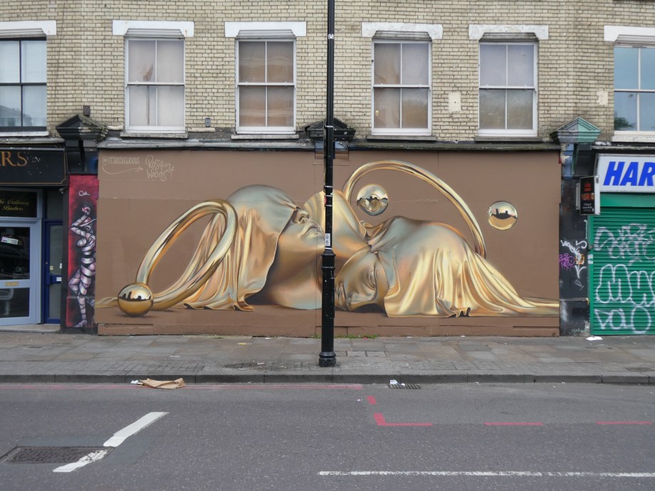 Earlier this year London received a visit from English born, but Australian based street artist Rosie Woods who offered a glimpse into the exciting new direction her work has taken through 2024. Rosie Wood’s work has shifted from a more flowing abstract focus to photorealistic golden entities – in this case in the form of two statue busts, with the heads covered by fabric. The new works are certainly impressively executed and striking in nature and we for one look forward to seeing where this artist takes this styling and hope it isn’t too long before she returns to London to leave some fresh additions to the ever changing scene about the City. The stunning work below was placed up in Old Street, Shoreditch, and at the very bottom we have a collaboration with David Speen that is placed up along Kingsland Road heading towards Hackney.