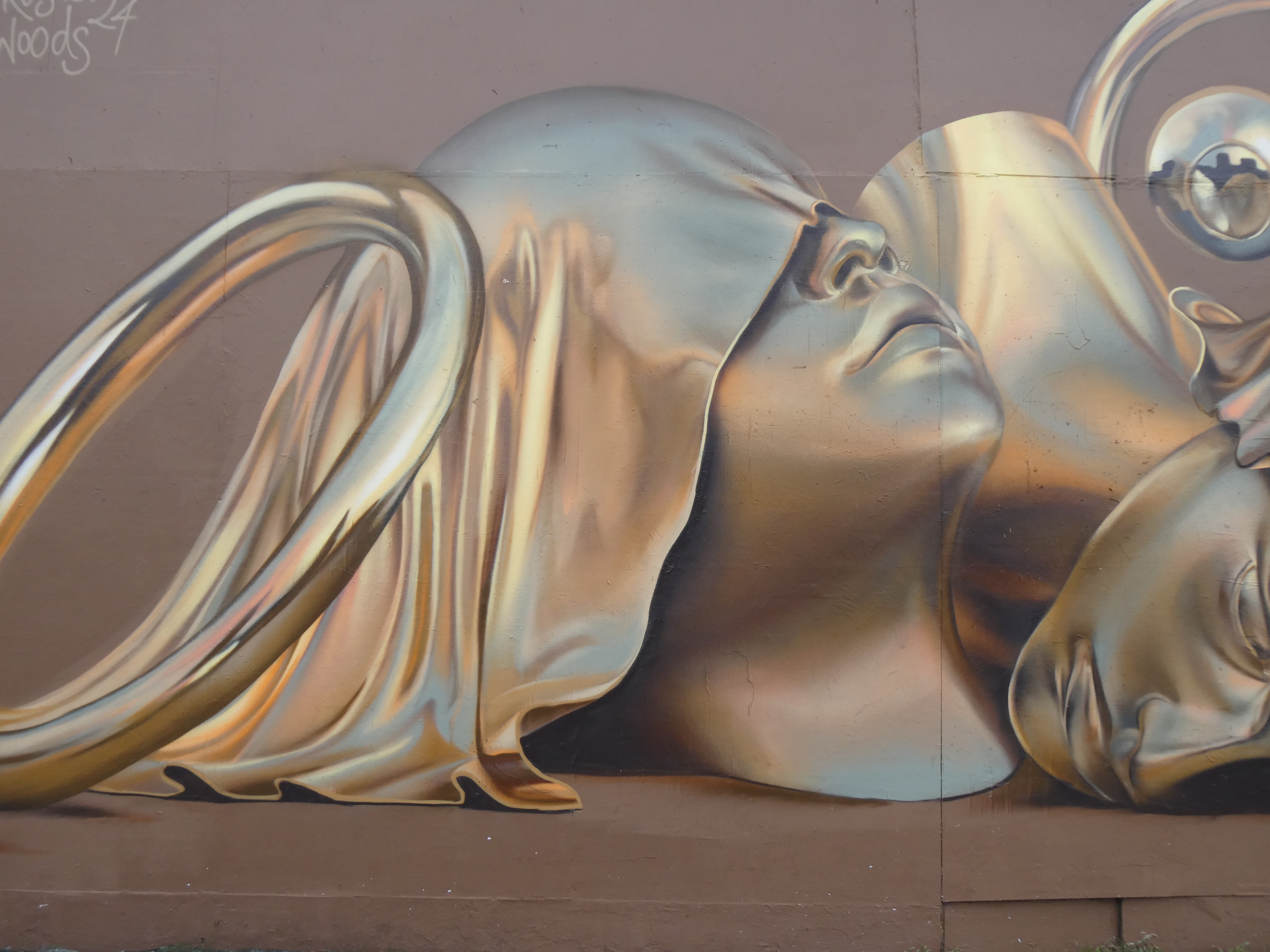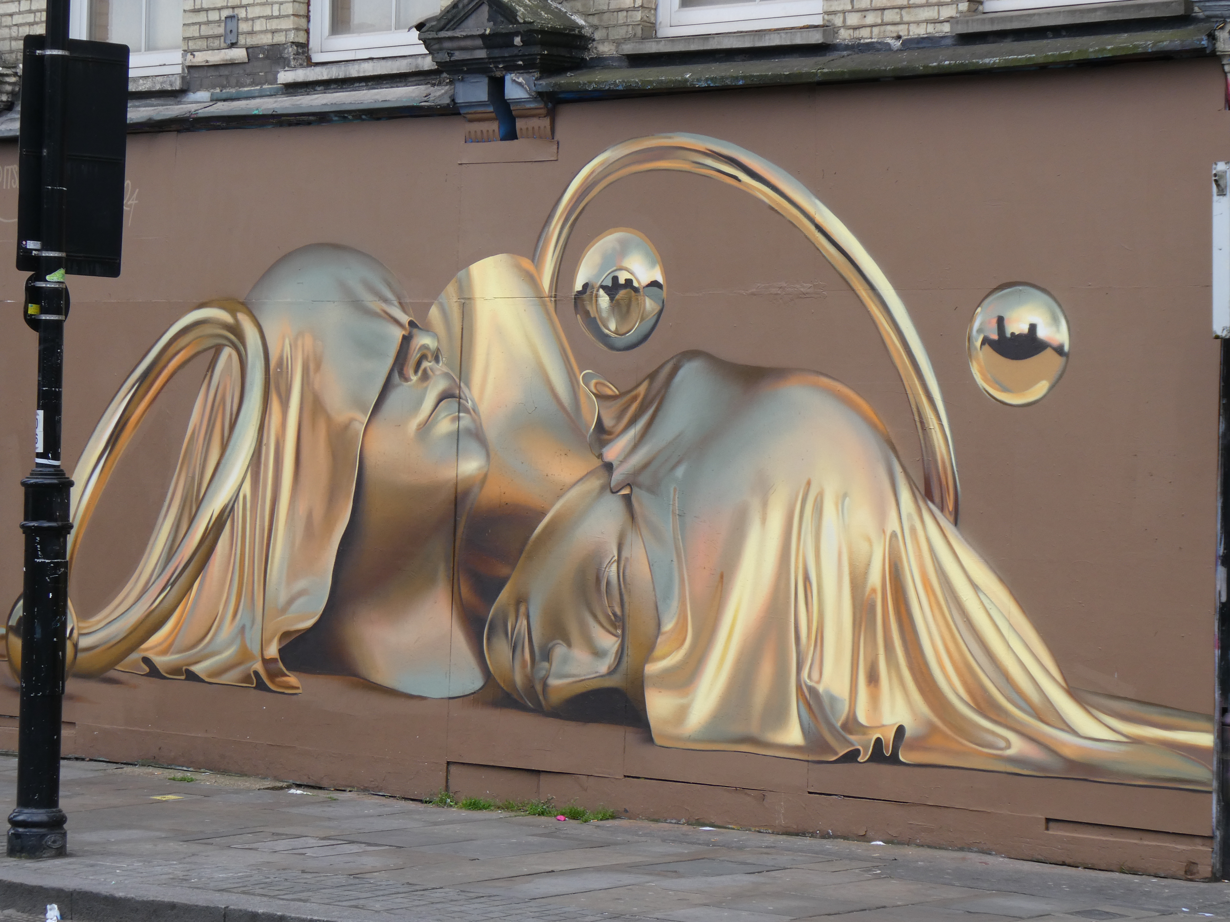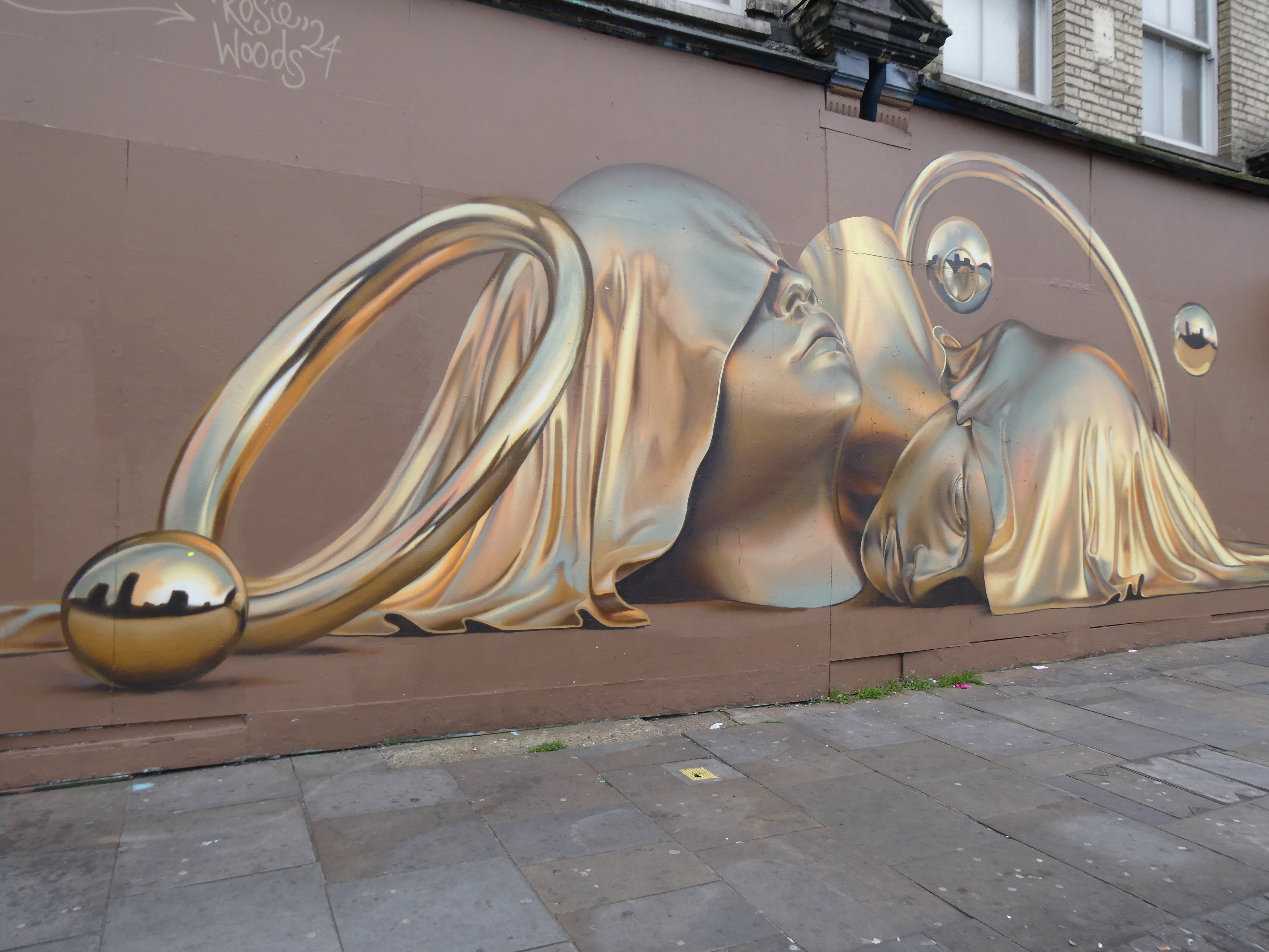 Earlier this year London received a visit from English born, but Australian based street artist Rosie Woods who offered a glimpse into the exciting new direction her work has taken through 2024. Rosie Wood’s work has shifted from a more flowing abstract focus to photorealistic golden entities – in this case in the form of two statue busts, with the heads covered by fabric. The new works are certainly impressively executed and striking in nature and we for one look forward to seeing where this artist takes this styling and hope it isn’t too long before she returns to London to leave some fresh additions to the ever changing scene about the City. The stunning work below was placed up in Old Street, Shoreditch, and at the very bottom we have a collaboration with David Speen that is placed up along Kingsland Road heading towards Hackney.