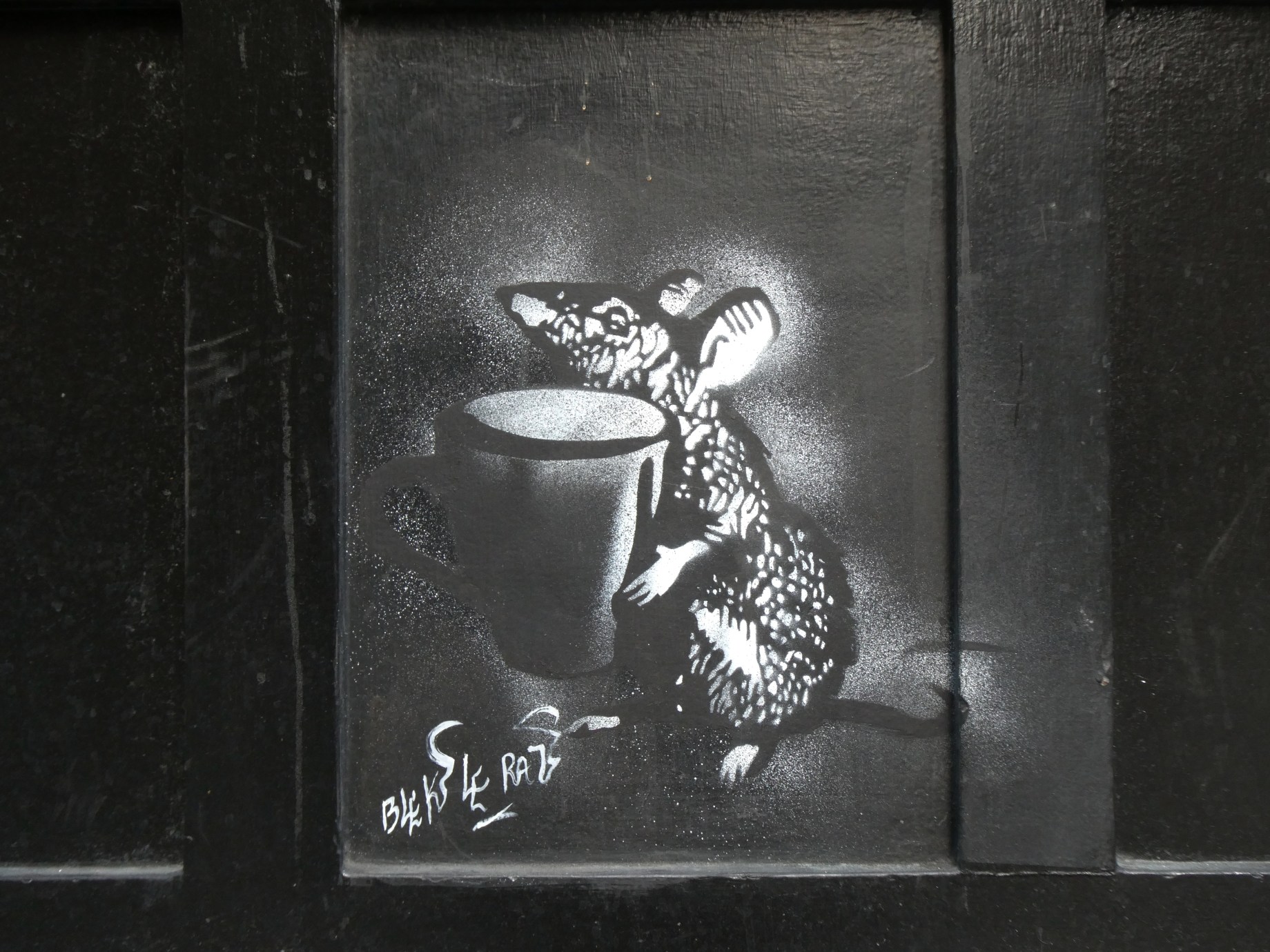 Earlier this year French street artist Xavier Prou, aka Blek le Rat – the original stencil artist was in London for a show of his work and whilst here hit up a few pieces, with one in Leake Street, that is currently buried under perspex and two little rat stencils in Soho. It was an exceptional treat to have such a historically significant figure in the scene, someone who has been painting for over forty years, having first started painting in Paris in 1981, pass through London and leave a pair of his iconic rats up. Taking to the shop front of a coffee shop in Soho, he placed up one rat carrying a sparkler and the other carrying a coffee mug. These fantastic mini-stencils can be found in Beak Street, Soho.