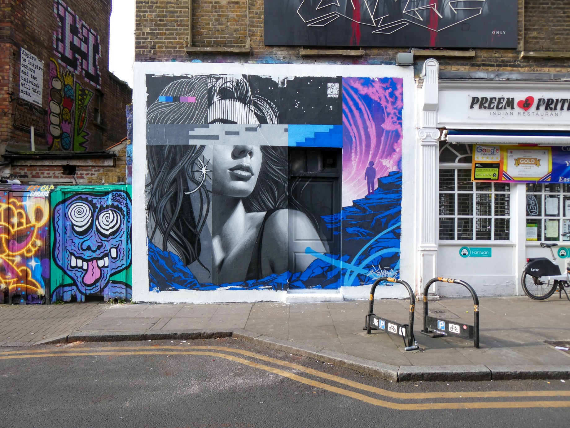 Earlier this year whilst on an early morning cycle through Brick Lane we were incredibly fortunate to stumble across this absolutely incredible and captivating artwork by Spanish born, but London based, street artist Jay Kaes. Through his work Jay Kaes explores concepts of reality and illusion through a glitched experience of the world, fusing reality with the digital realm. For this striking work titled ‘Beyond the Illusion’, which presents a more photorealistic depiction in the portraiture aspect of the work than pieces we have previously seen from this artist, Jay Kaes explores the idea of “seeing beyond the surface of reality”. It is always a pleasure to see fresh art from this artist, of whom we are a huge fan, around London, especially as it happens less and less these days as this artist is very busy painting the world over. This exceptional artwork can be found in Hanbury Street, Brick Lane, and was put up with support from Not Banksy Forum.