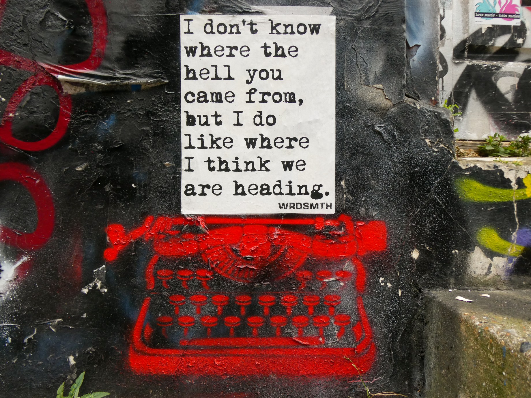 In May this year London received a visit from American street artist WRSMTH, who as whenever he is visiting London, embarked on a flurry of activity, hitting pieces up all over the place. When WRDSMTH has visited an area of London, for the coming days and weeks, you cannot move for seeing typewriters. Unsurprisingly WRSMTH was by profession a writer, based in LA, prior to his change of career as a Street Artist. He is a published writer and works on TV scripts and writing for documentaries. So with this in mind it is no wonder that his contribution to Street Art is to utilize his talent for writing as a creative outlet. Inspired by the Street Art scene upon moving to LA and initially planning to work in the medium of stickers, WRDSMTH then opted for to create his trademark typewriter stencil and to make the script a piece of paper wheat-pasted above, which in turn is at the very heart of WRDSMTH’s works. Offering a range of statements from humorous witticisms to touching messages of hope, love and freedom, these works do just make you smile upon observing. The superb selection of works were placed up around Brick Lane and Shoreditch.