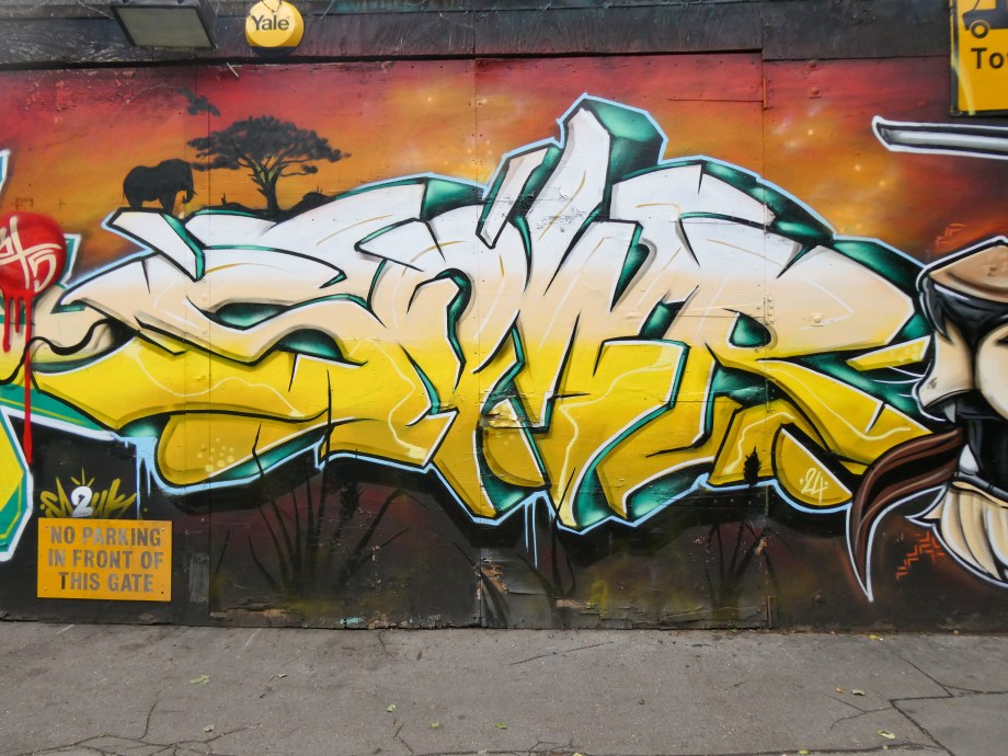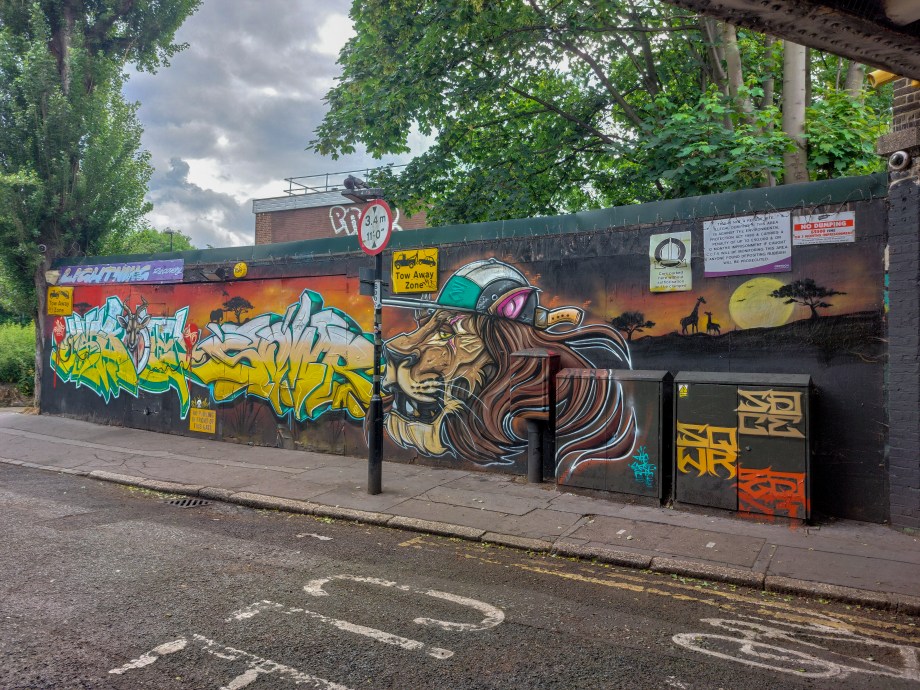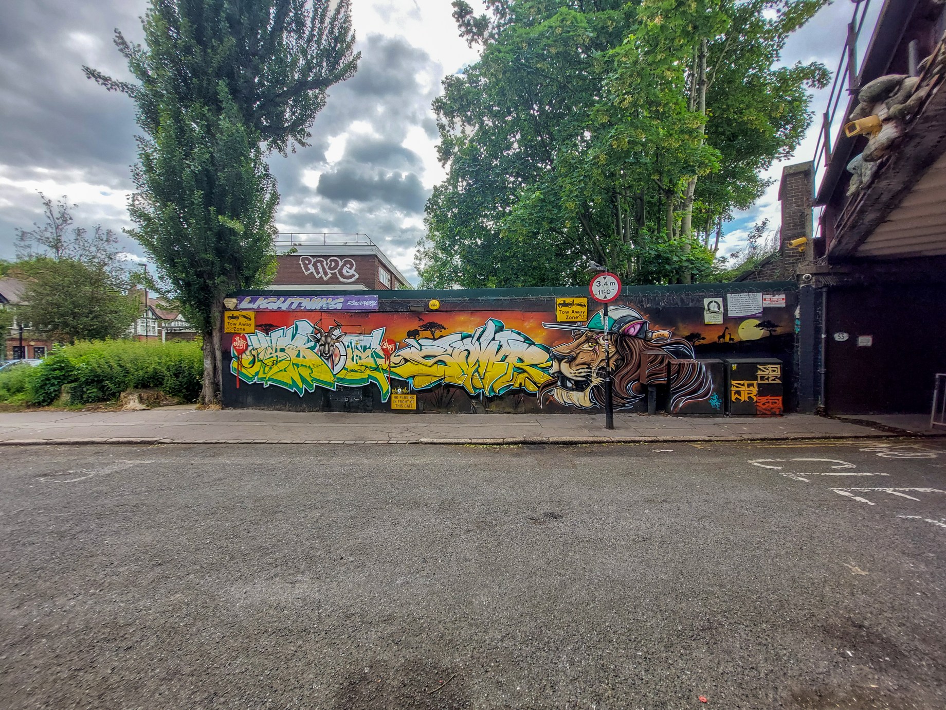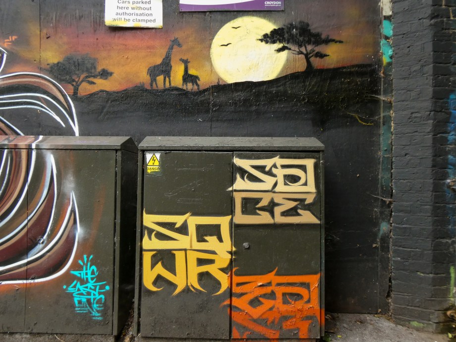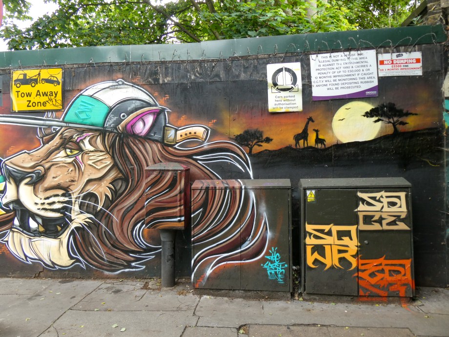 One of our favourite things is seeing street art and graffiti in places that are either devoid of, or have very little, art about. As Spring took over London on our morning commute we came upon a fantastic three person graffiti production in Selhurst by UK graffiti writers Skewer and Last, as well as visiting South African graffiti writer Sace. The trio hit up this fantastic collaborative effort themed on the African Savannah at sunset, with the skyline silhouetted behind Skewer and Sace’s letters and Last’s funky lion character. The piece really injects some life into the area and continues to be a pleasure to see on a regular basis when out and about. This superb production can be found in Dagnall Park, Selhurst, just behind the back of Selhurst Station.