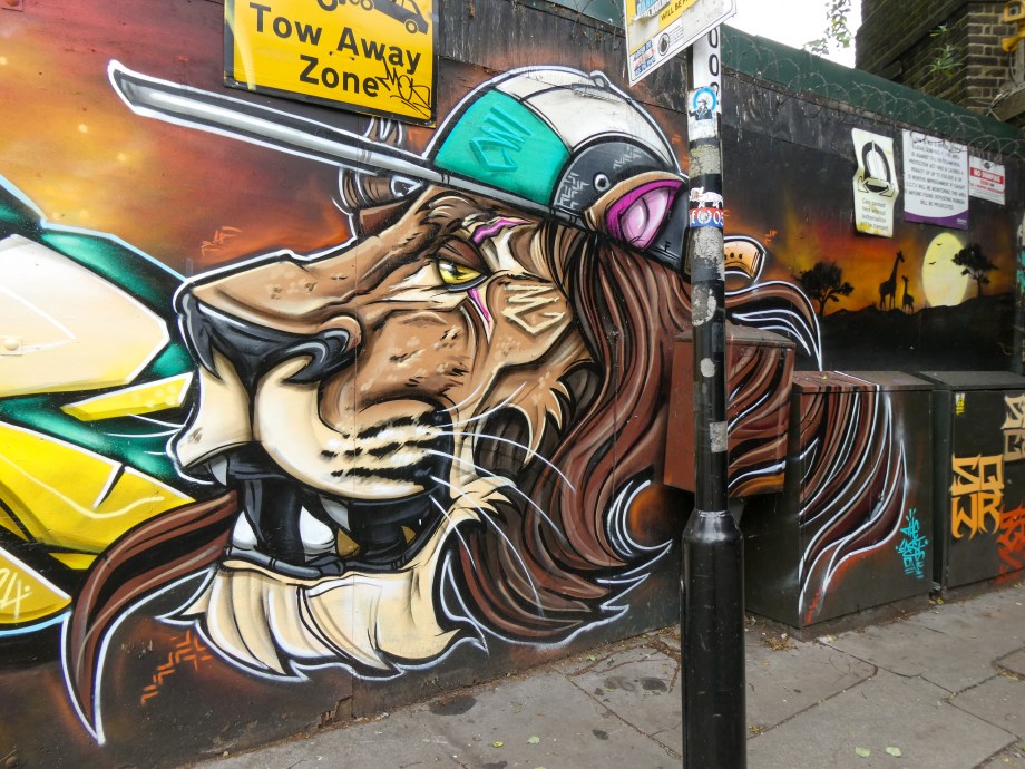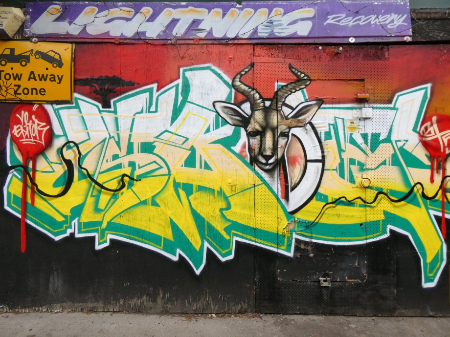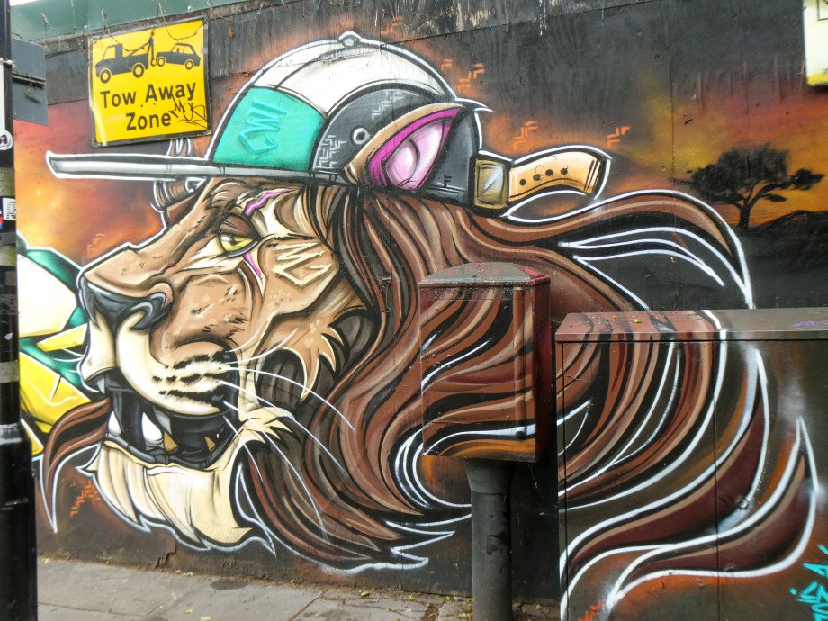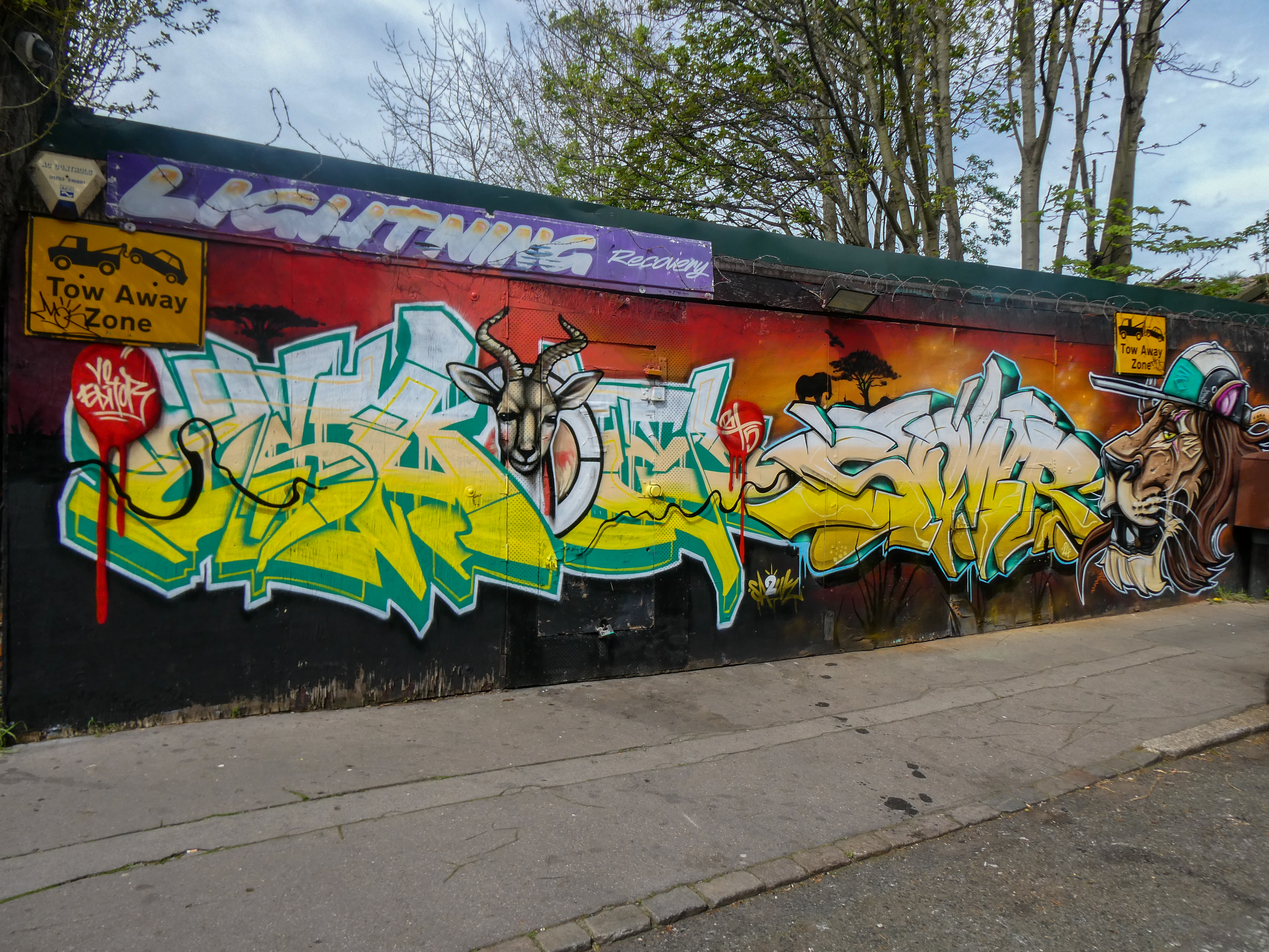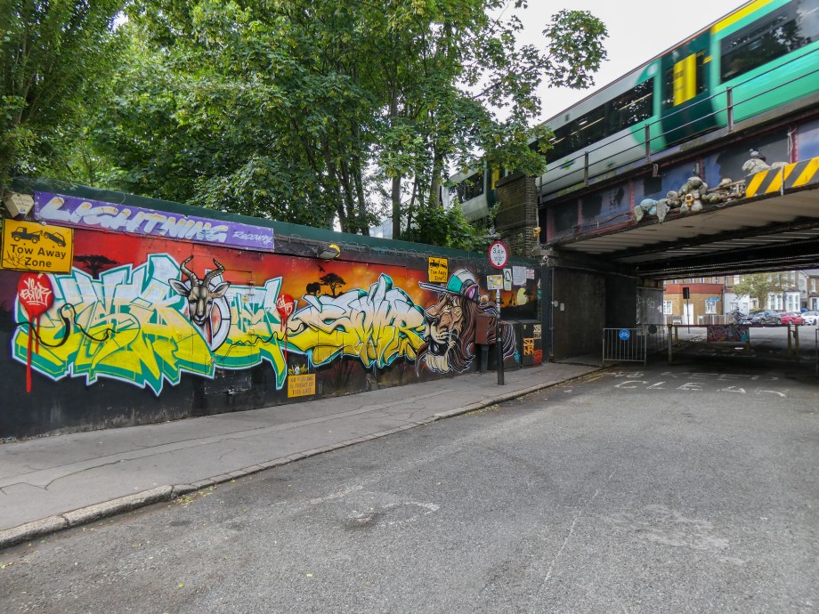 One of our favourite things is seeing street art and graffiti in places that are either devoid of, or have very little, art about. As Spring took over London on our morning commute we came upon a fantastic three person graffiti production in Selhurst by UK graffiti writers Skewer and Last, as well as visiting South African graffiti writer Sace. The trio hit up this fantastic collaborative effort themed on the African Savannah at sunset, with the skyline silhouetted behind Skewer and Sace’s letters and Last’s funky lion character. The piece really injects some life into the area and continues to be a pleasure to see on a regular basis when out and about. This superb production can be found in Dagnall Park, Selhurst, just behind the back of Selhurst Station.