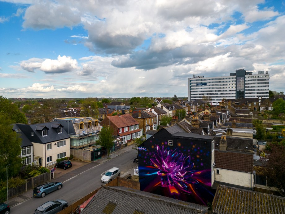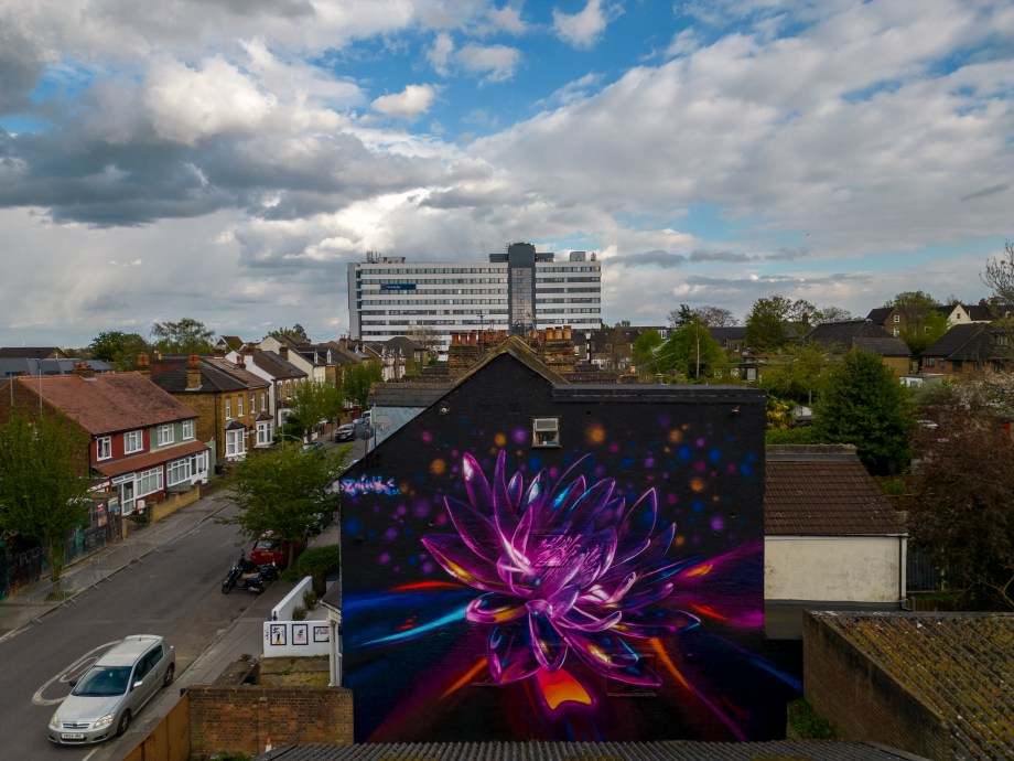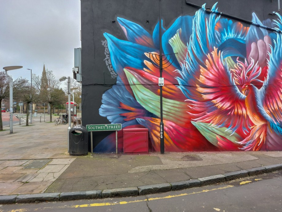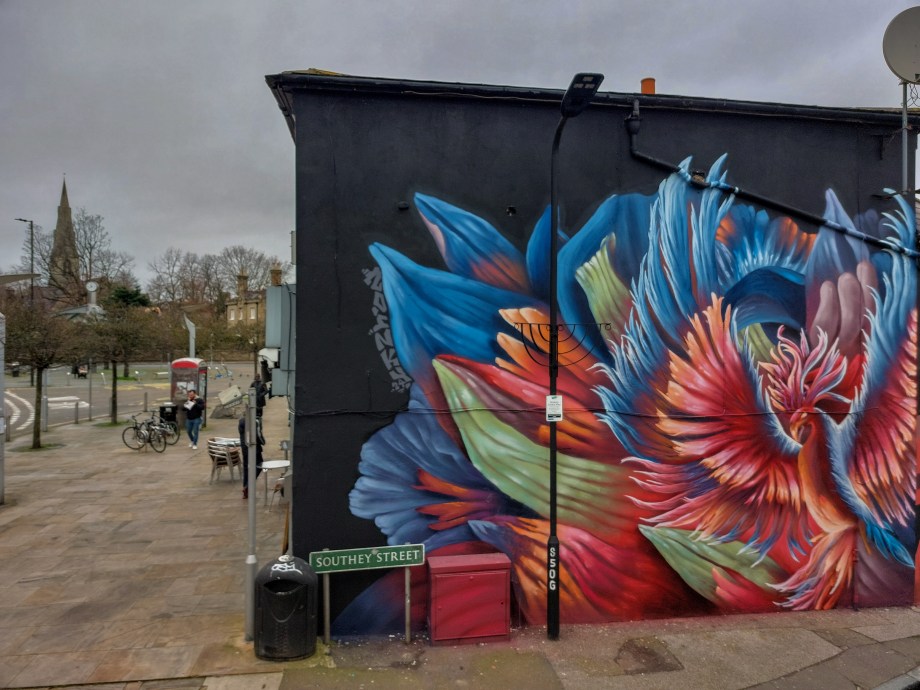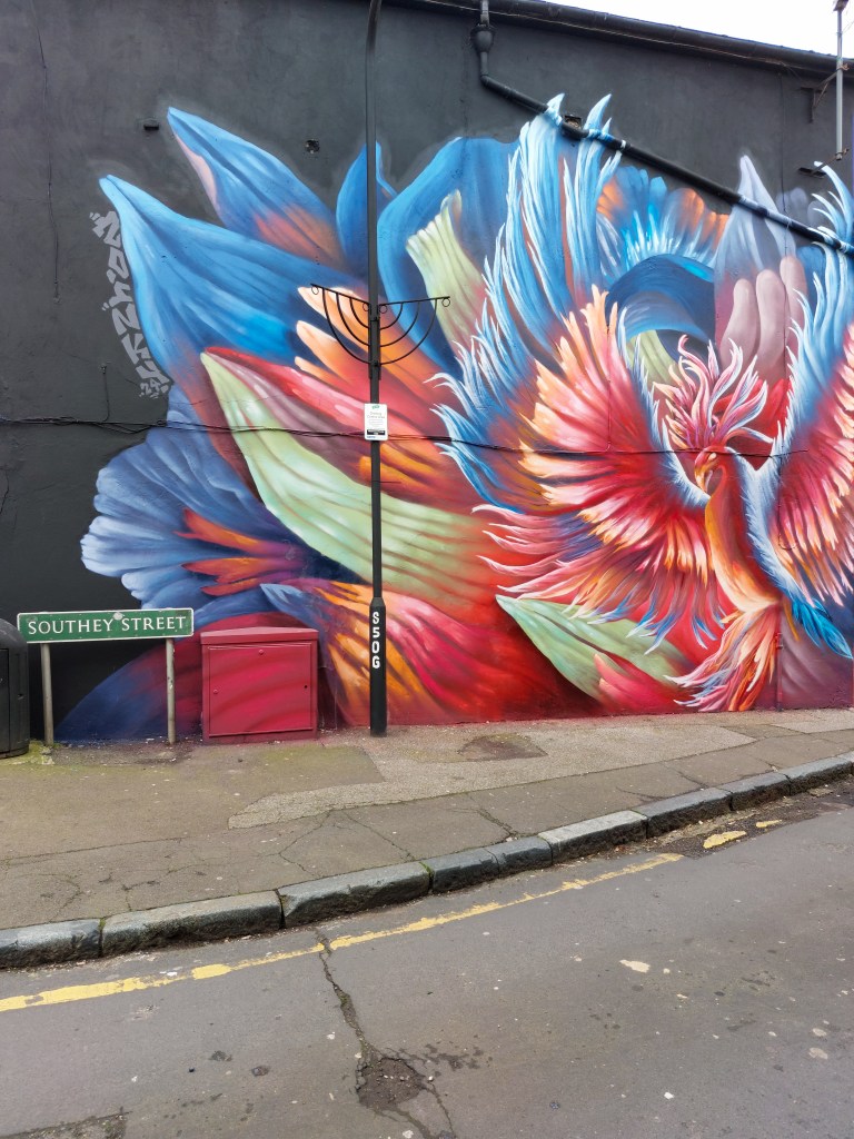 Work in Southey Street, at the heart of Penge’s High Street. This striking artwork featuring a series of flowers and a Phoenix in flight which is so full of life truly commands your attention upon passing it.