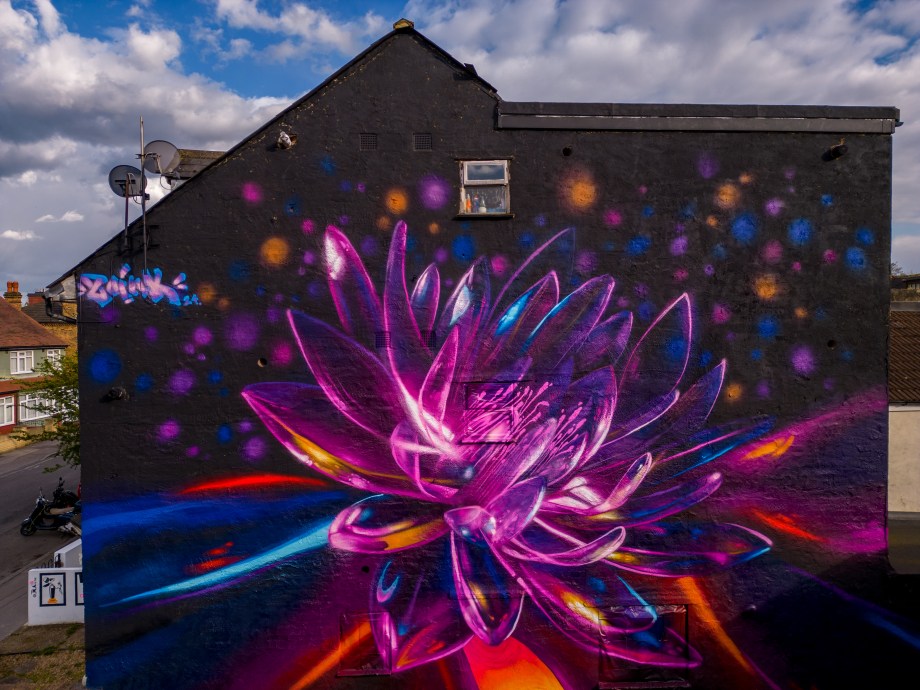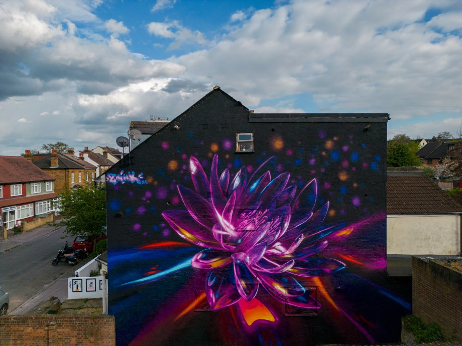 For our next blog post catching up with 2024, we are back in our corner of South-East London and looking at a pair of stunning largescale artworks from visiting Hawaiian artist and graffiti writer Zoinky, who spent a few months in London from late 2023 to early 2024. One of our favourite things about the scene is the continuous exposure to work from new artists, and it was an absolute pleasure to have this artist come to London and leave an array of diverse subjects – abstract, dreamlike realism and letter works – all imbued with his distinct style and striking purple and blue heavy colour palette. For this pair of works – presenting two out of three large scale works the artist painting in London, with the other being in Hackney Wick – Zoinky painted two floral inspired compositions piece which were both rich in textures and colours. Whilst both of the works below are exceptional, the one in Padua Road is our favourite of the two. This superb pair of works were placed with support from ourselves London Calling Blog for our SprayExhibition20 community mural project in SE20.